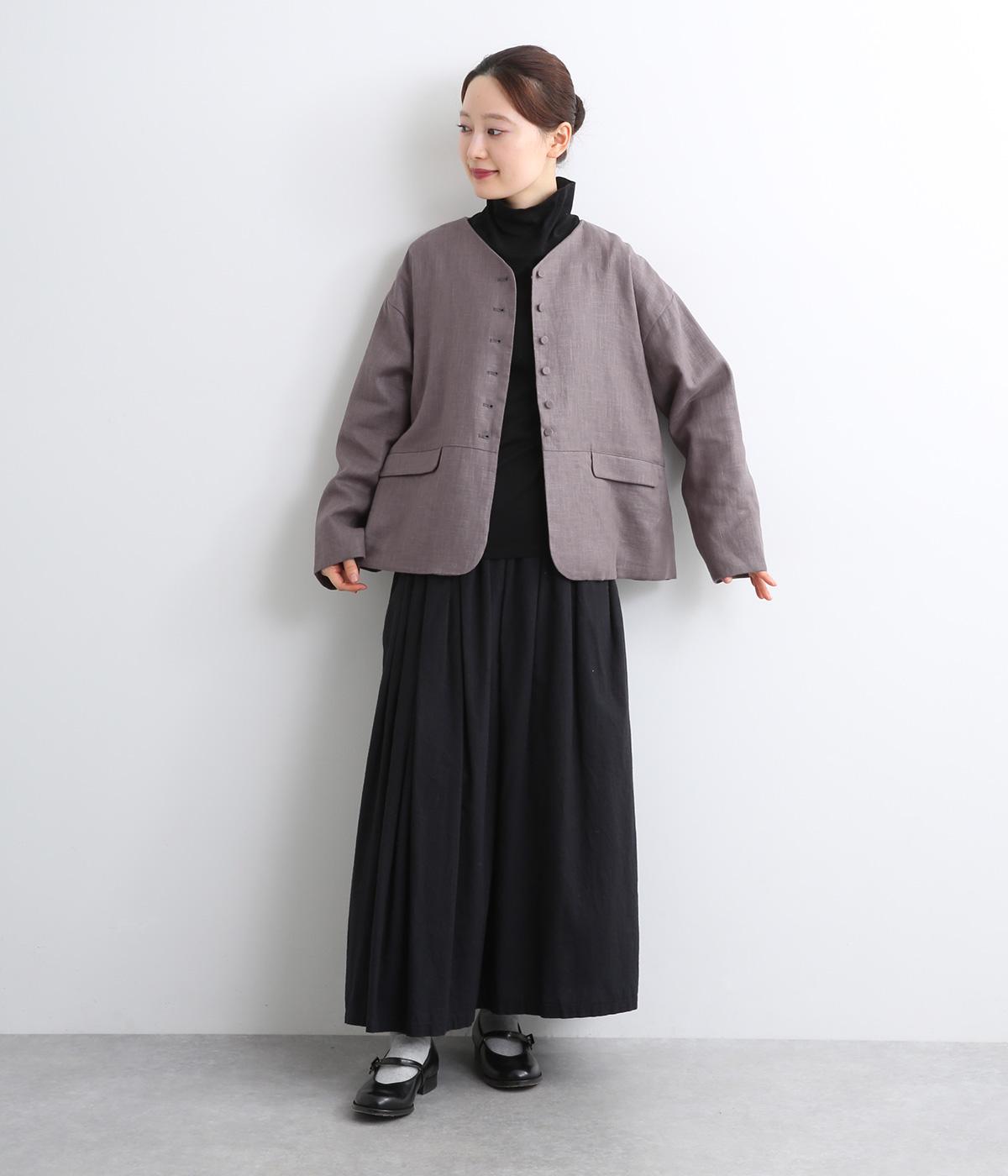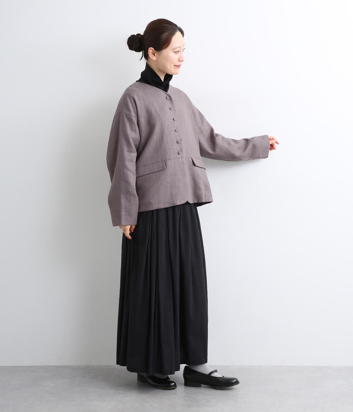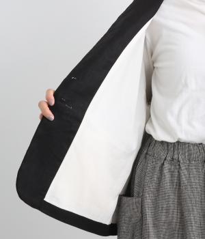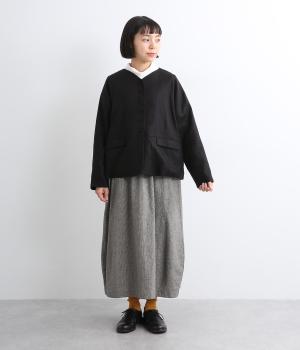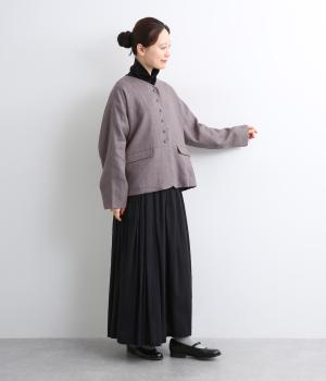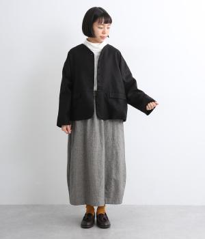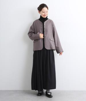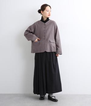 くるみボタンがかわいらしさを添えたジャケット。ノーカラーですっきりとした首元で、重ね着もしやすく、パンツにもスカートにも合わせやすい一枚。同素材のスカートとセットアップでの着こなしもおすすめです。