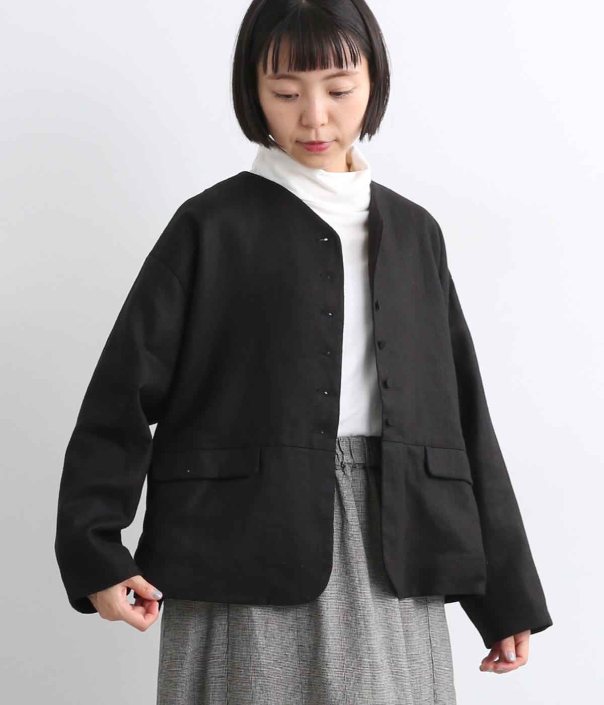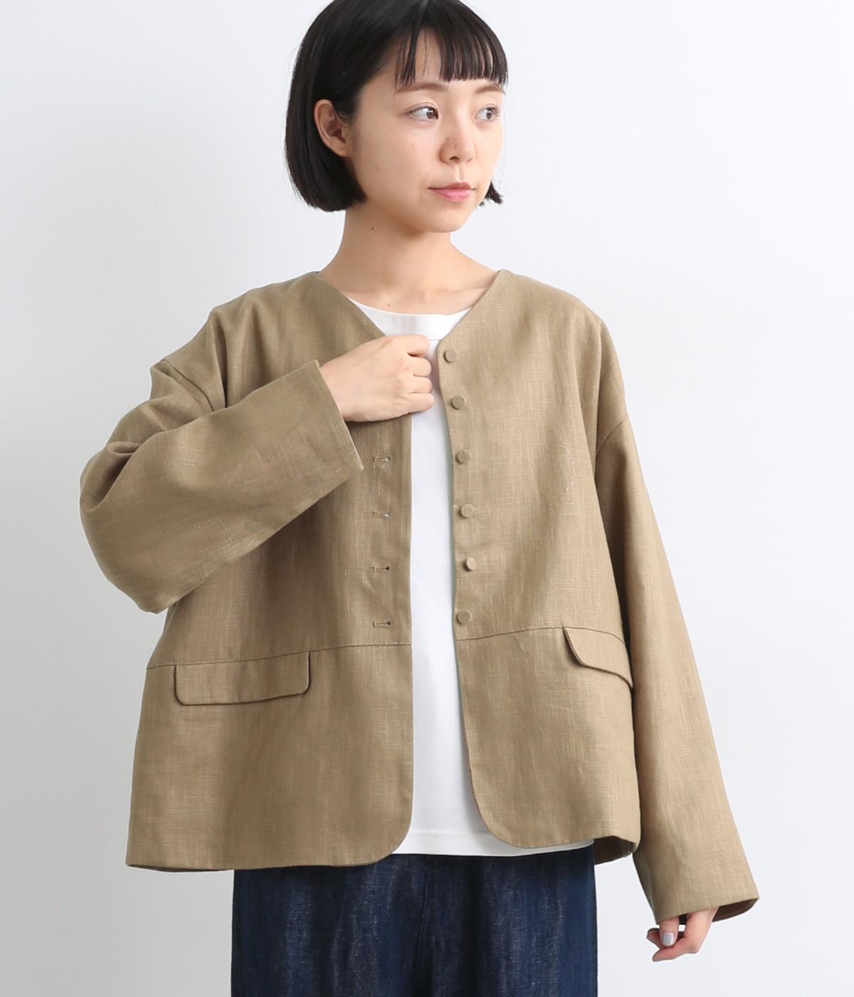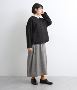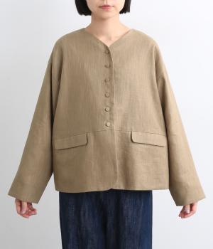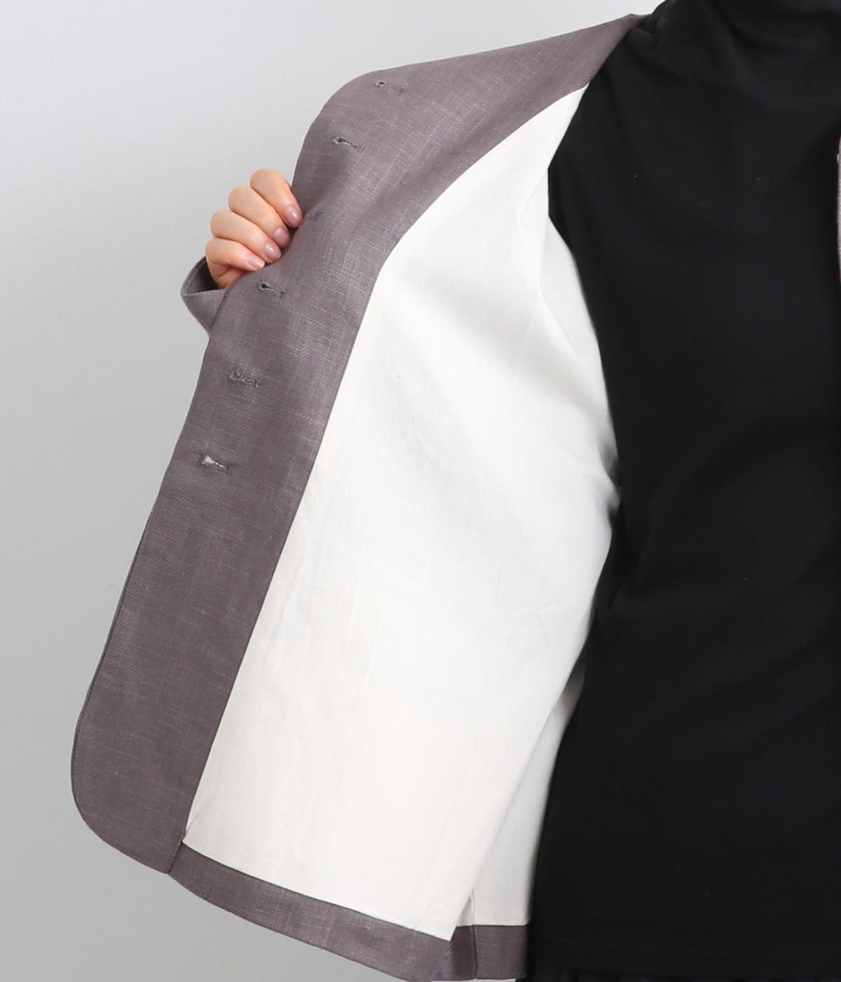 くるみボタンがかわいらしさを添えたジャケット。ノーカラーですっきりとした首元で、重ね着もしやすく、パンツにもスカートにも合わせやすい一枚。同素材のスカートとセットアップでの着こなしもおすすめです。