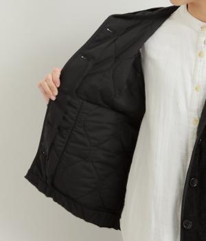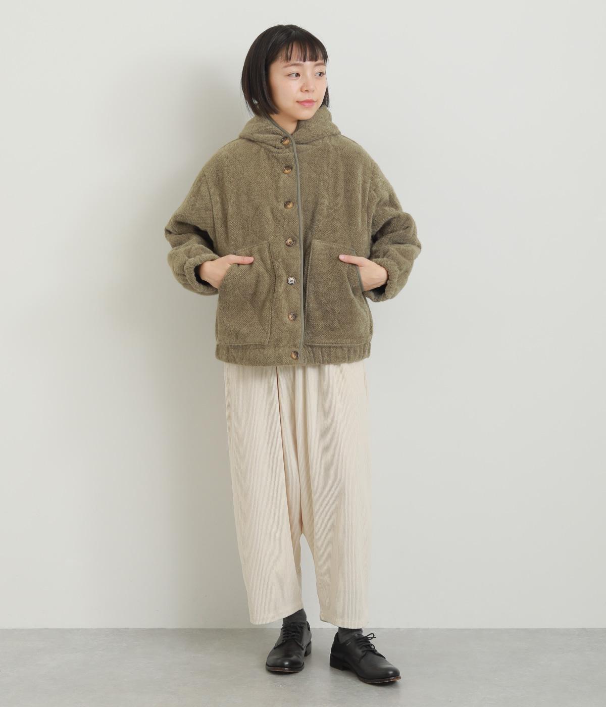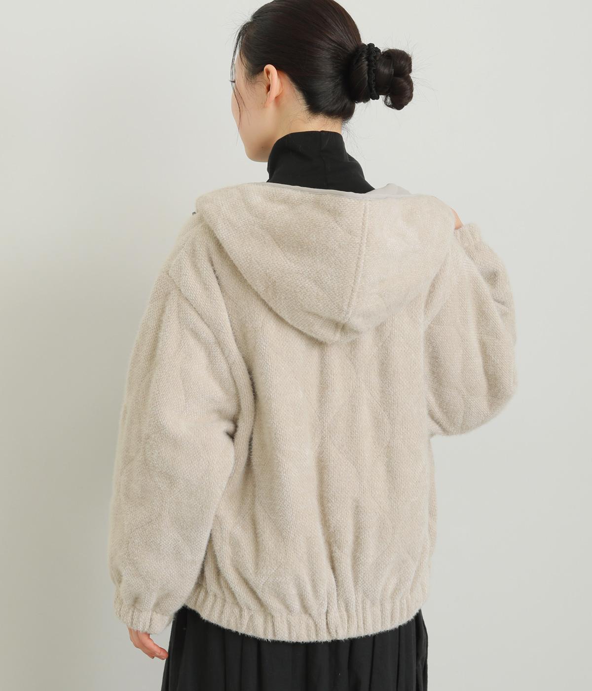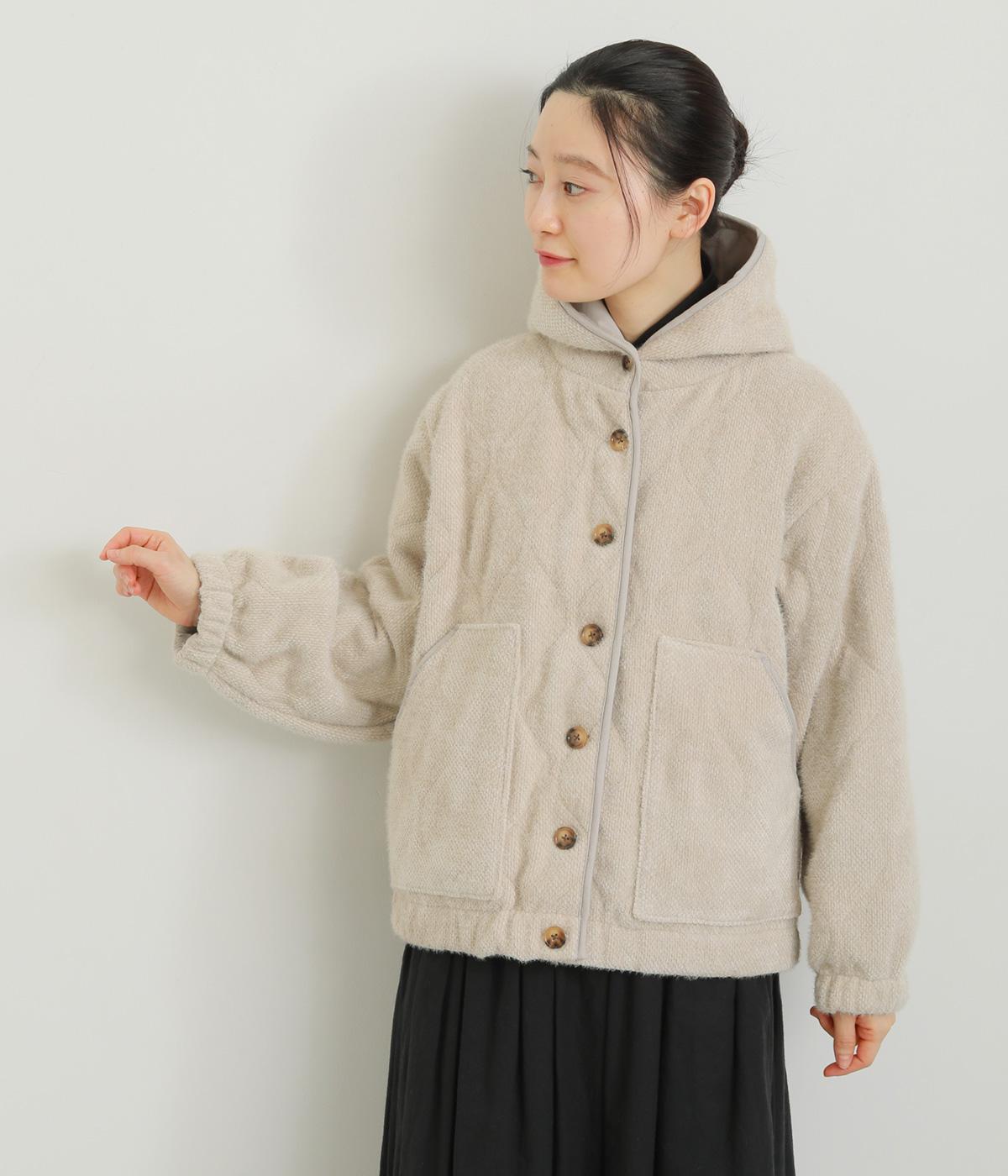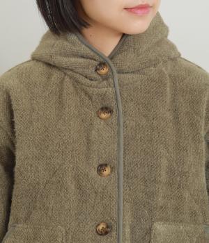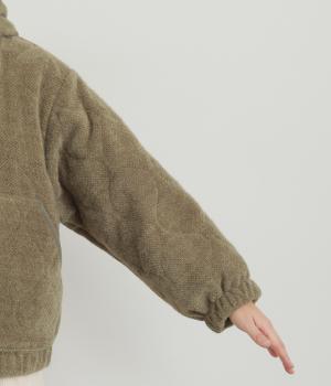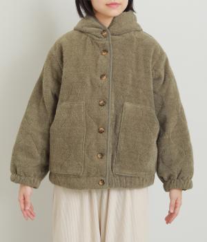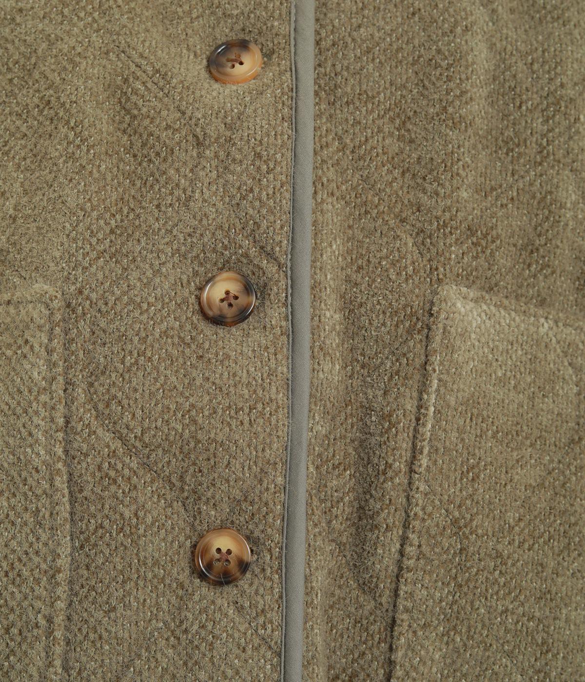 ベロアのような起毛感がリッチな表情をもち、ひょうたん柄のキルティングで適度にカジュアルダウンさせました。肌にあたる裏面は綿混のさらっとした素材感で袖の通りもスムーズ。