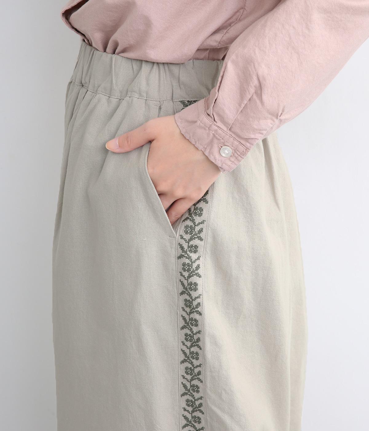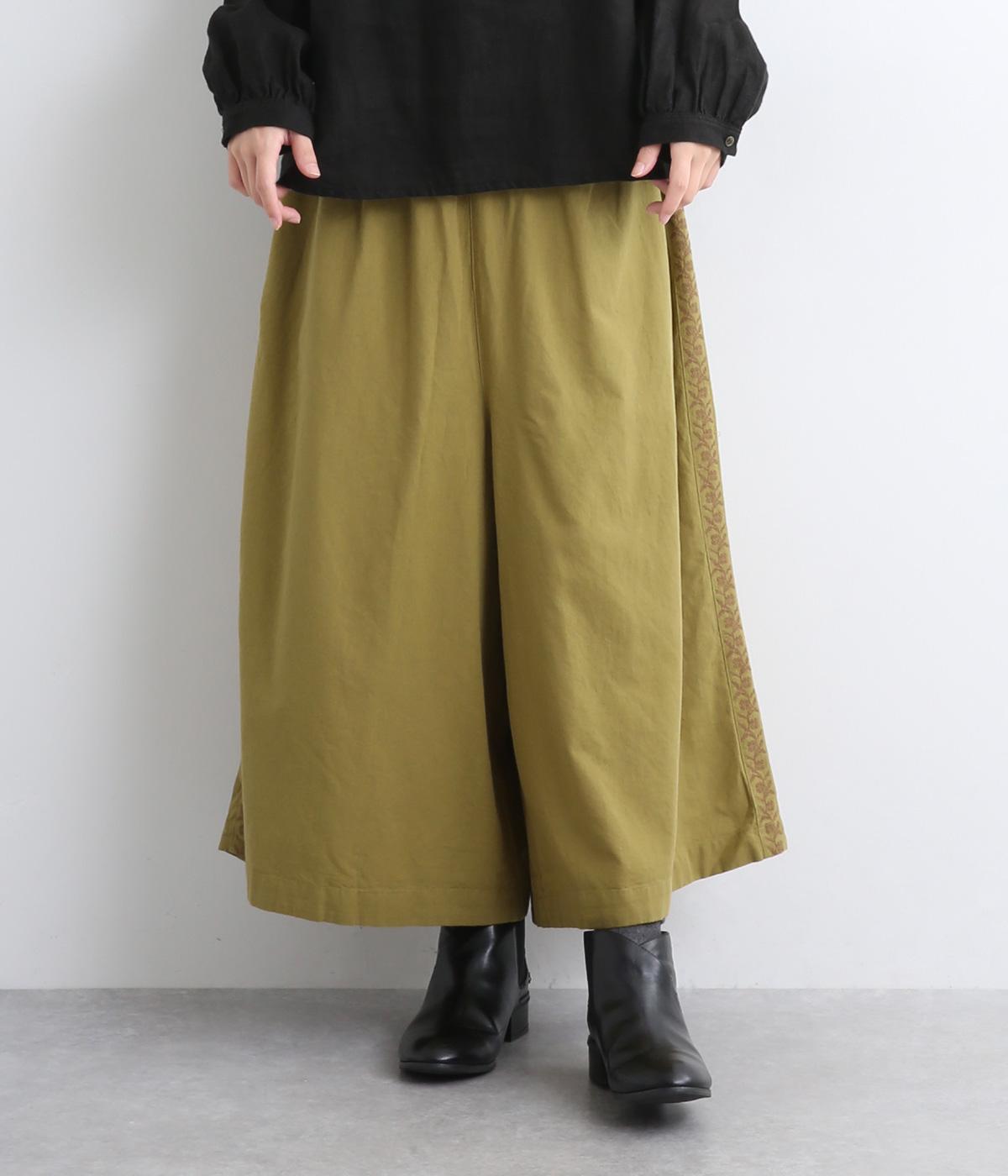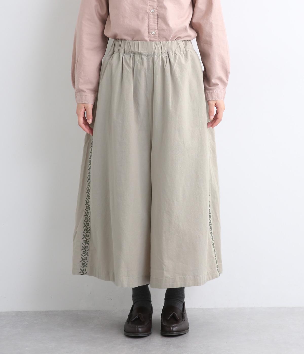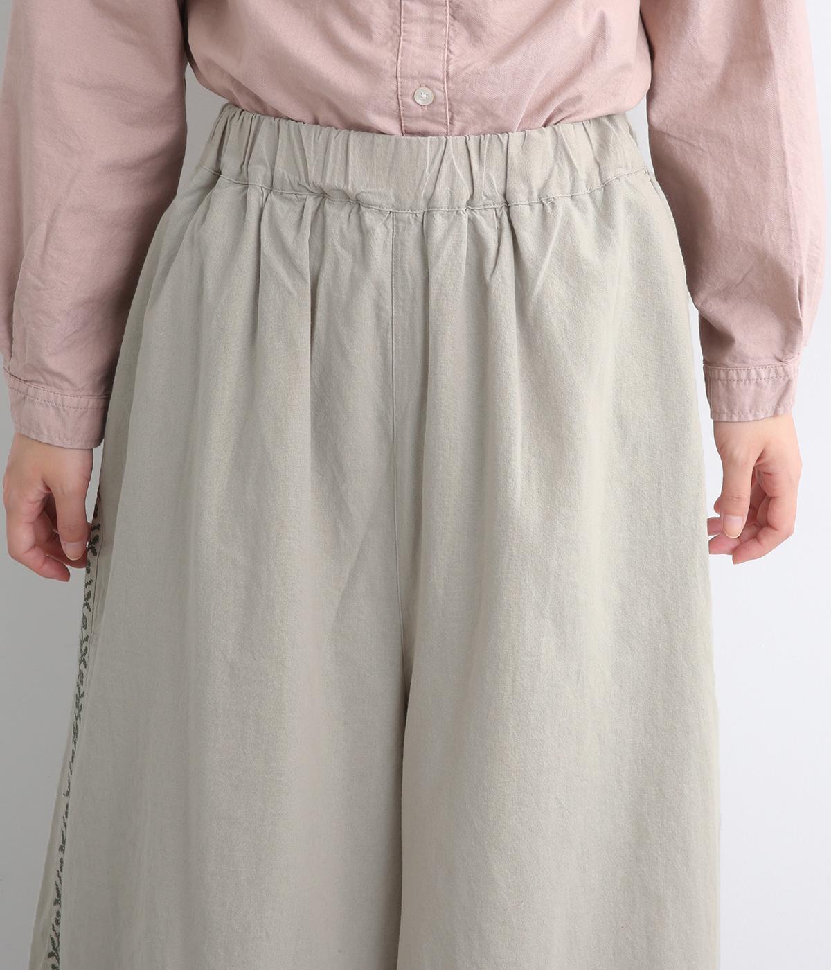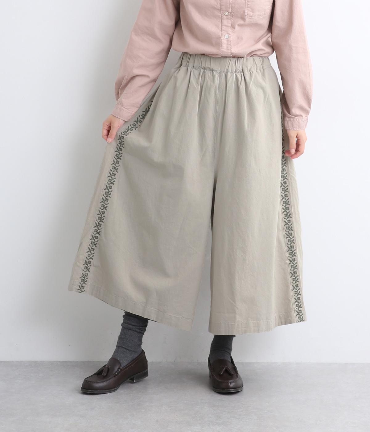 スカート見えするゆったりとしたガウチョシルエットに、両サイドの花柄刺しゅうでアクセントをつけました。ウエストはフィット感のあるオール太ゴムで負担を軽減。内紐入りで微調整も可能です。