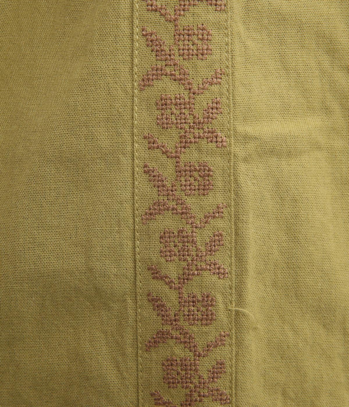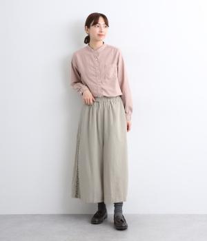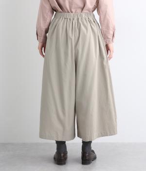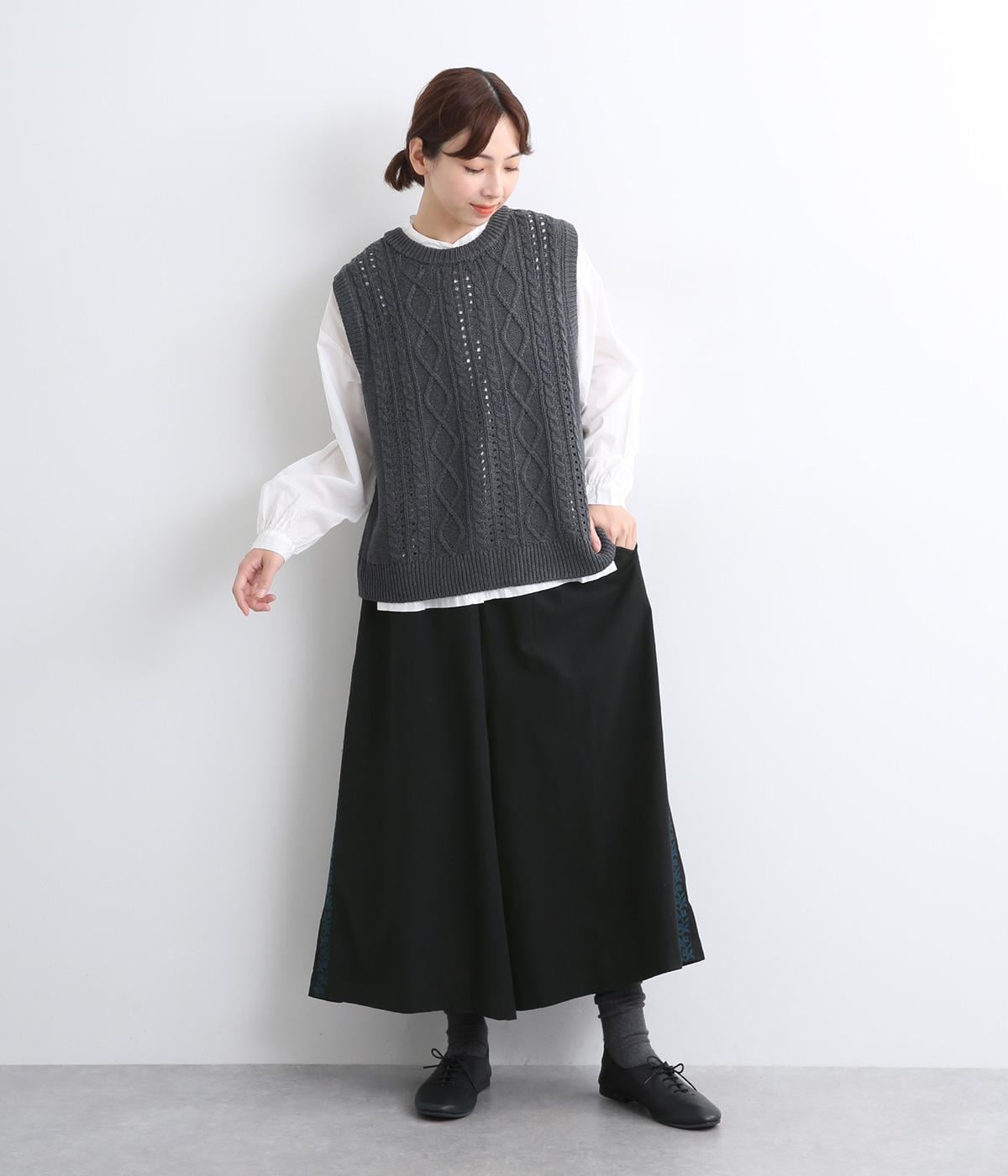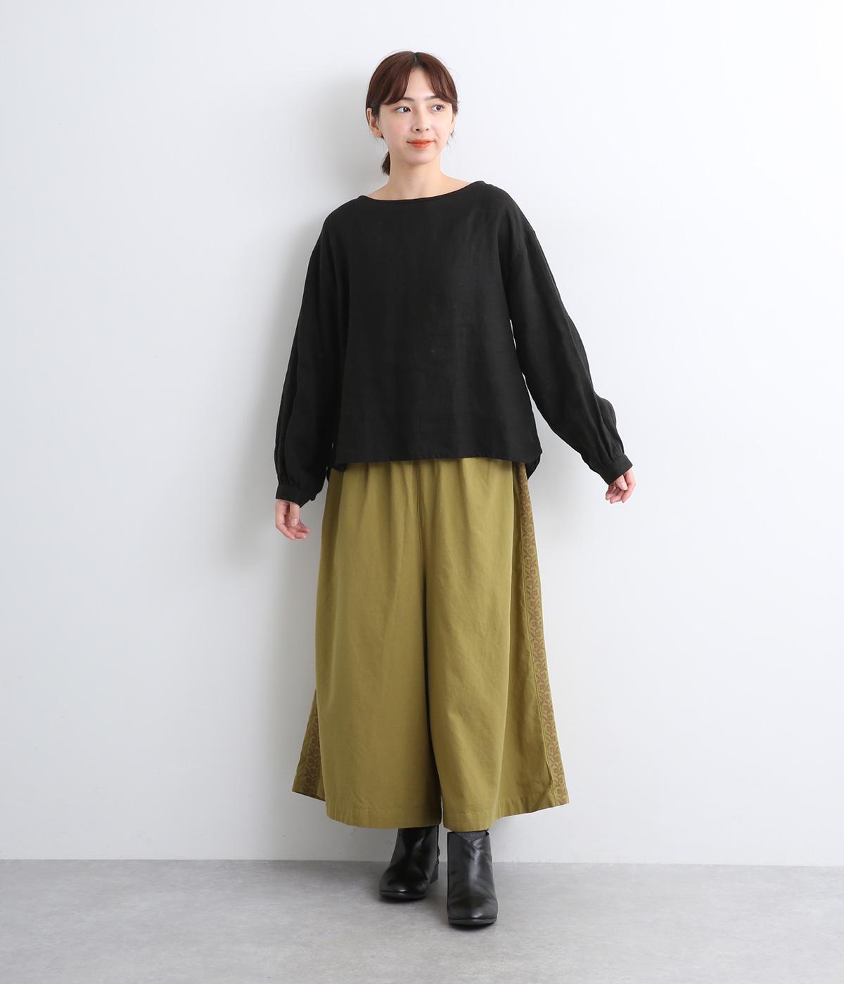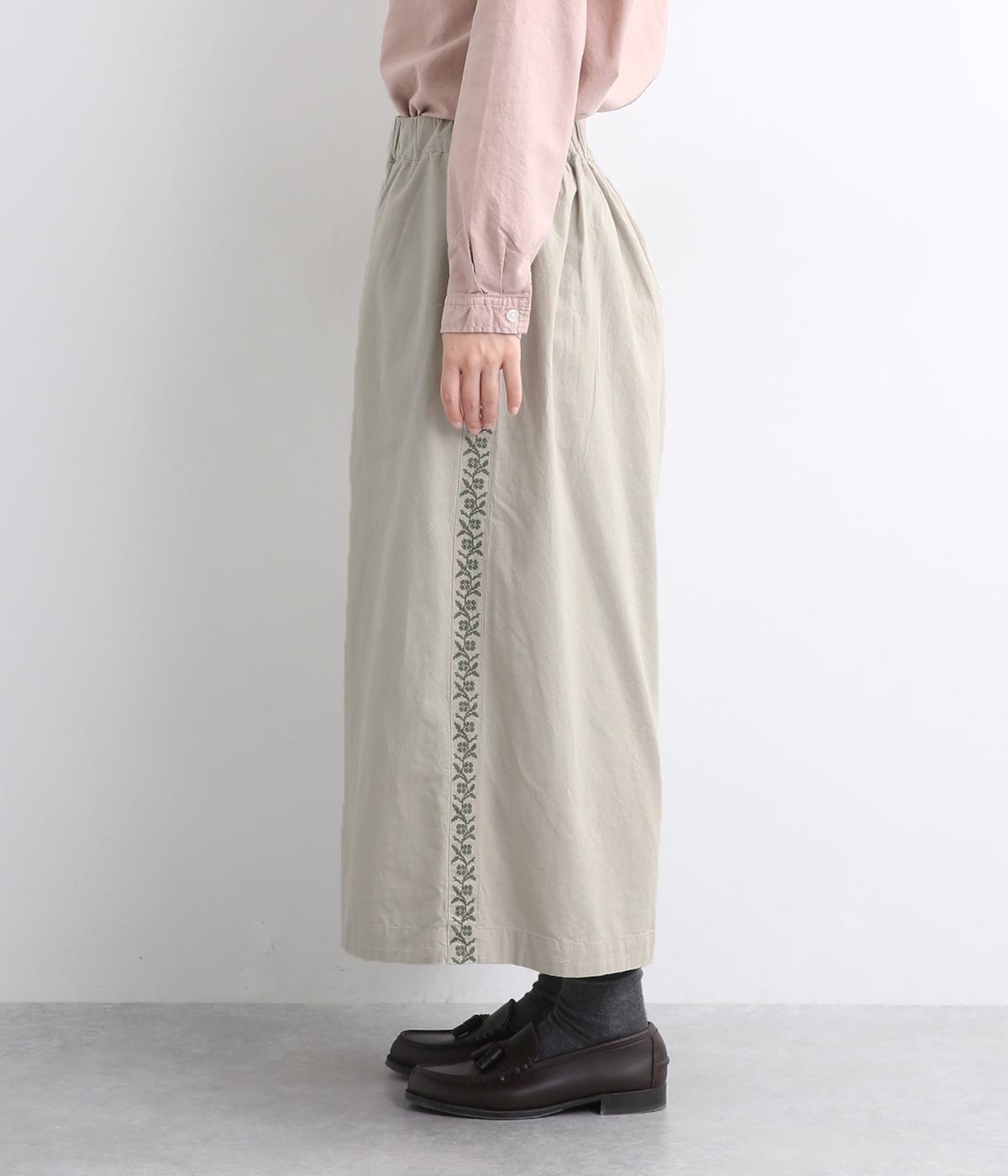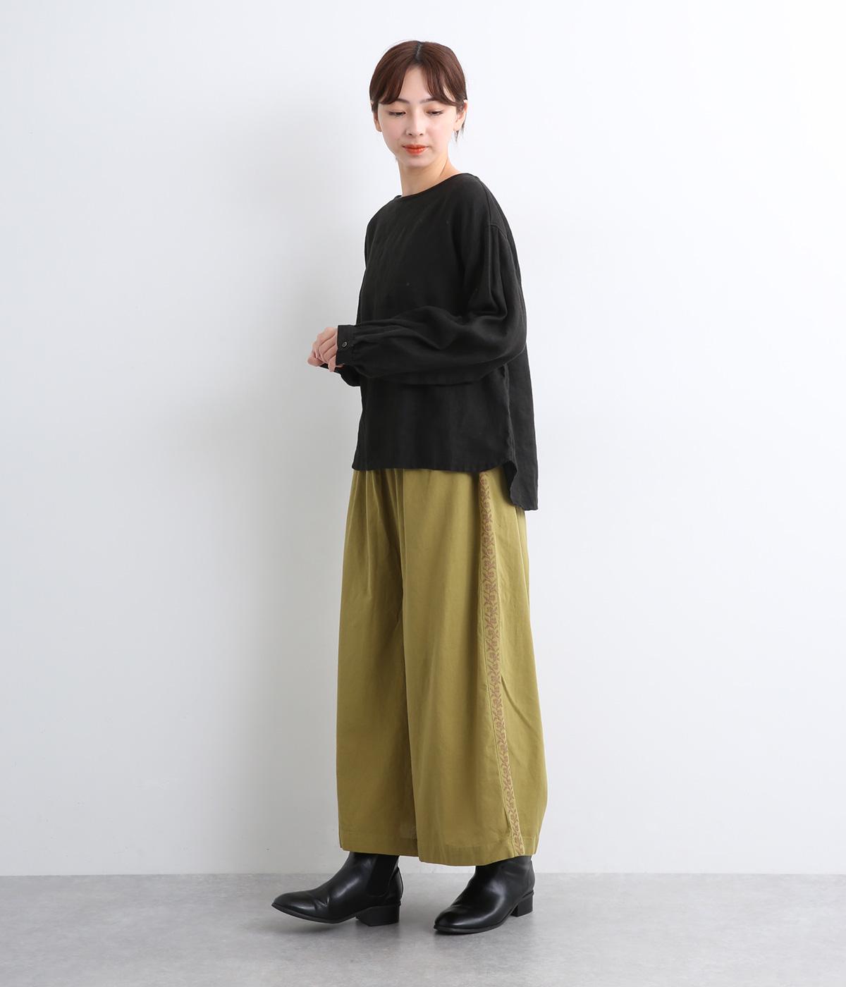 スカート見えするゆったりとしたガウチョシルエットに、両サイドの花柄刺しゅうでアクセントをつけました。ウエストはフィット感のあるオール太ゴムで負担を軽減。内紐入りで微調整も可能です。