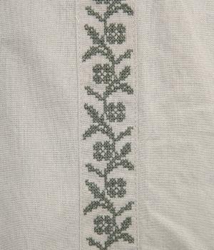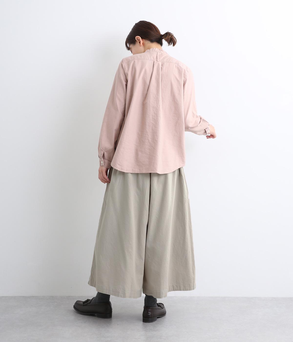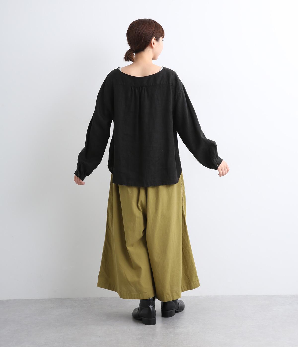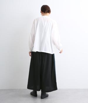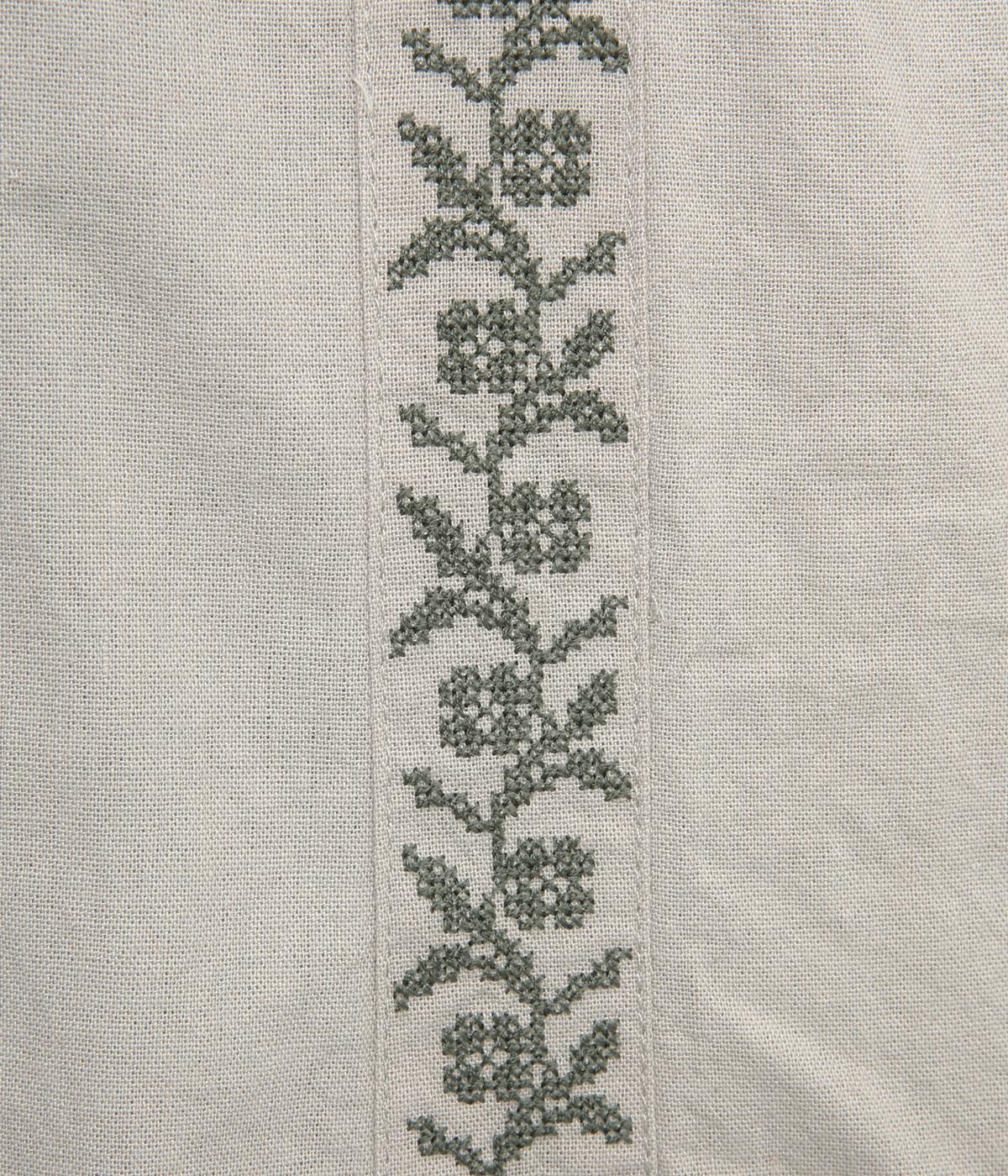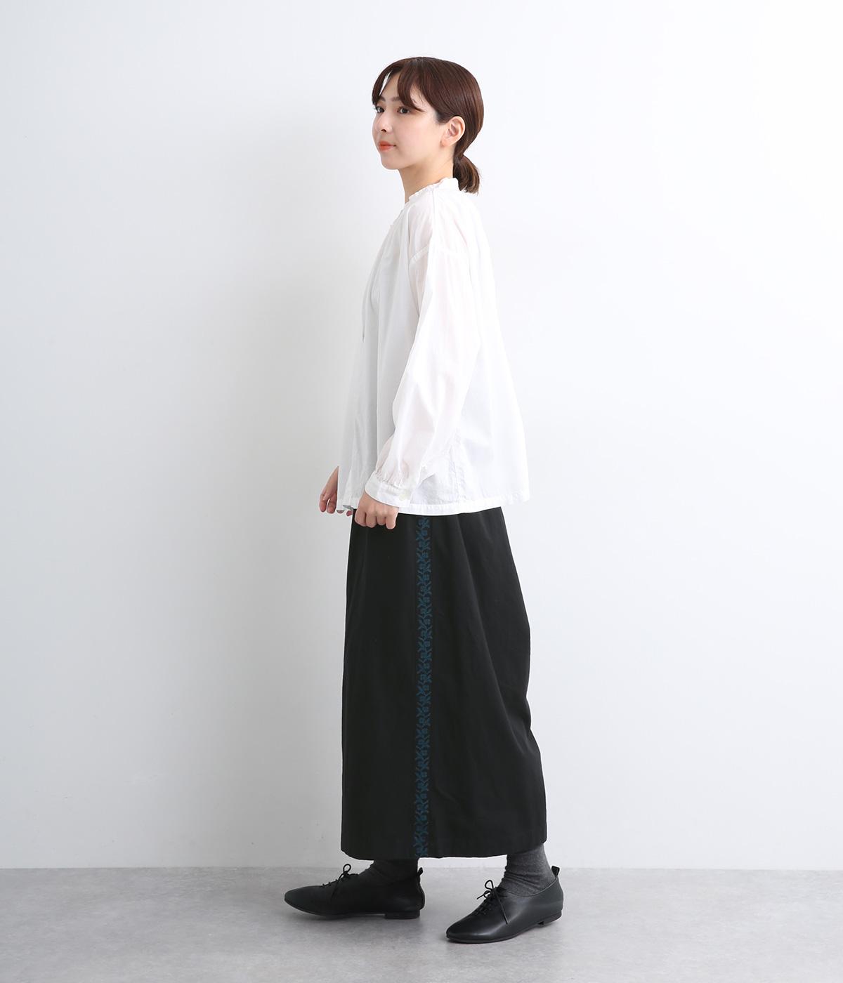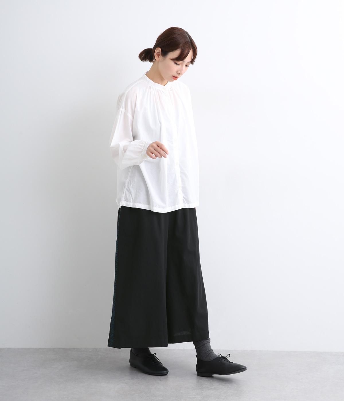 スカート見えするゆったりとしたガウチョシルエットに、両サイドの花柄刺しゅうでアクセントをつけました。ウエストはフィット感のあるオール太ゴムで負担を軽減。内紐入りで微調整も可能です。
