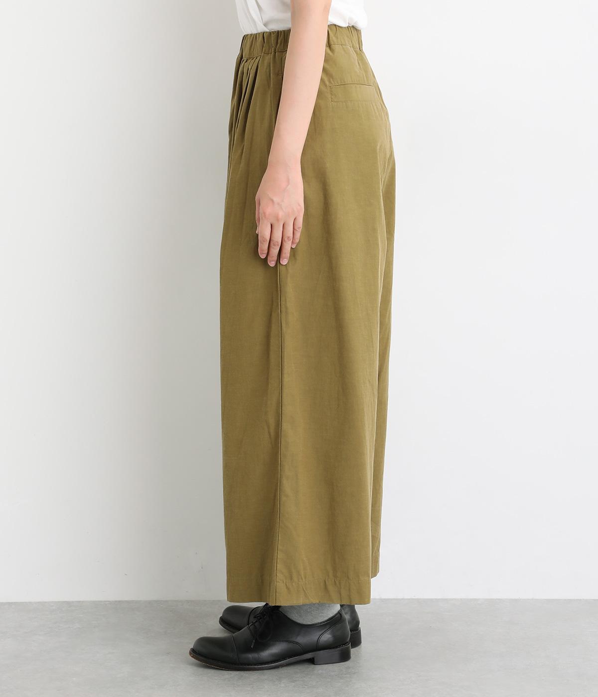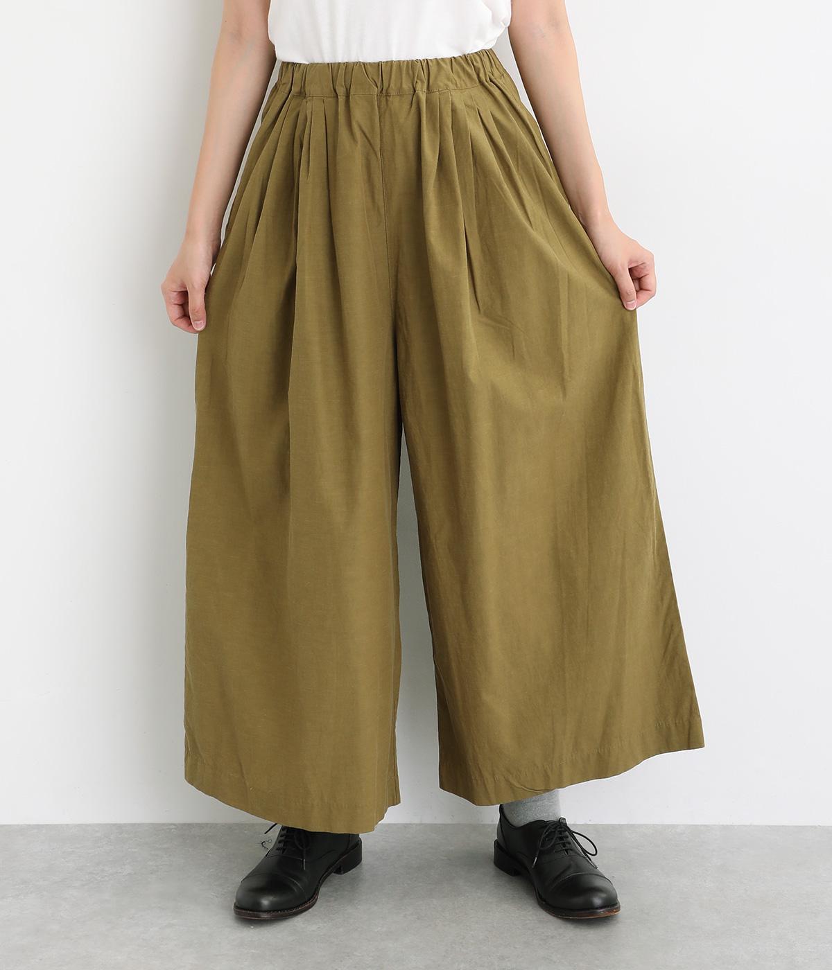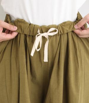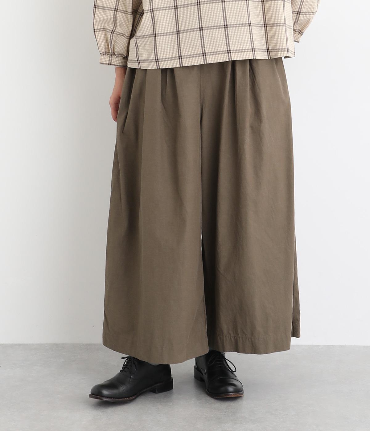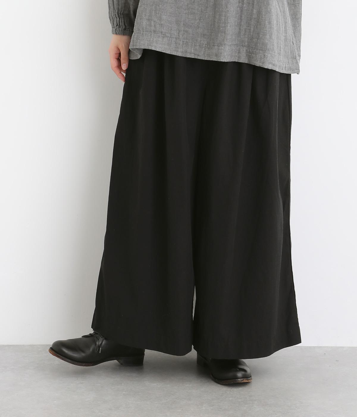 スカート見えするゆったりとしたワイドパンツです。薄めの軽やかな作りなのではきこなしやすく、それでいて雰囲気のいい生地感でスタイリングに存在感を与えてくれます。ウエスト総ゴムでデイリー使いしやすく、内紐で微調整も可能です。