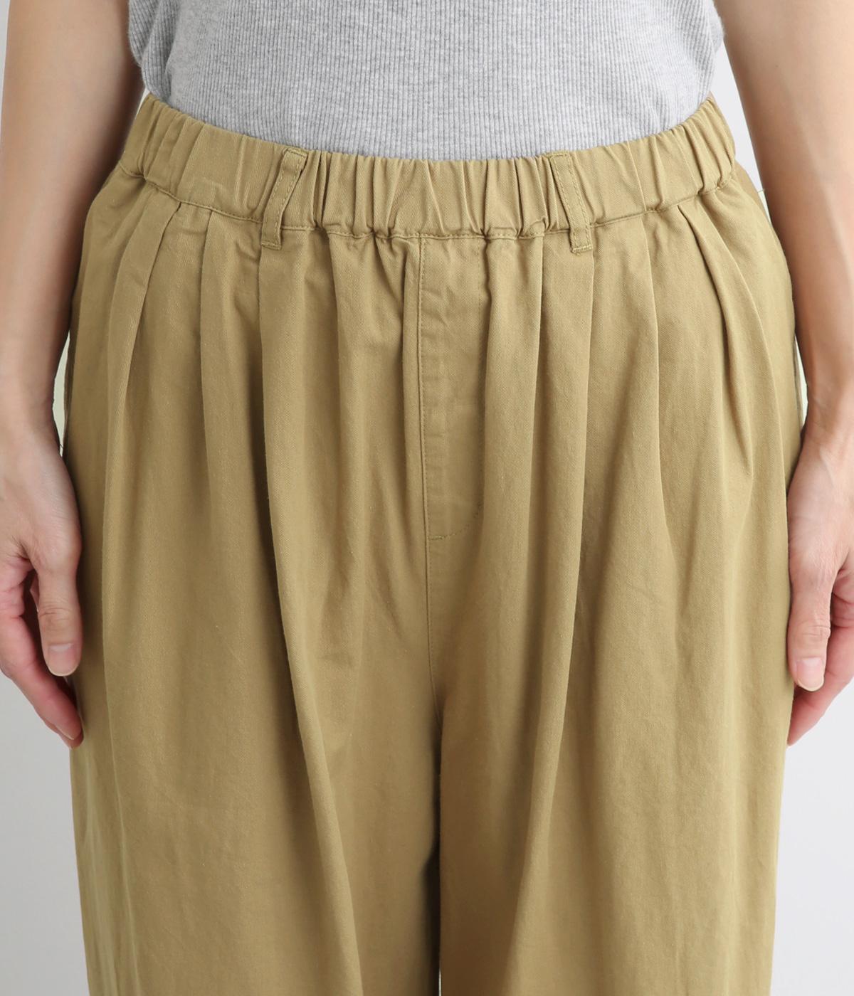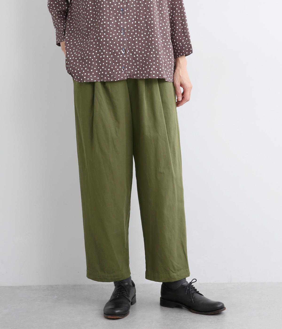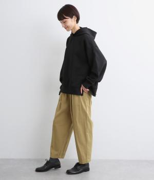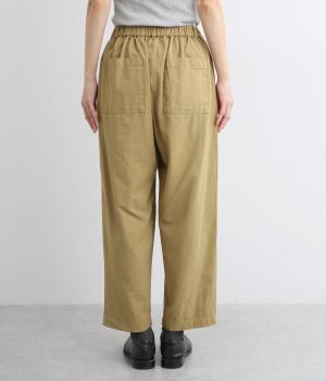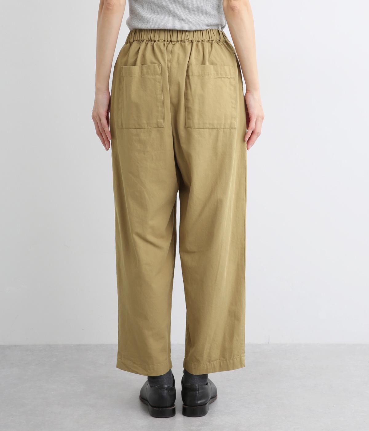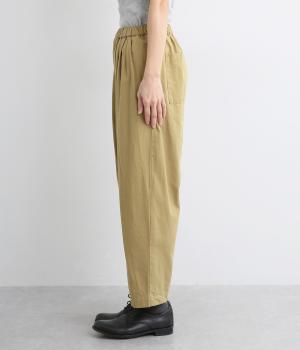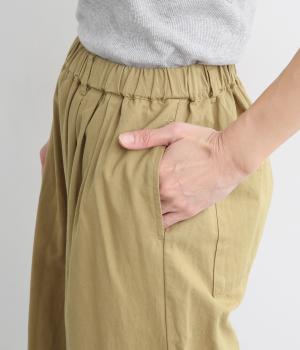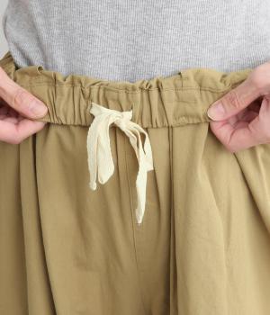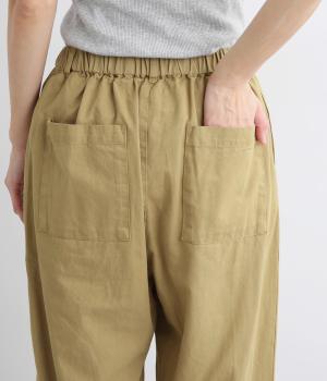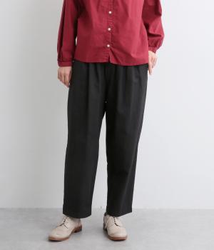 ウエストまわりにギャザーとタックをたっぷりと入れたテーパードパンツ。フロントのドレープと後ろの大きめのポケットが、気になる腰やヒップのラインをカモフラージュしてくれます。総ゴム仕様のウエストには内紐をプラスしてフィット感をアップさせました。