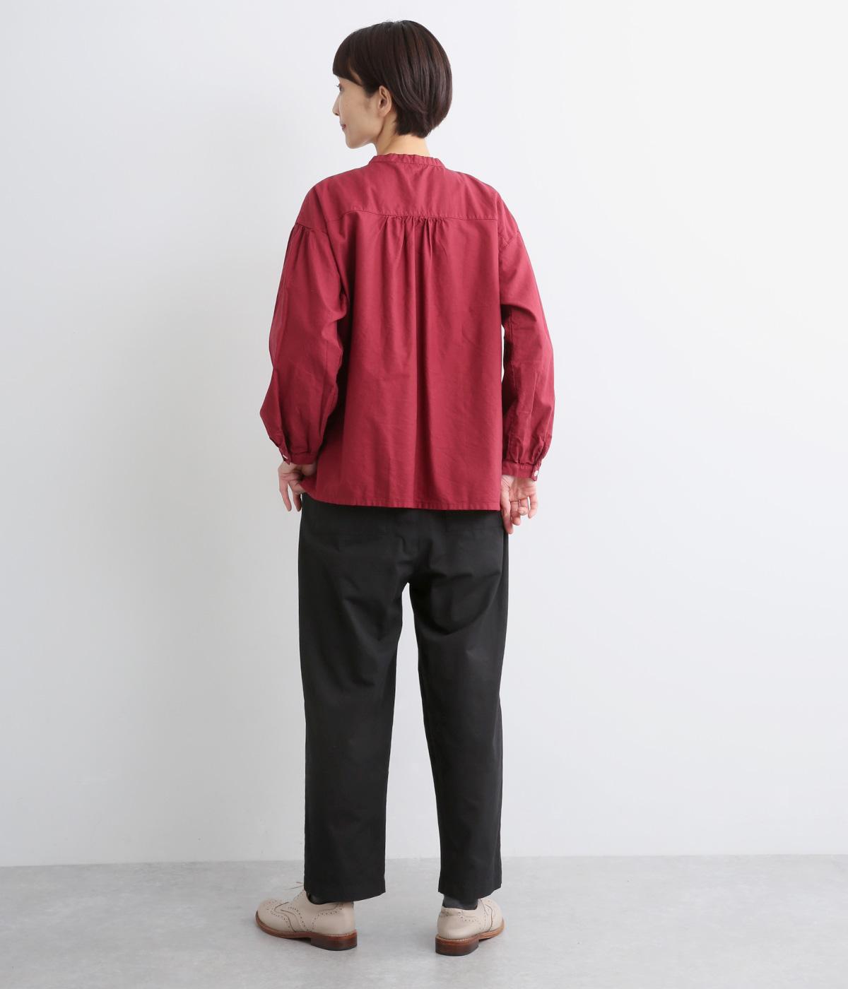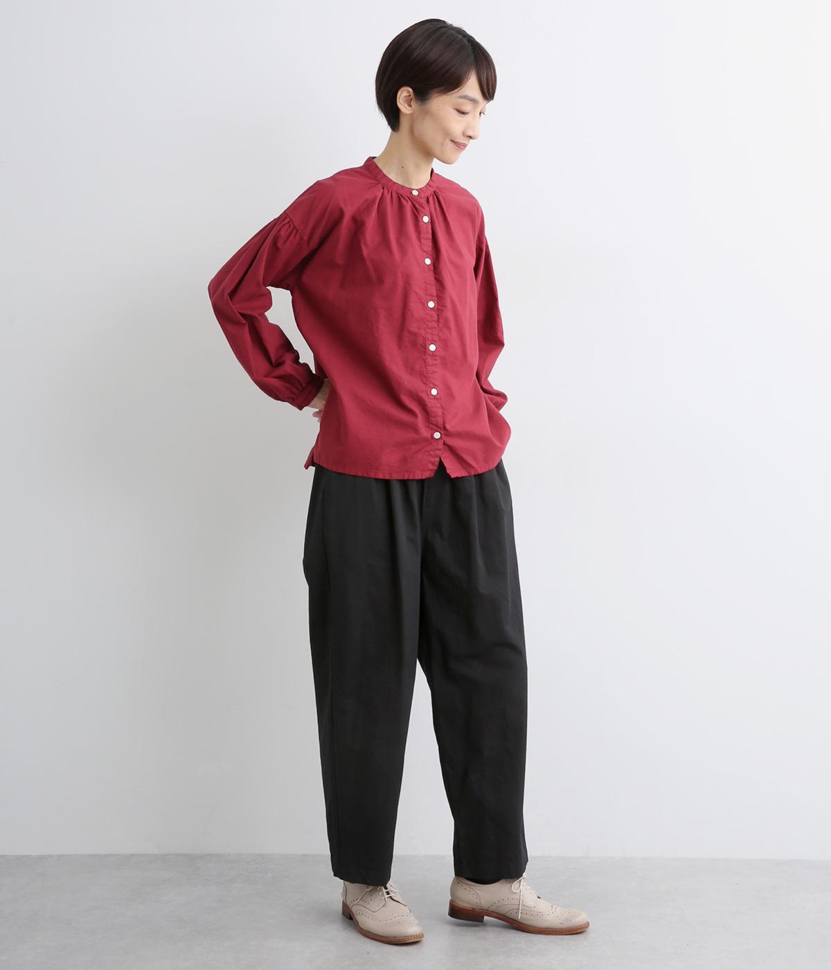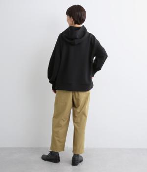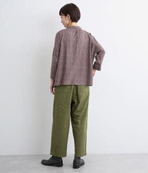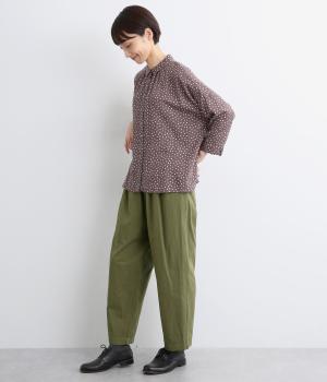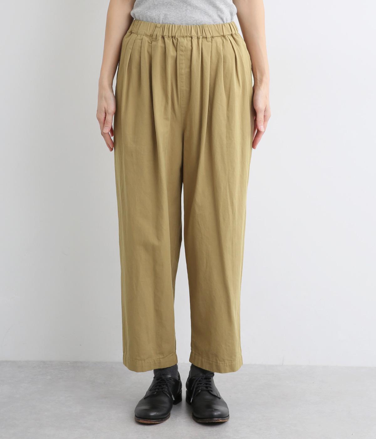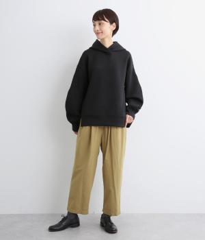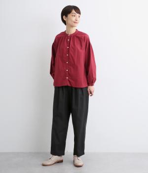 ウエストまわりにギャザーとタックをたっぷりと入れたテーパードパンツ。フロントのドレープと後ろの大きめのポケットが、気になる腰やヒップのラインをカモフラージュしてくれます。総ゴム仕様のウエストには内紐をプラスしてフィット感をアップさせました。