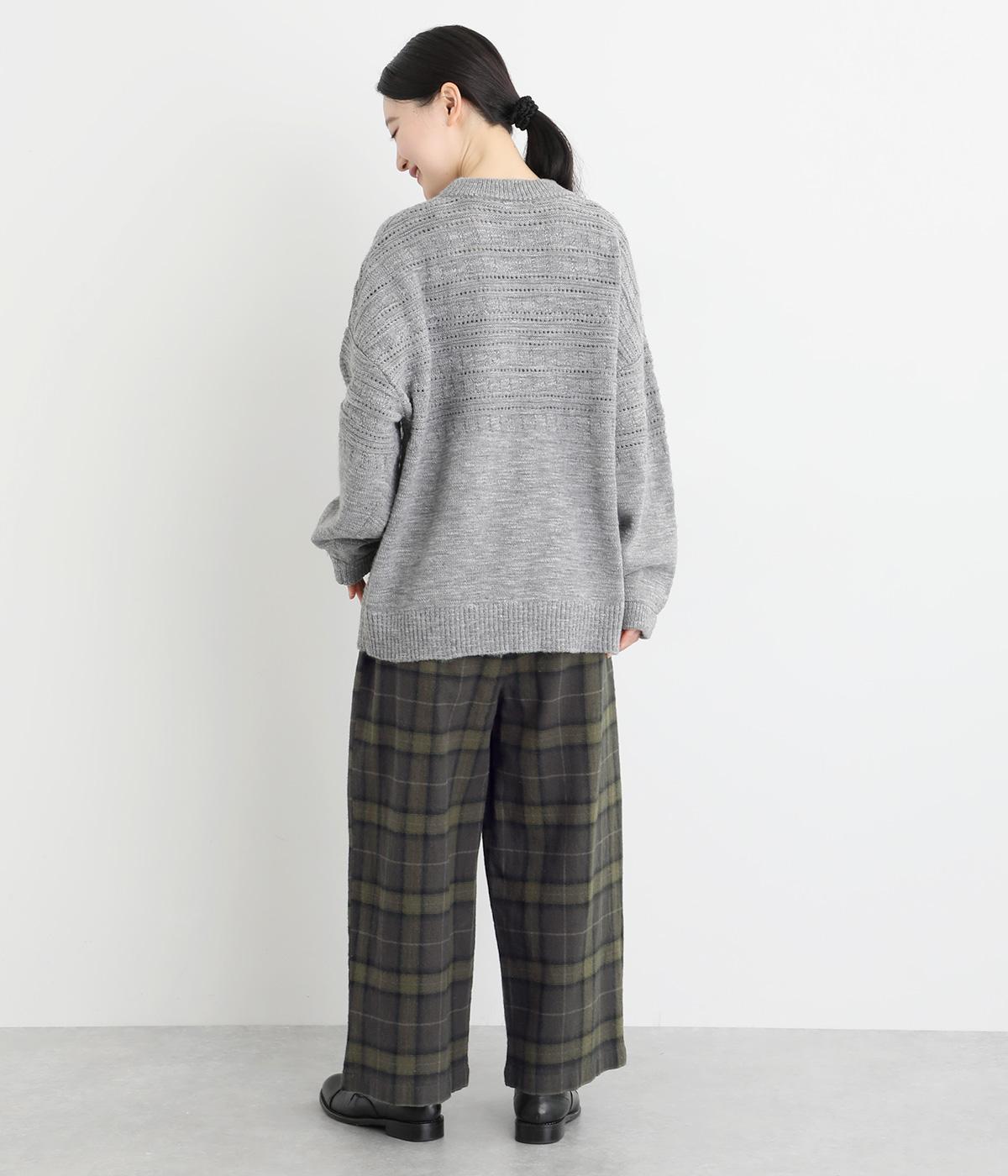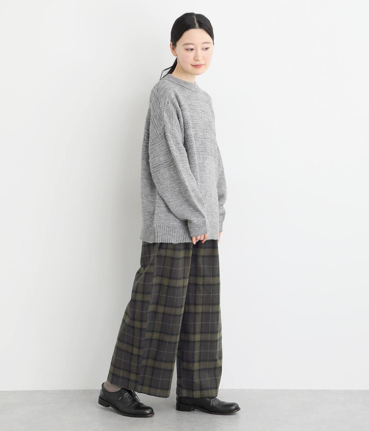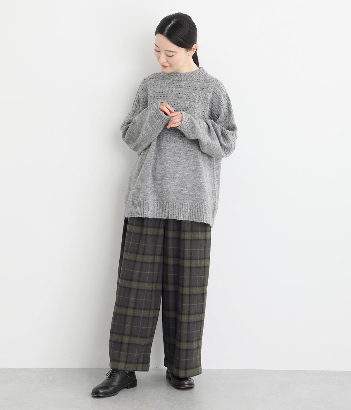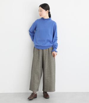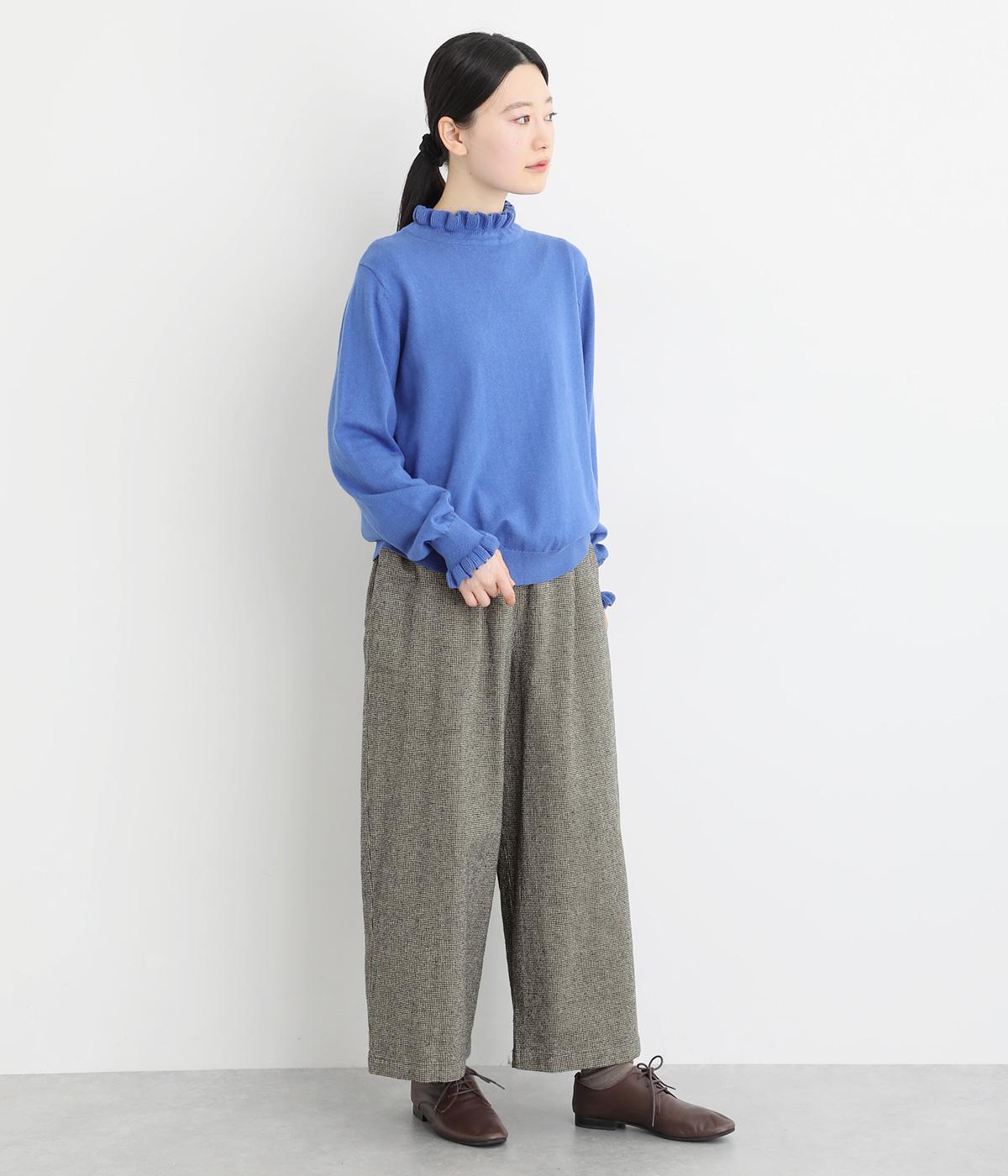 ウエストまわりにはタックを入れ、腰まわりをゆったりとつつむリラックス感のあるデザインです。深めの股上で安心感があり、裾に向かってストンと落ちるストレートシルエットが上品な印象をあたえます。ウエストは総ゴム仕様で、デイリーに使いやすい一本です。