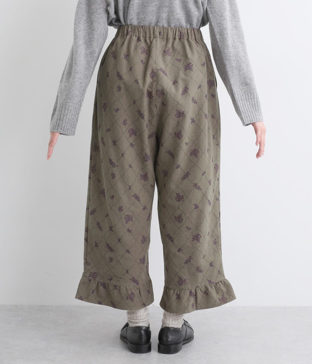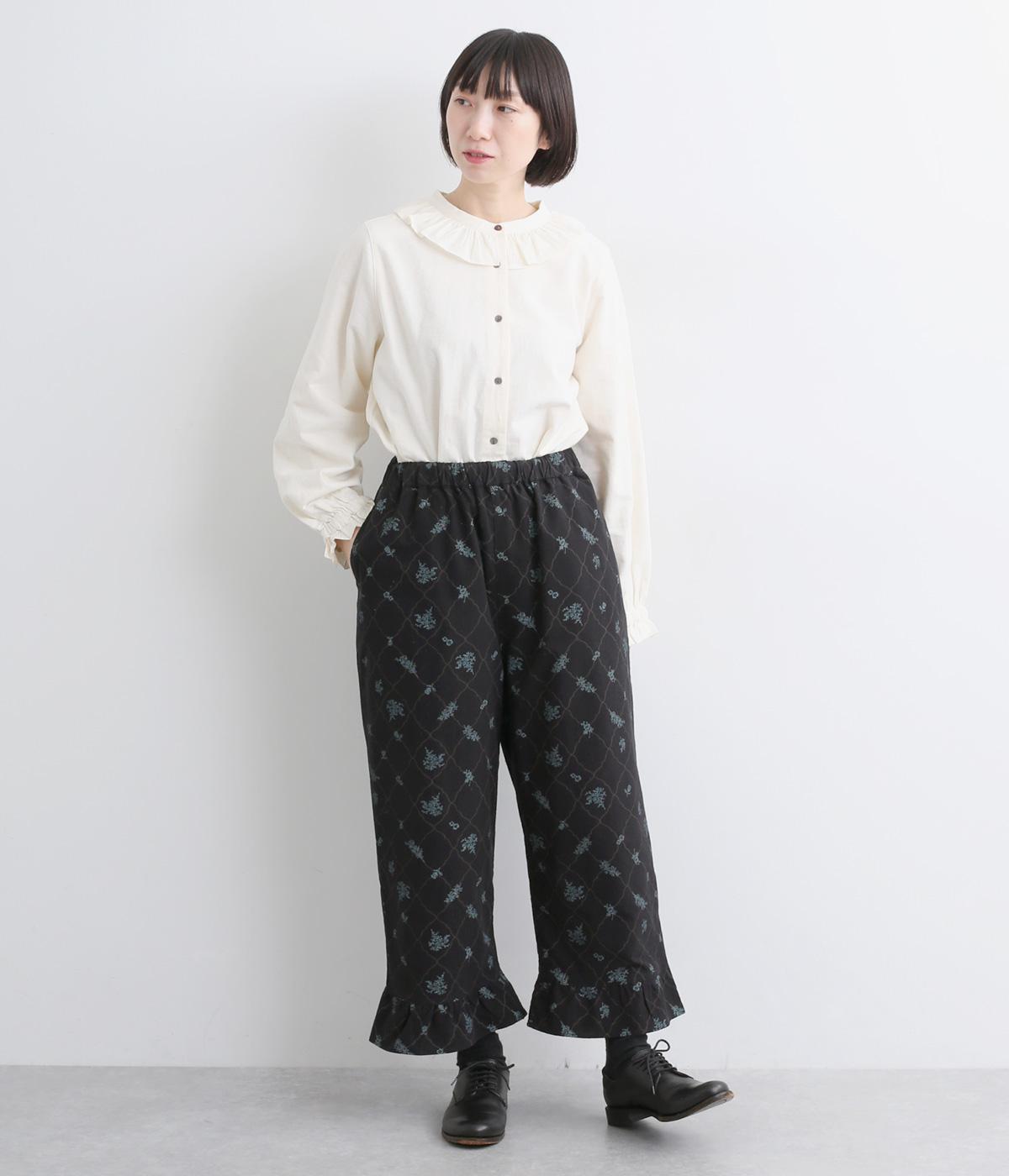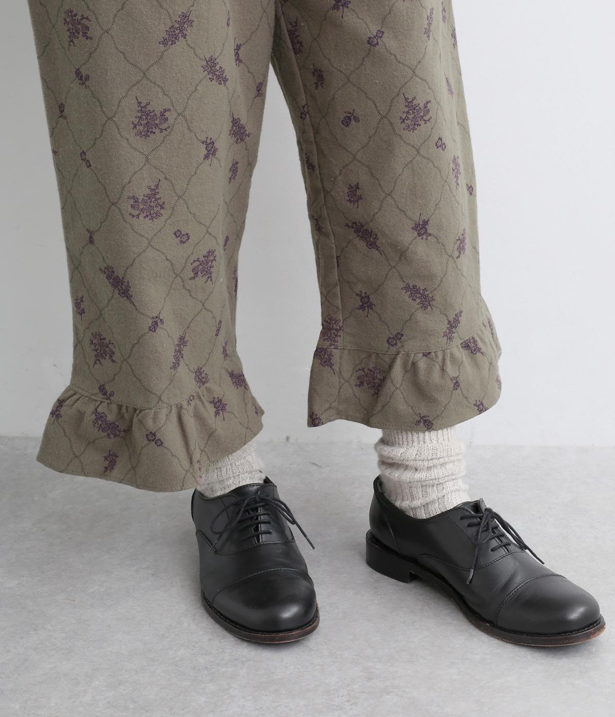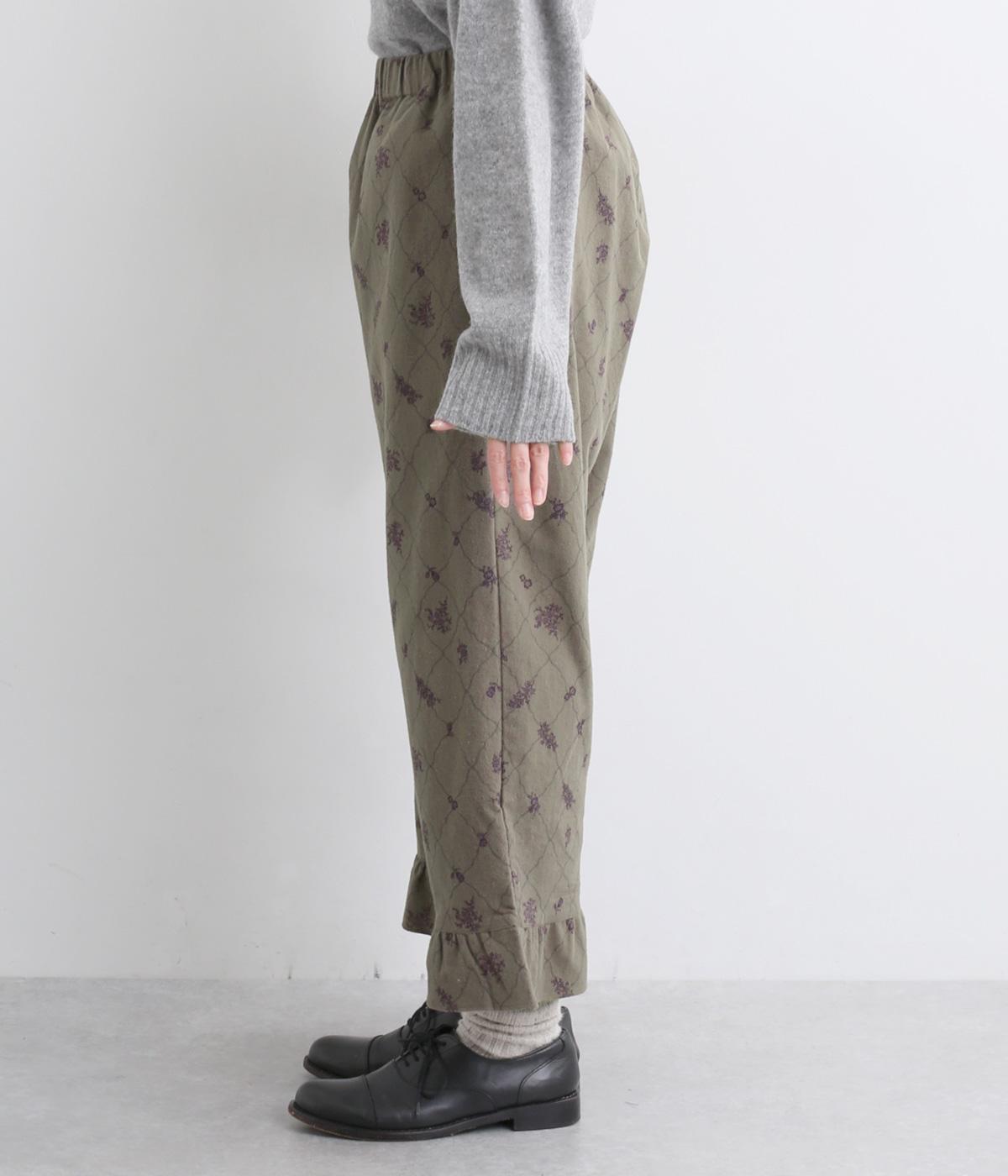 裾フリルが個性を放つパンツです。レトロな雰囲気の総柄プリントが落ち着いた表情に仕上げています。ウエストゴムデザインでストレスフリーな穿き心地。トップスインでもアウトでもサマになります。