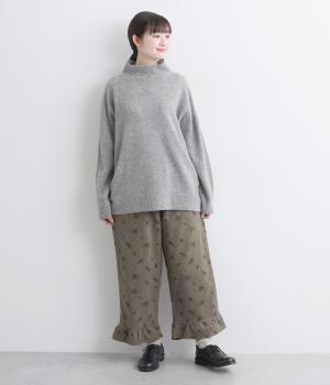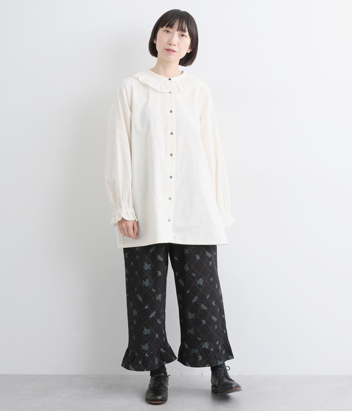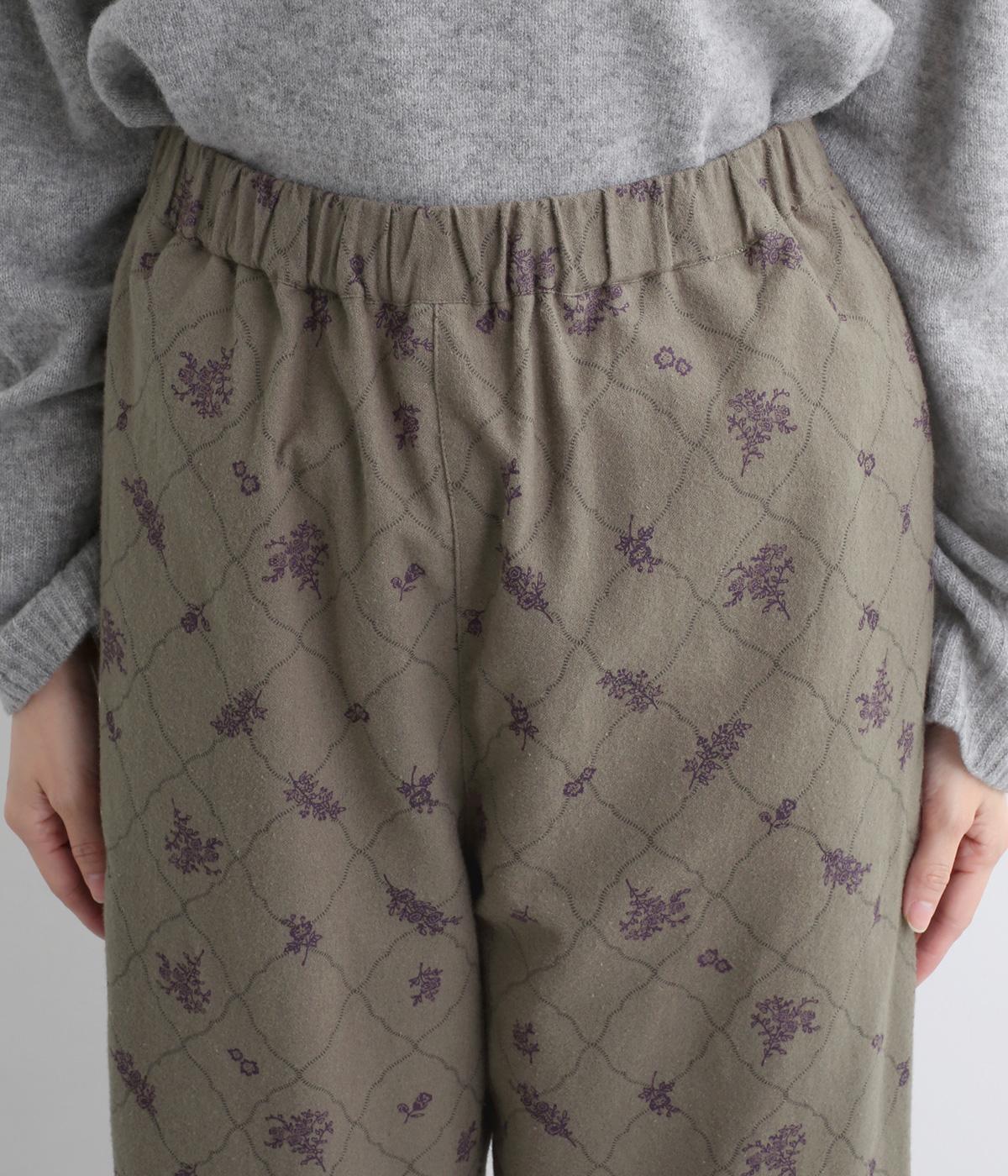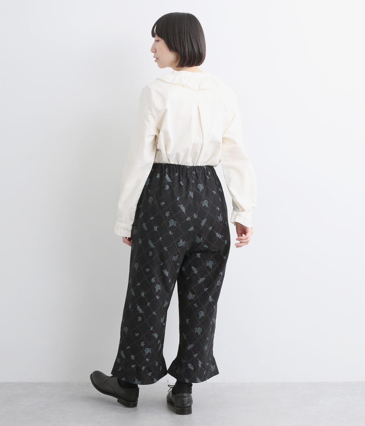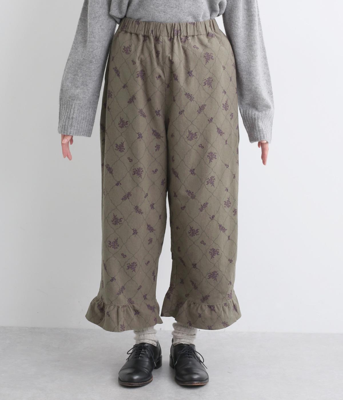 裾フリルが個性を放つパンツです。レトロな雰囲気の総柄プリントが落ち着いた表情に仕上げています。ウエストゴムデザインでストレスフリーな穿き心地。トップスインでもアウトでもサマになります。