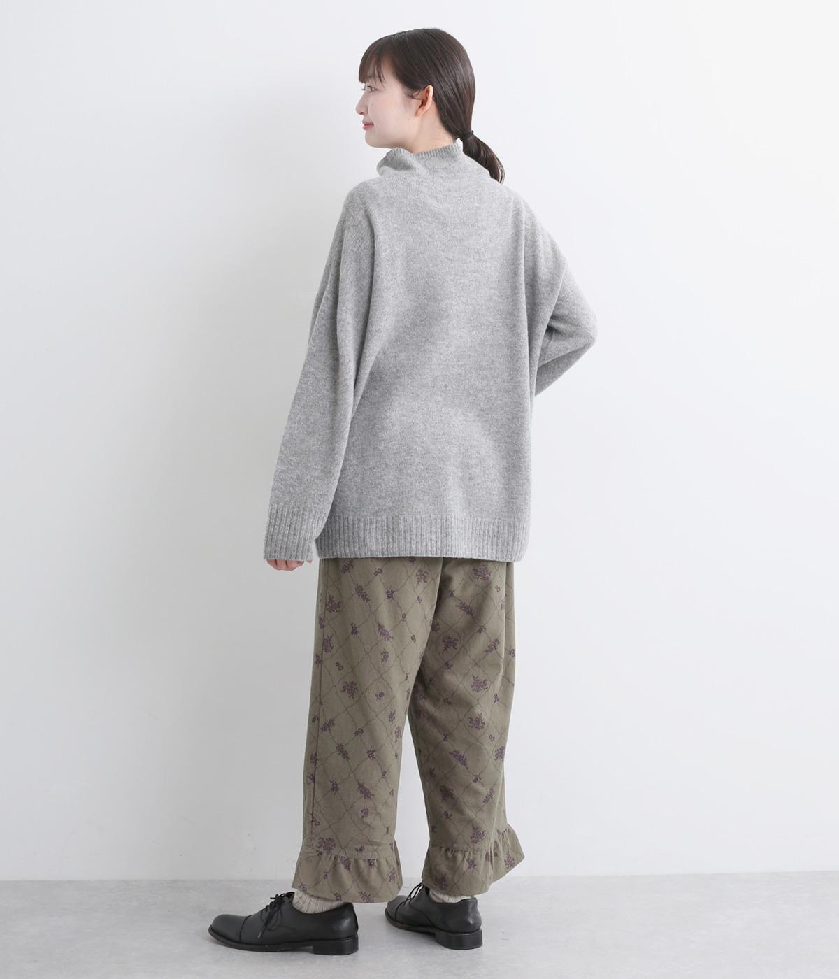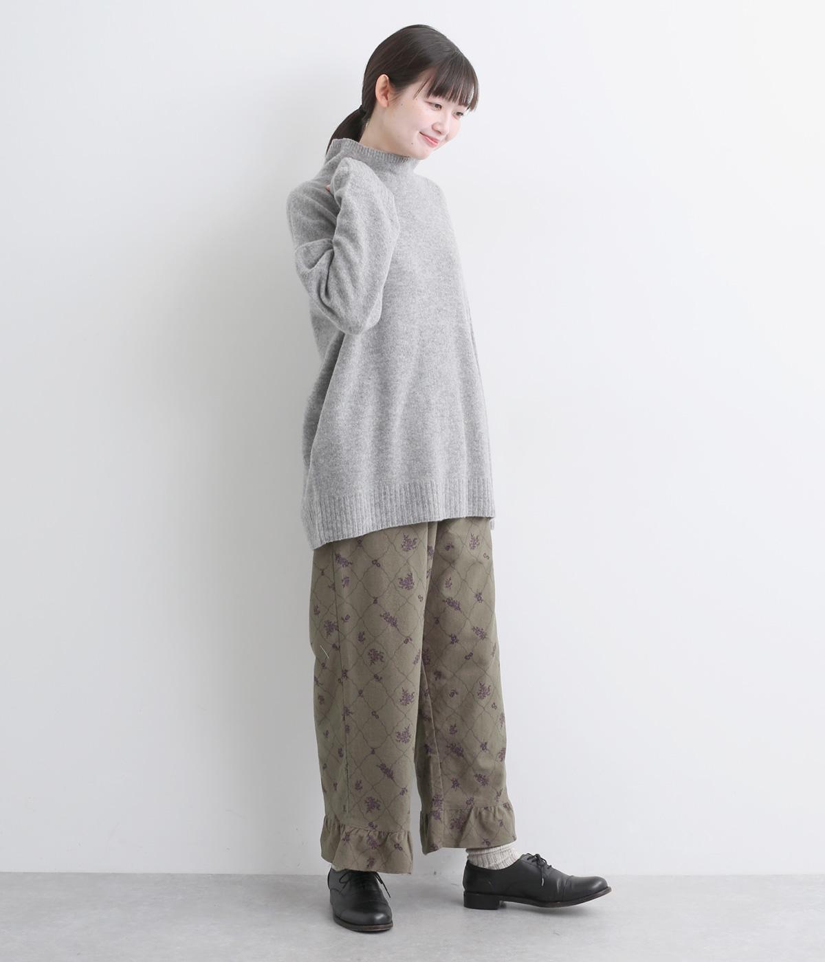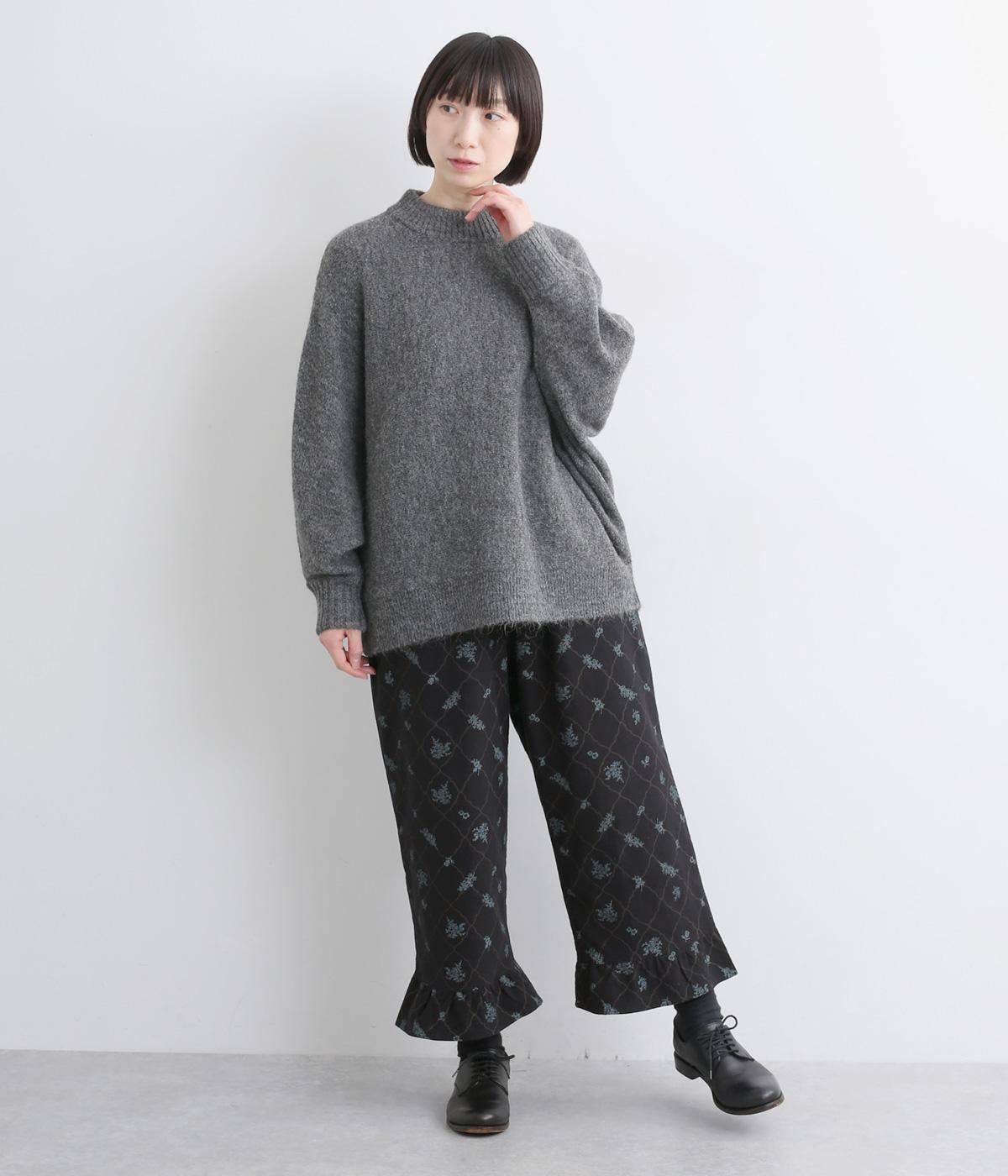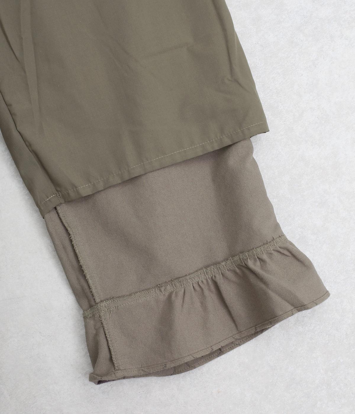 裾フリルが個性を放つパンツです。レトロな雰囲気の総柄プリントが落ち着いた表情に仕上げています。ウエストゴムデザインでストレスフリーな穿き心地。トップスインでもアウトでもサマになります。