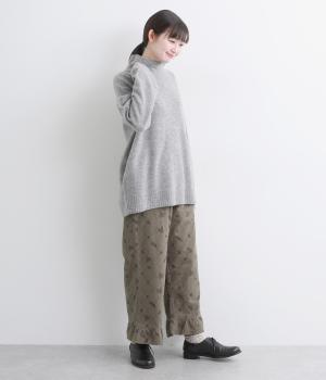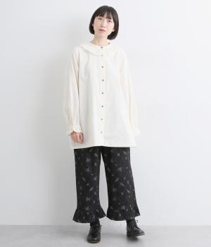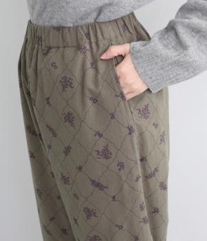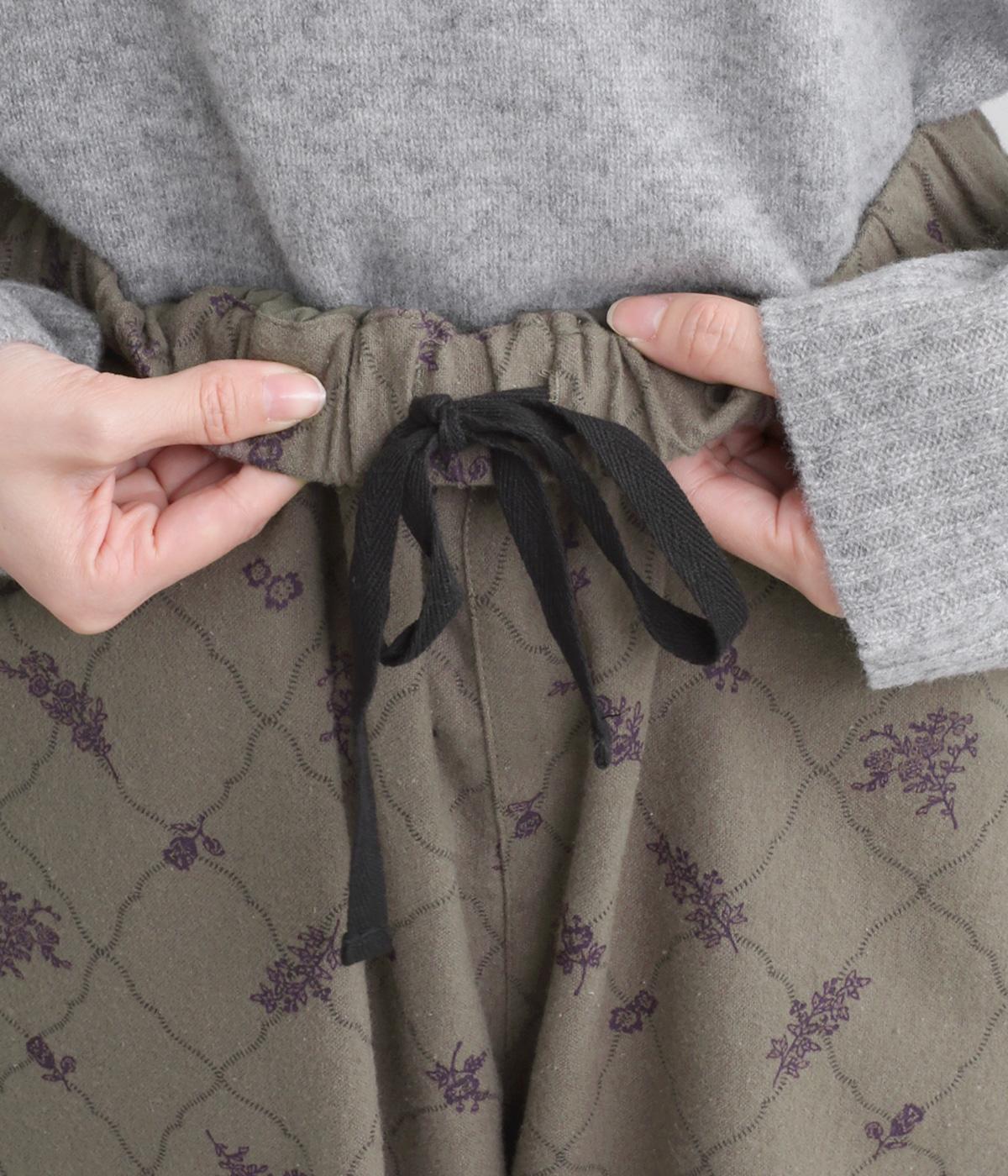 しっかりとした生地感ながら肌になじむコットン素材です。素朴で優しい風合いにシックな総柄プリントをほどこしました。裏地つきで安心感のある穿き心地です。