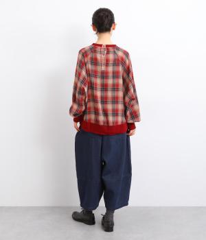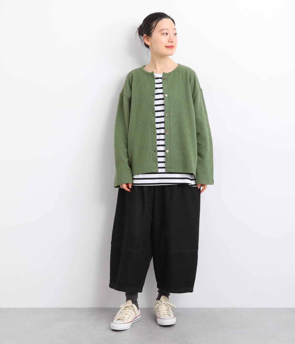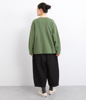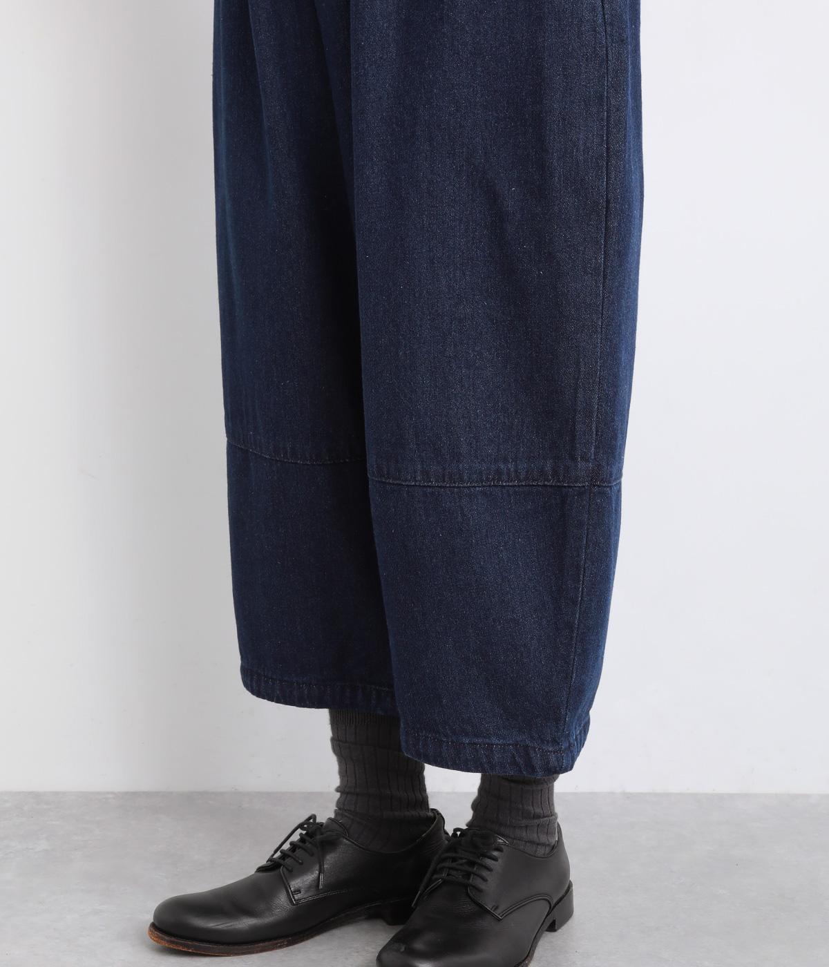 ほどよい厚みのコットンデニムを使用した、やわらかな風合いがたのしめるコクーンシルエットのパンツです。膝下で切り替えをつくることで丸みのあるラインを描き、動きに合わせて自然な立体感が生まれます。足元がすっきり見える丈感なので、靴下やシューズとの組み合わせもたのしめるのが魅力です。