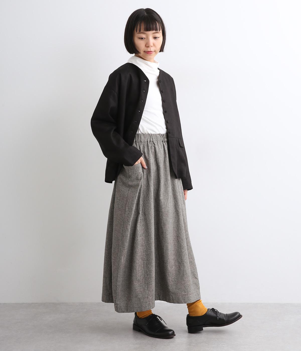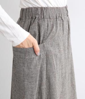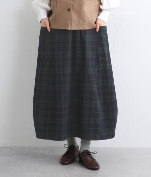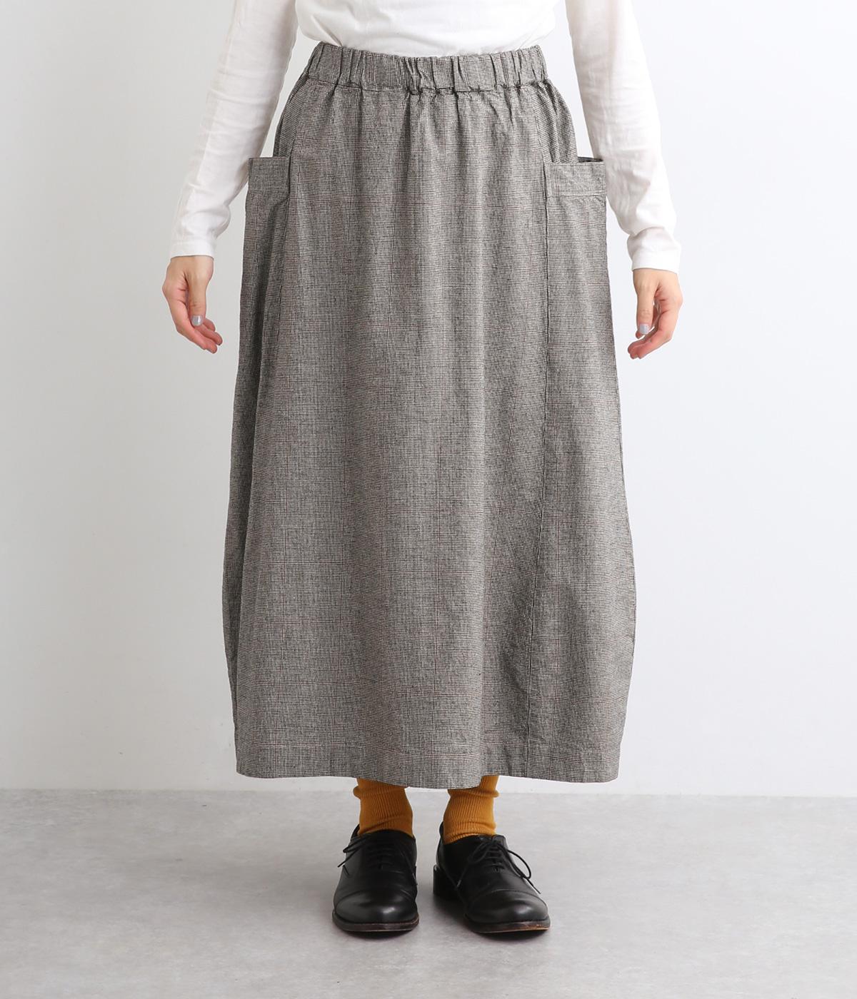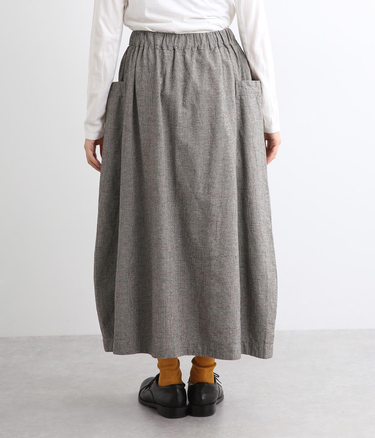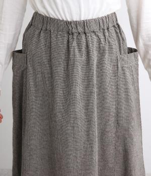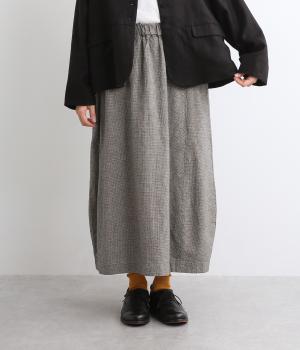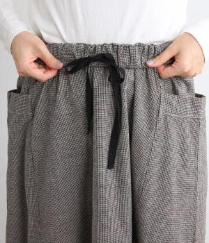 ゆったりした腰回りと裾に向かってしぼまるシルエットのコクーンスカートです。両サイドにあるビックポケットがアクセント。体のラインを拾いにくく、リラックス感のある着心地です。ウエストは総ゴム仕様で紐で調整可能です。