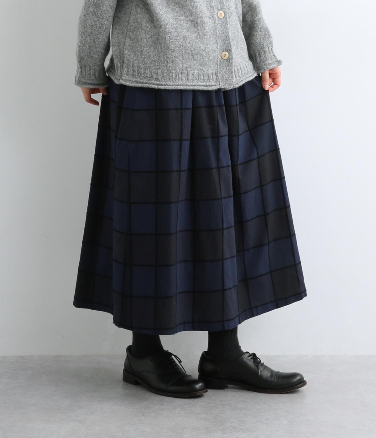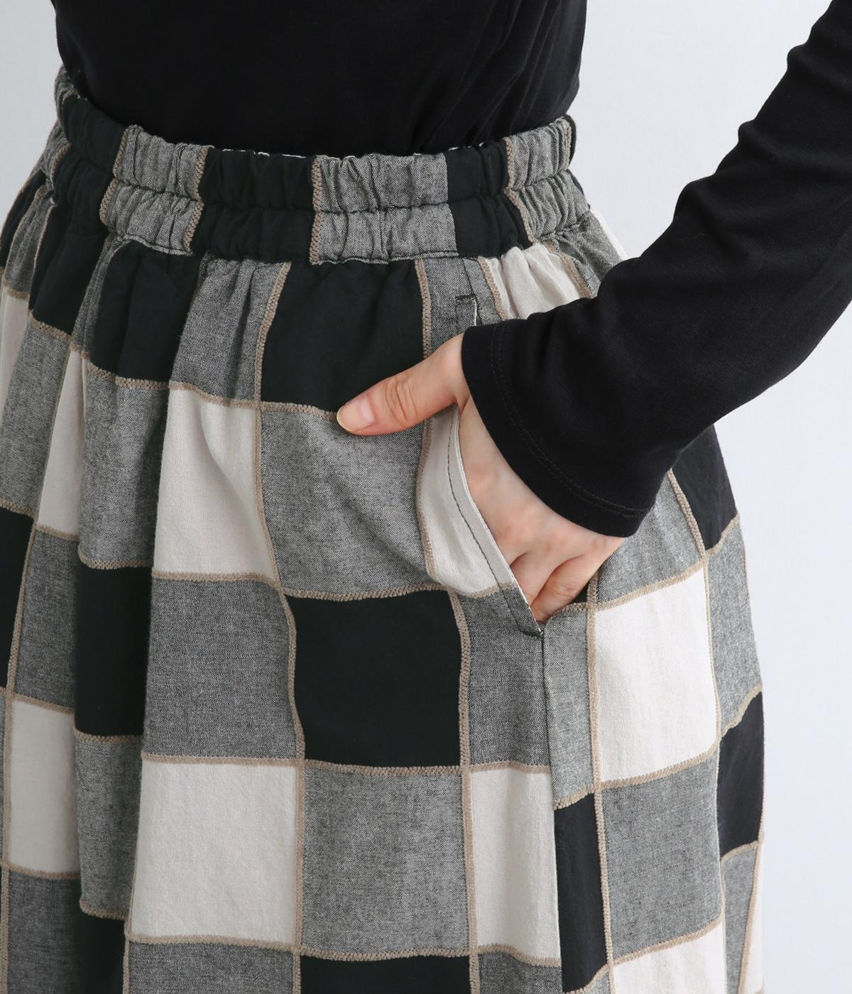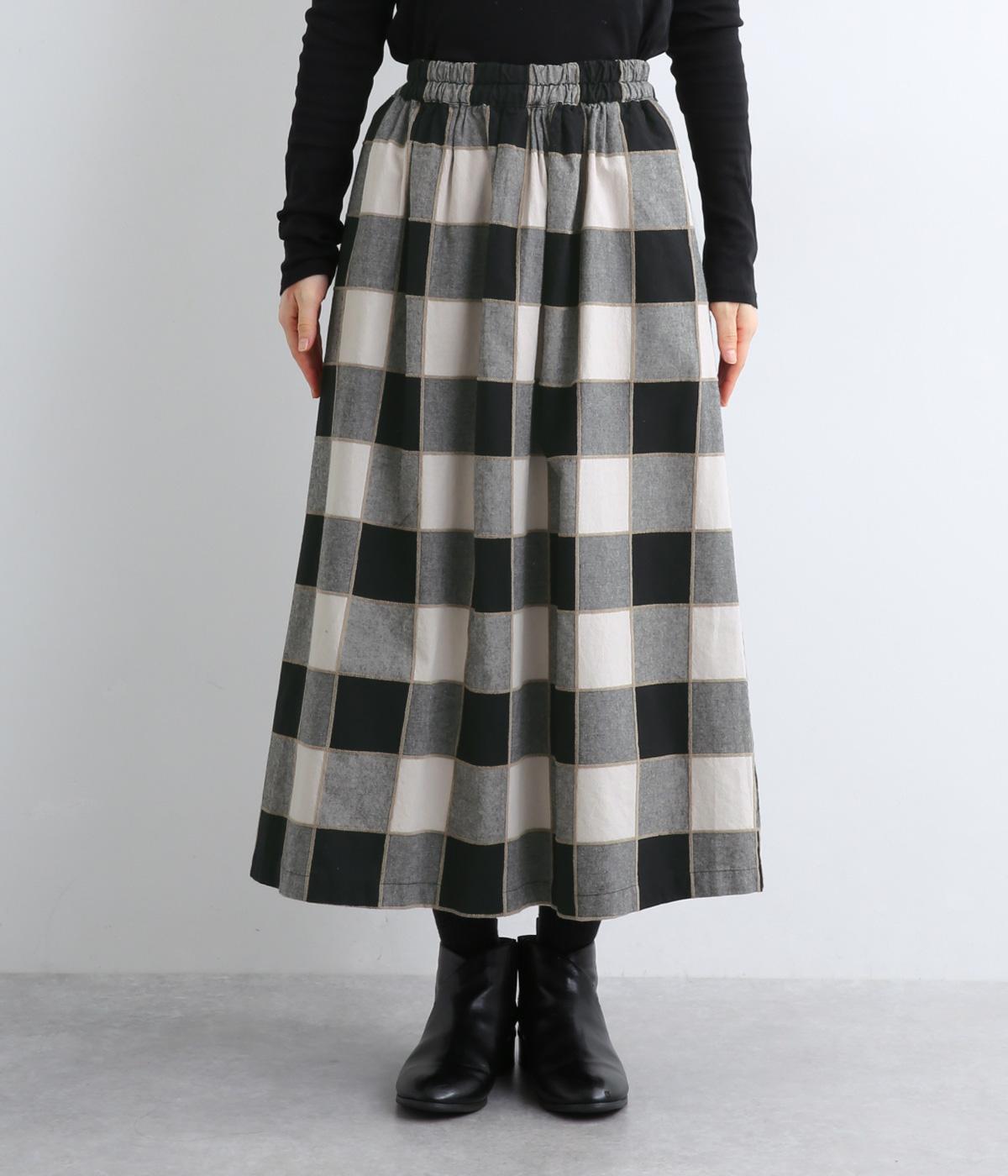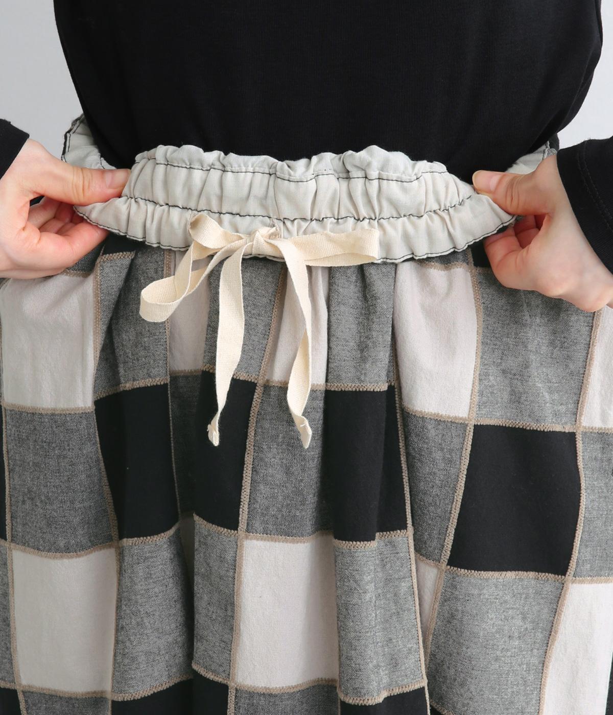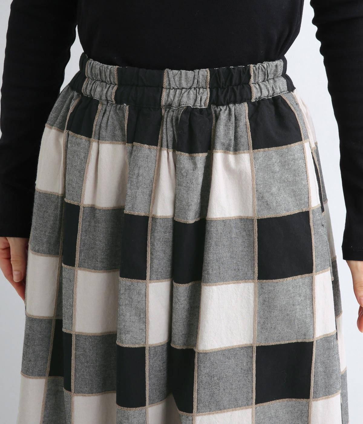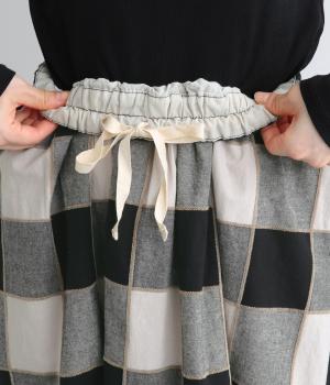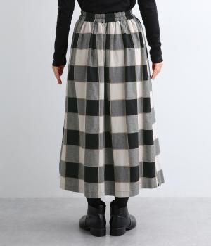 コットンモール糸でブロッキングしたチェック柄が特徴的なギャザースカート。ウエストはゴム+内紐仕様で、ギャザーがたっぷり入っているのでリラックスしたはき心地に。存在感を出しながらもすっきりとした丈感です。