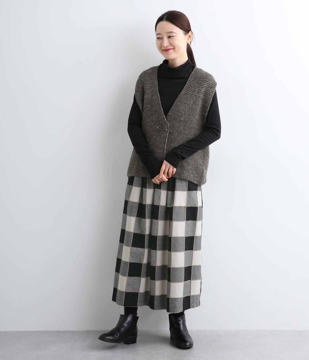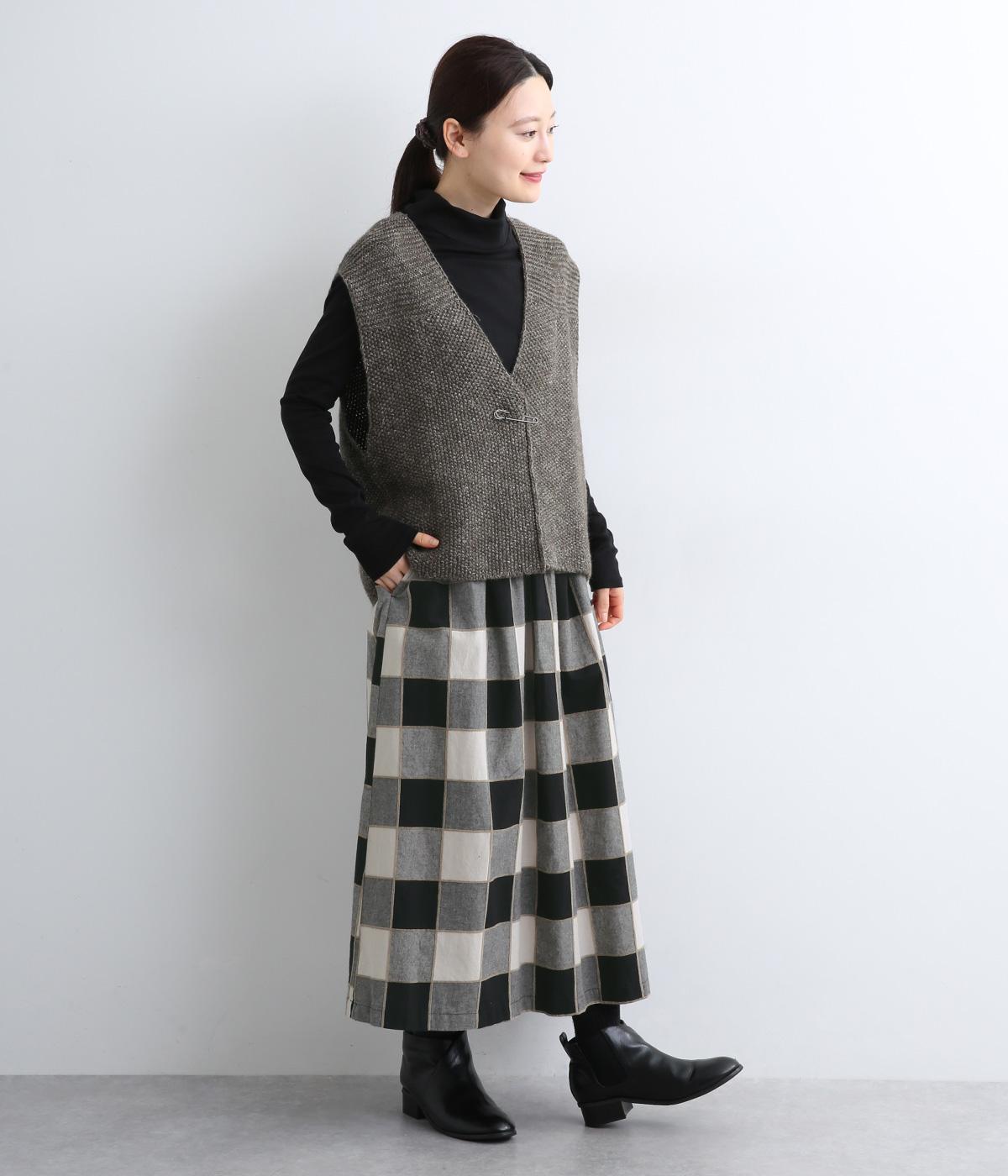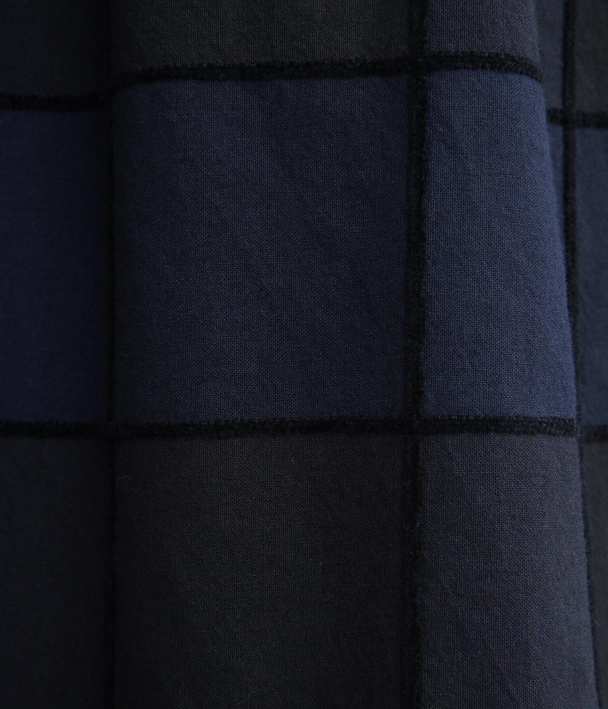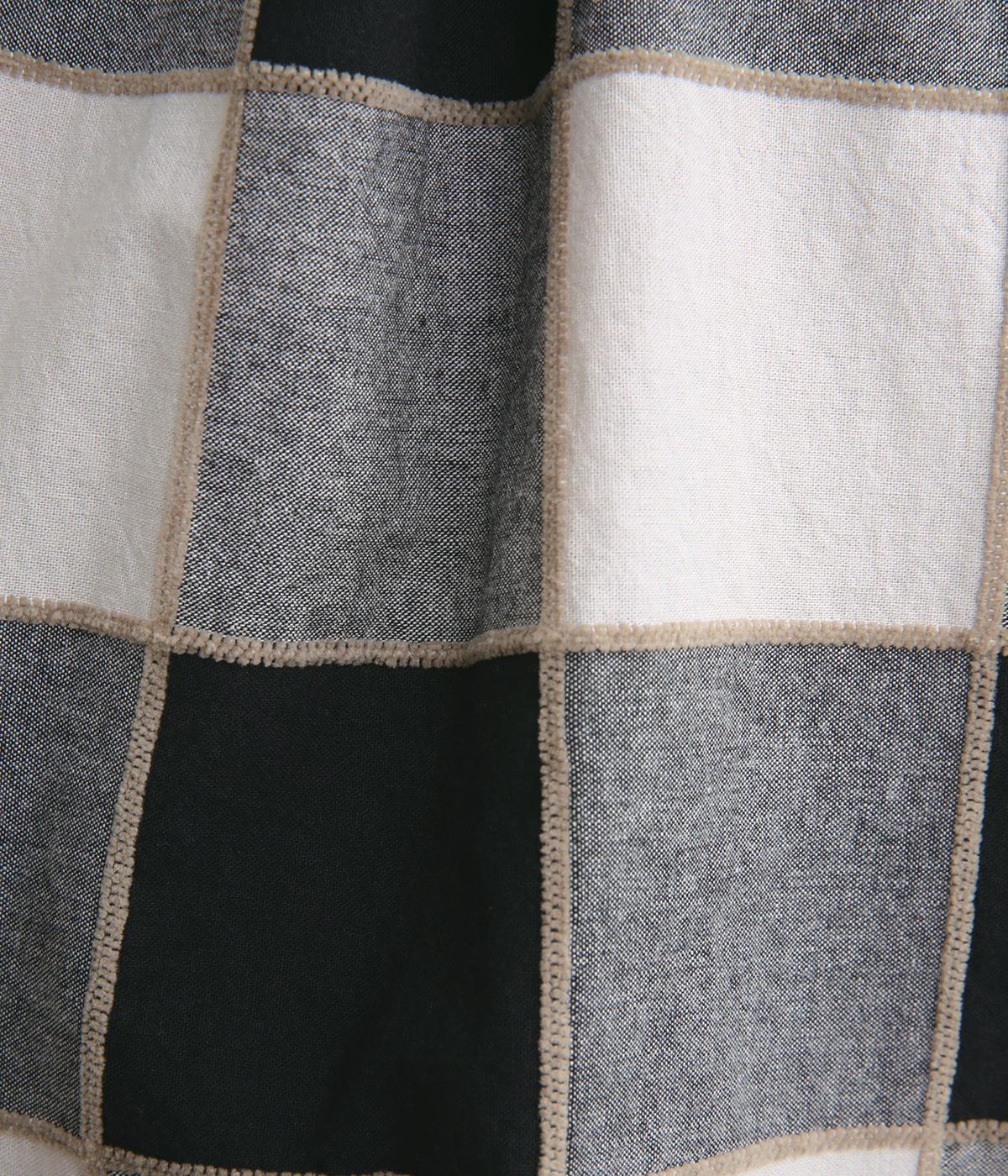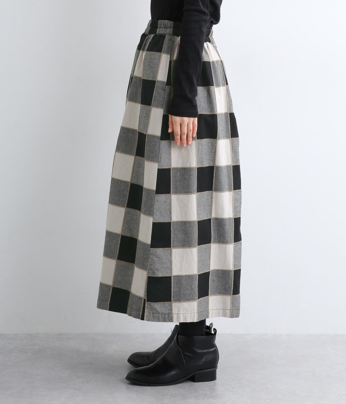 コットンモール糸でブロッキングしたチェック柄が特徴的なギャザースカート。ウエストはゴム+内紐仕様で、ギャザーがたっぷり入っているのでリラックスしたはき心地に。存在感を出しながらもすっきりとした丈感です。