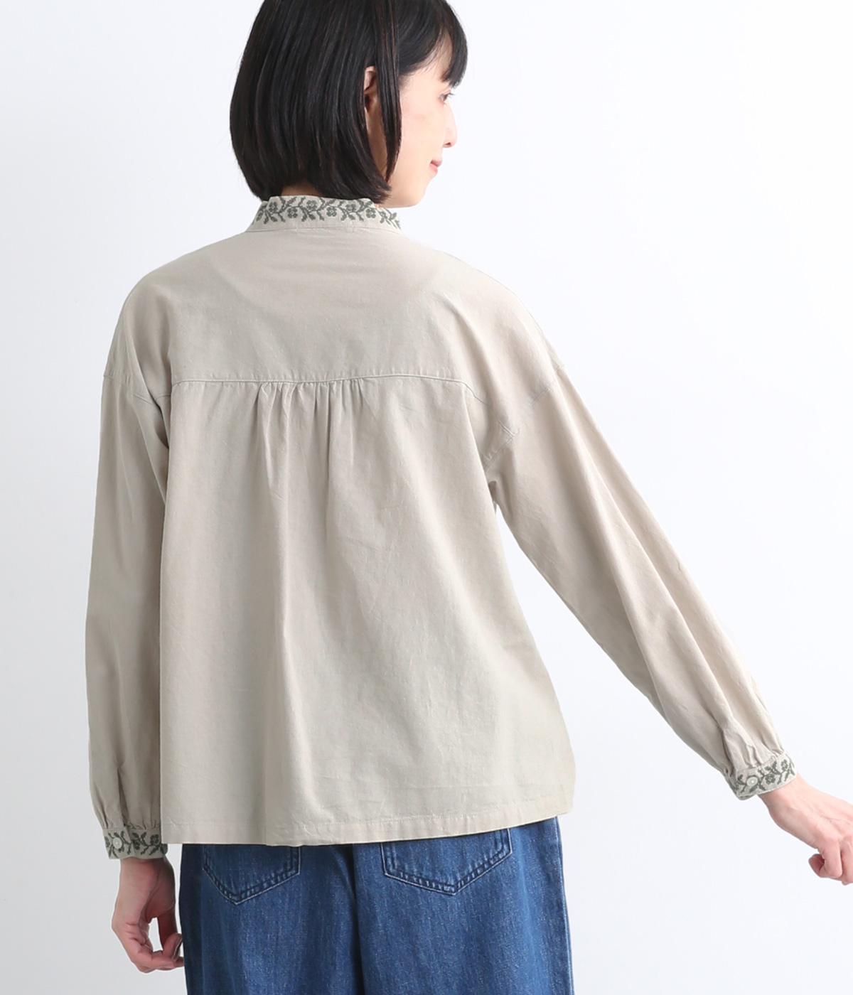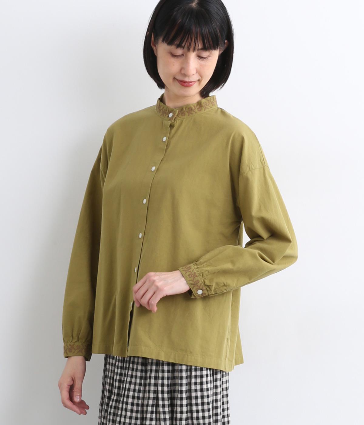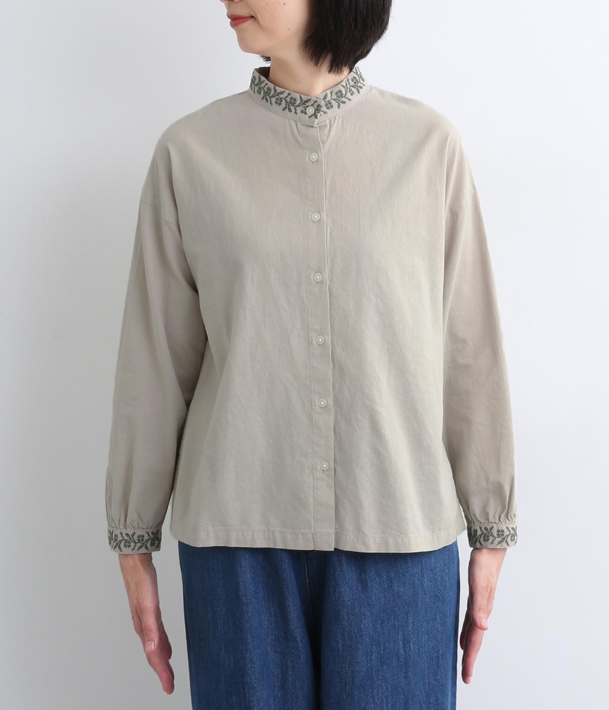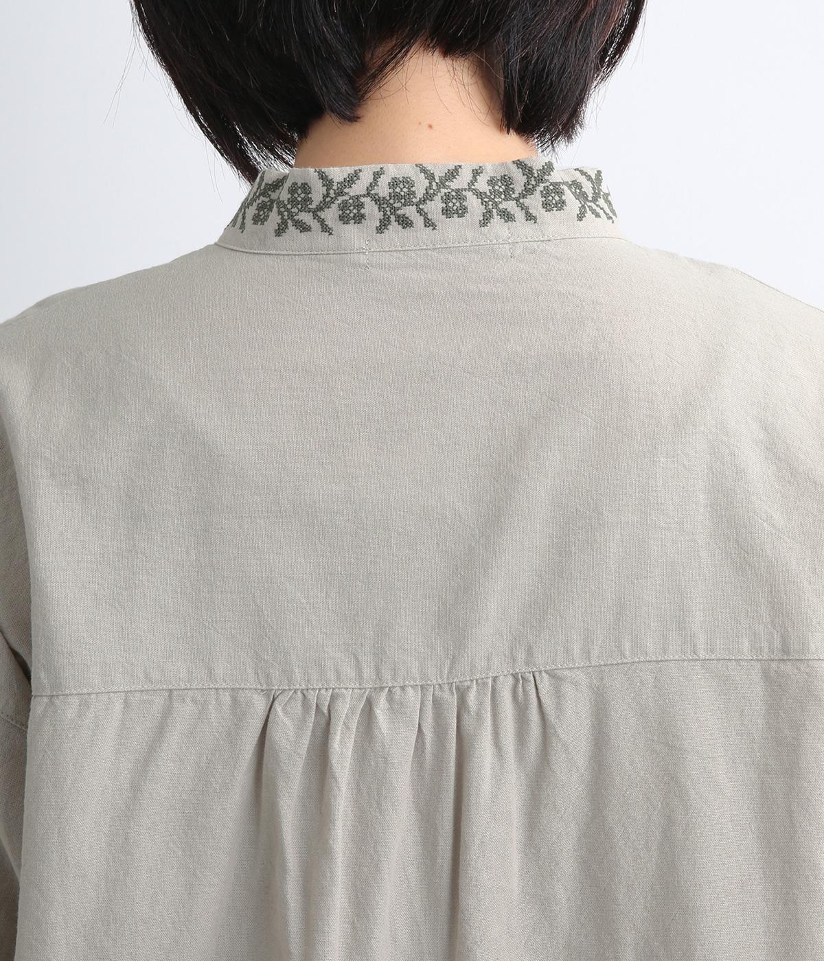 ナチュラル感が魅力のコットンシャツに、襟と袖に花柄のクロスステッチ刺しゅうをほどこしてポイントをつけました。ベーシックなサイズ感とシルエットで着こなしやすく、前あき仕様で羽織り使いもおすすめ。