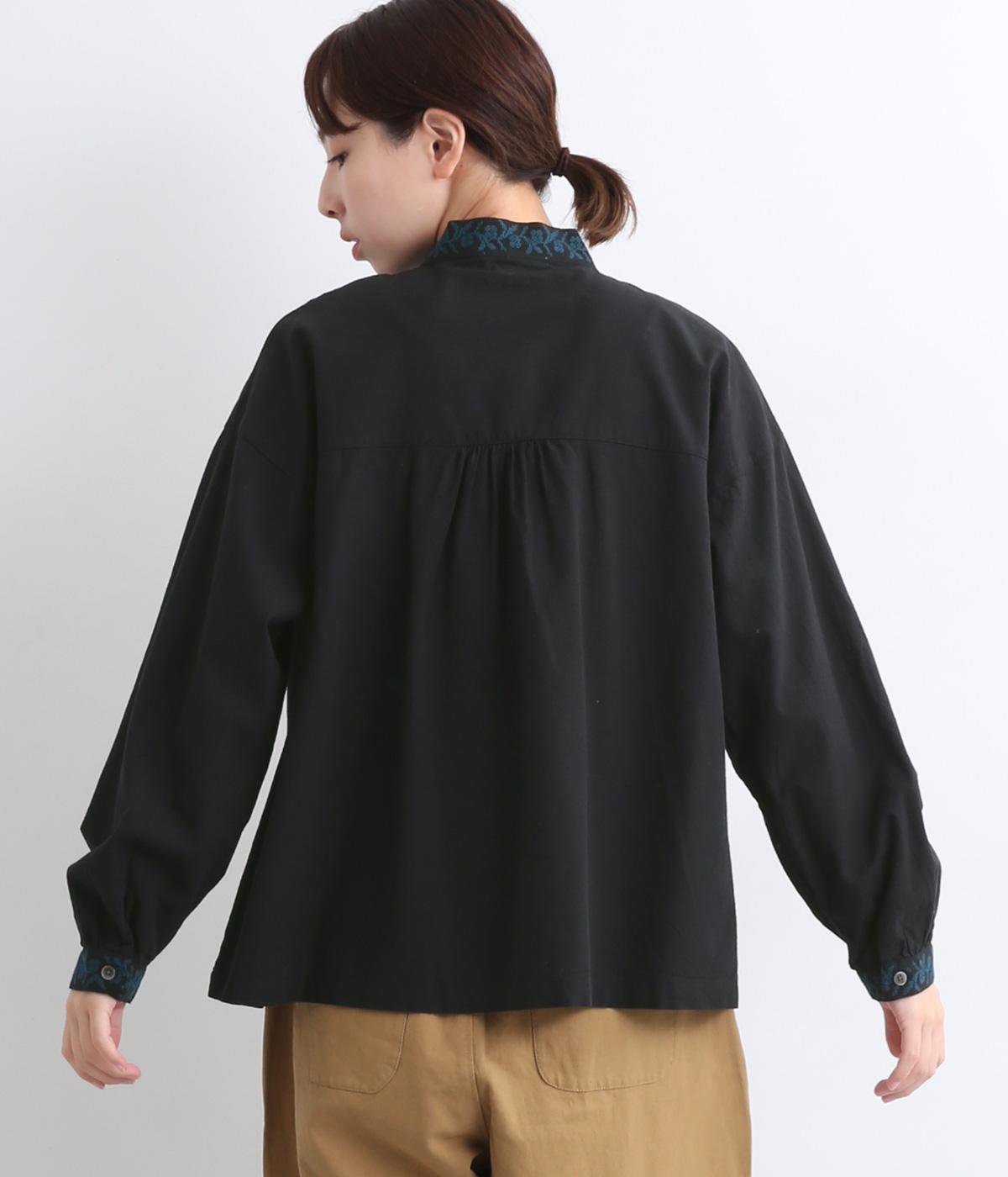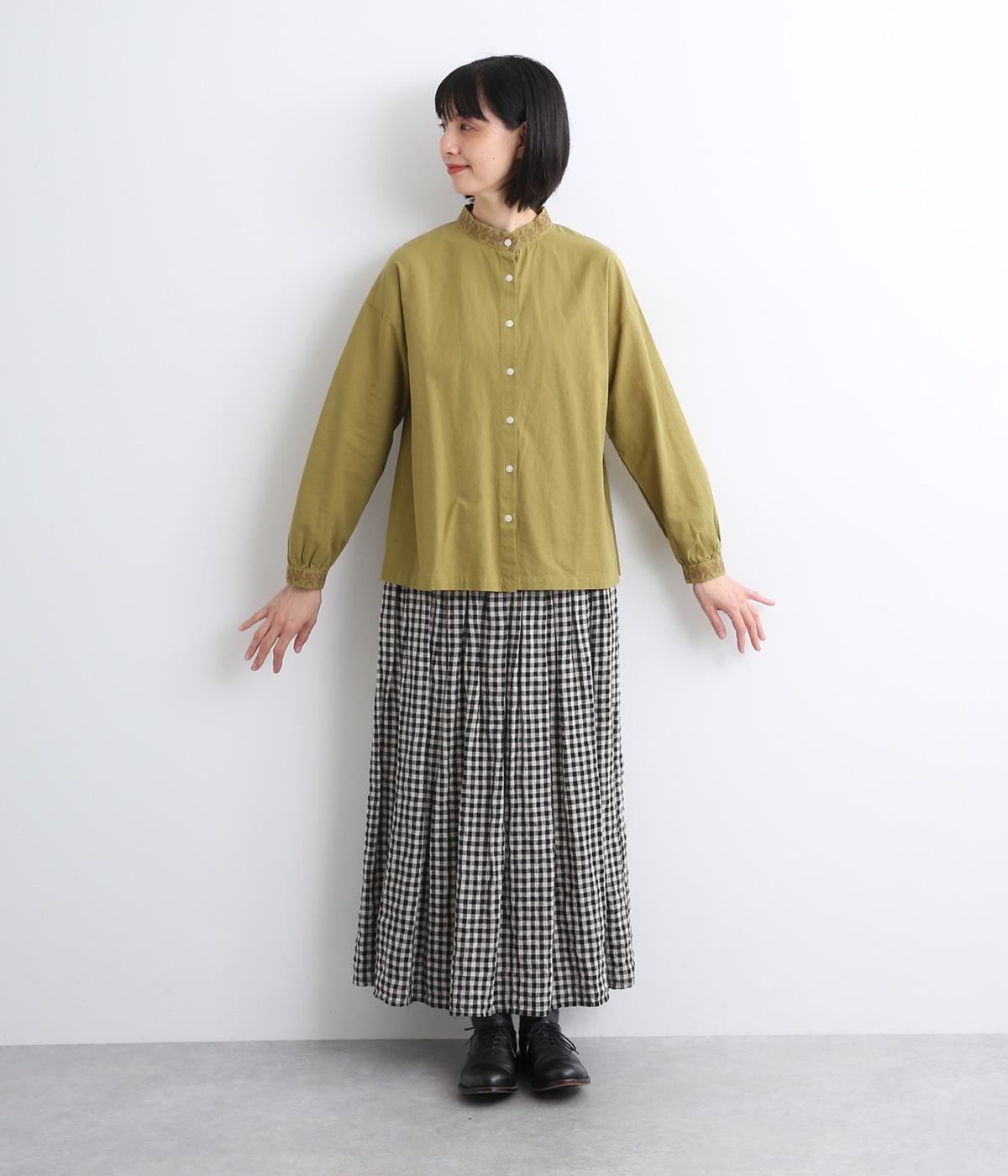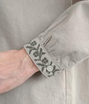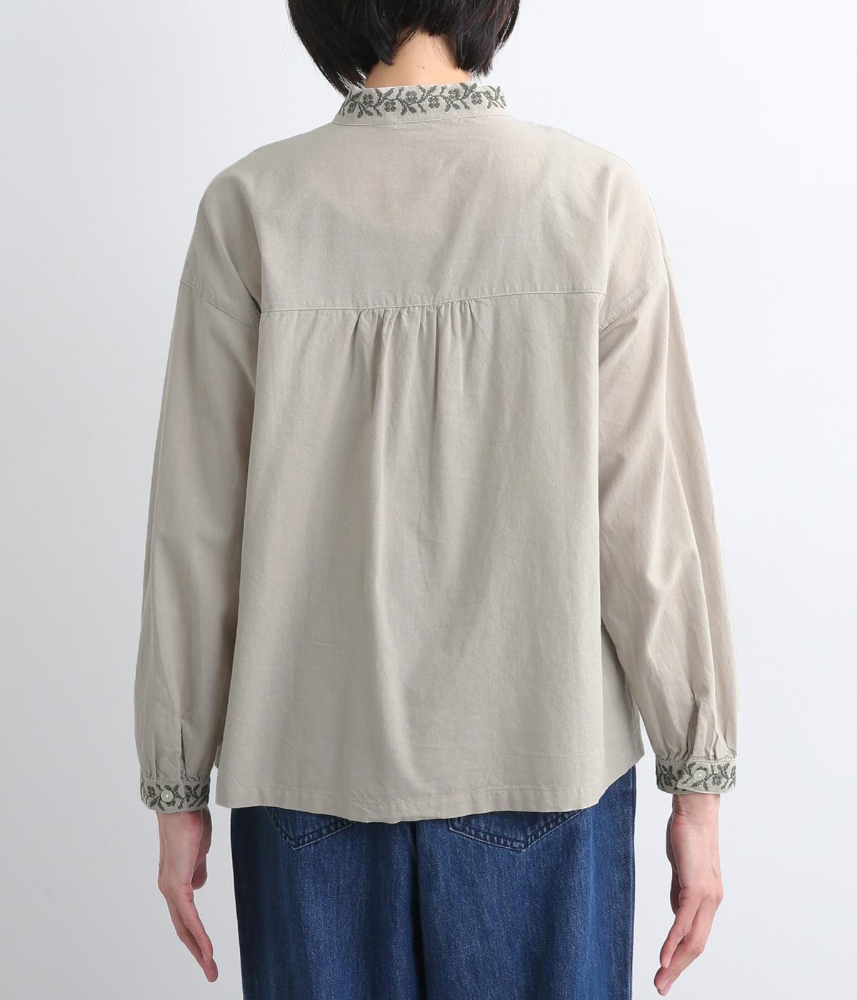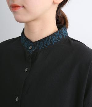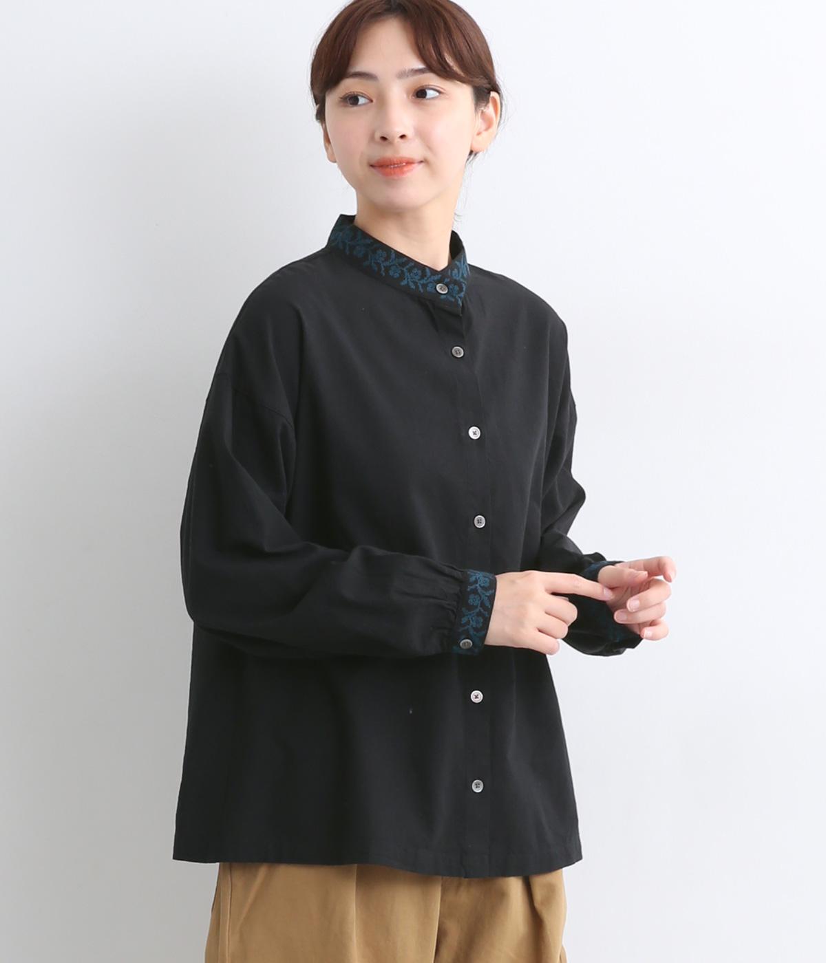 ナチュラル感が魅力のコットンシャツに、襟と袖に花柄のクロスステッチ刺しゅうをほどこしてポイントをつけました。ベーシックなサイズ感とシルエットで着こなしやすく、前あき仕様で羽織り使いもおすすめ。