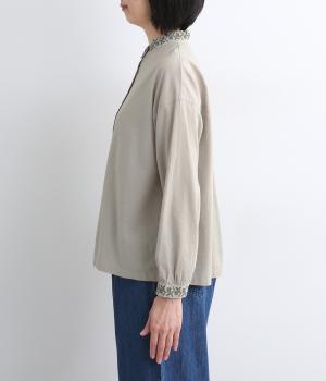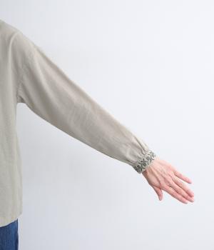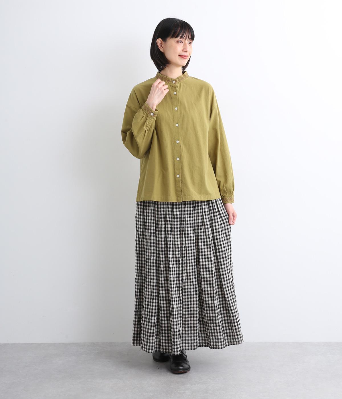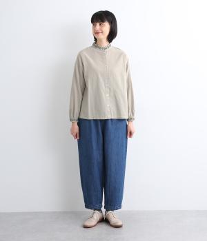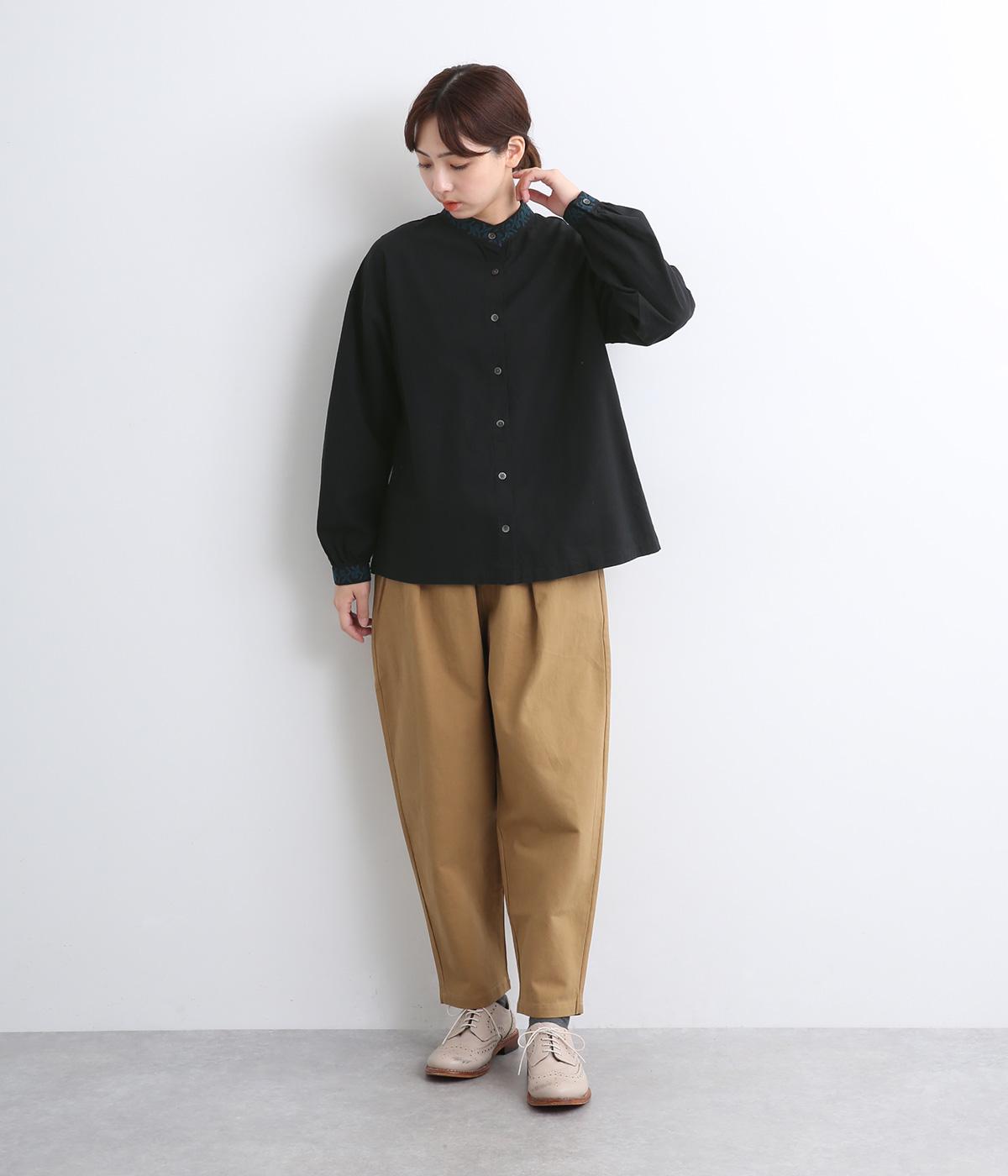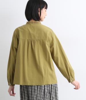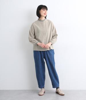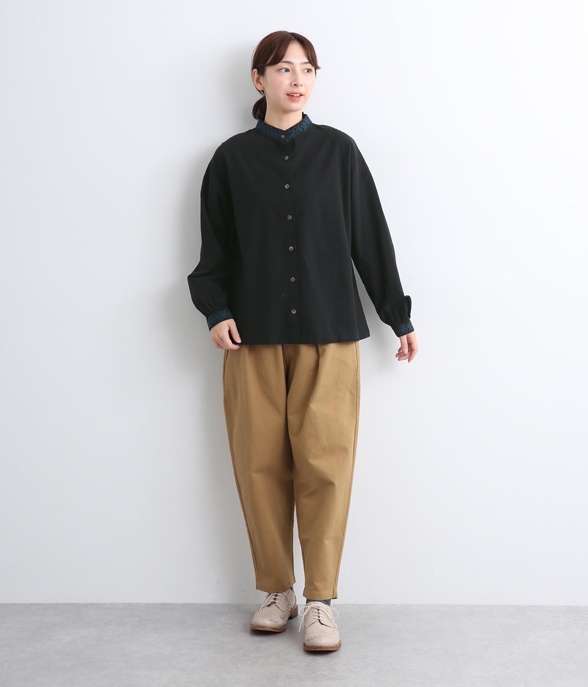 ナチュラル感が魅力のコットンシャツに、襟と袖に花柄のクロスステッチ刺しゅうをほどこしてポイントをつけました。ベーシックなサイズ感とシルエットで着こなしやすく、前あき仕様で羽織り使いもおすすめ。