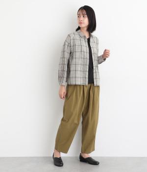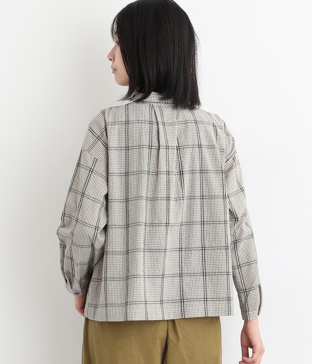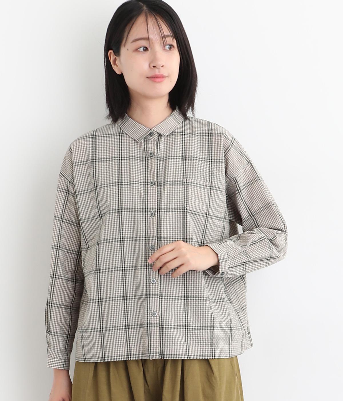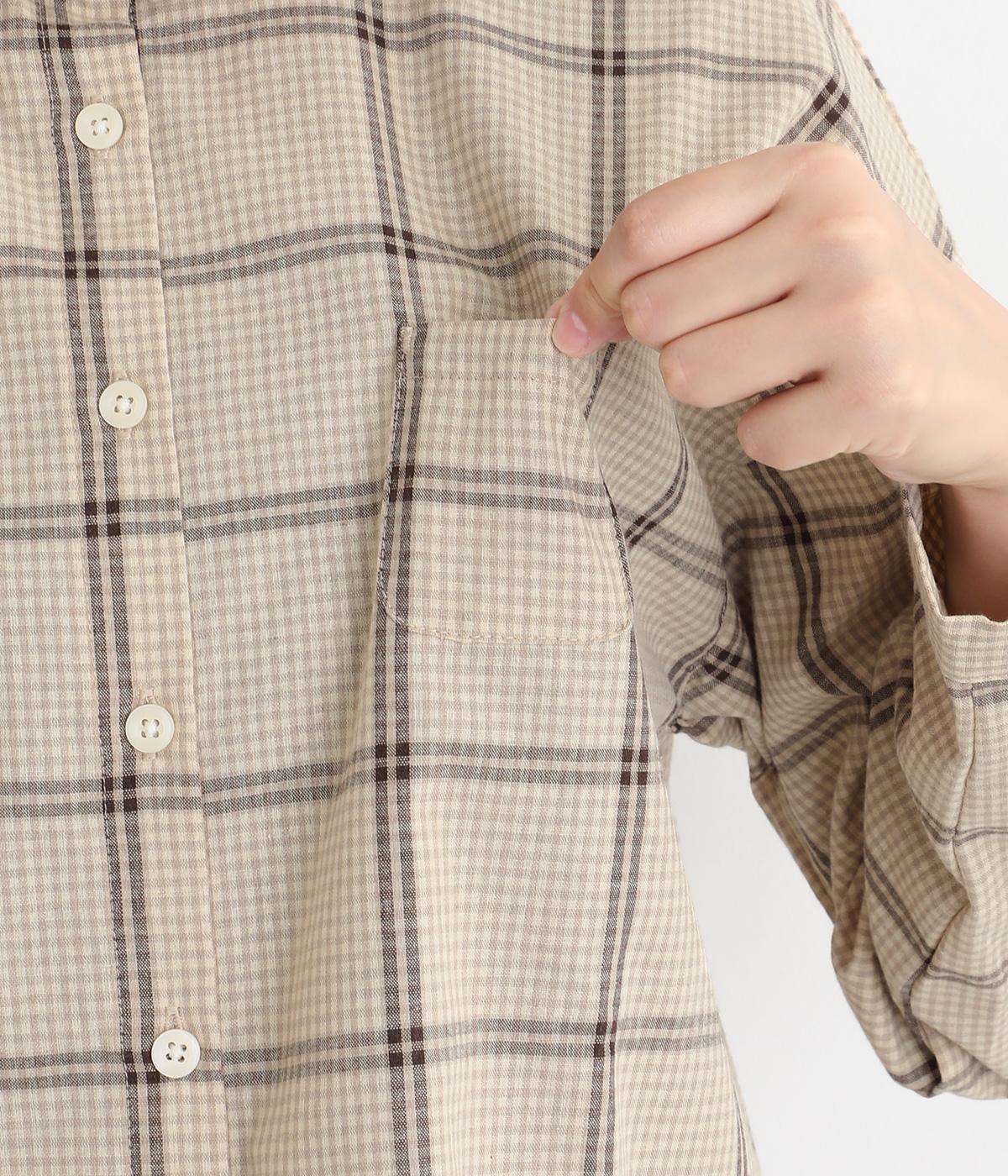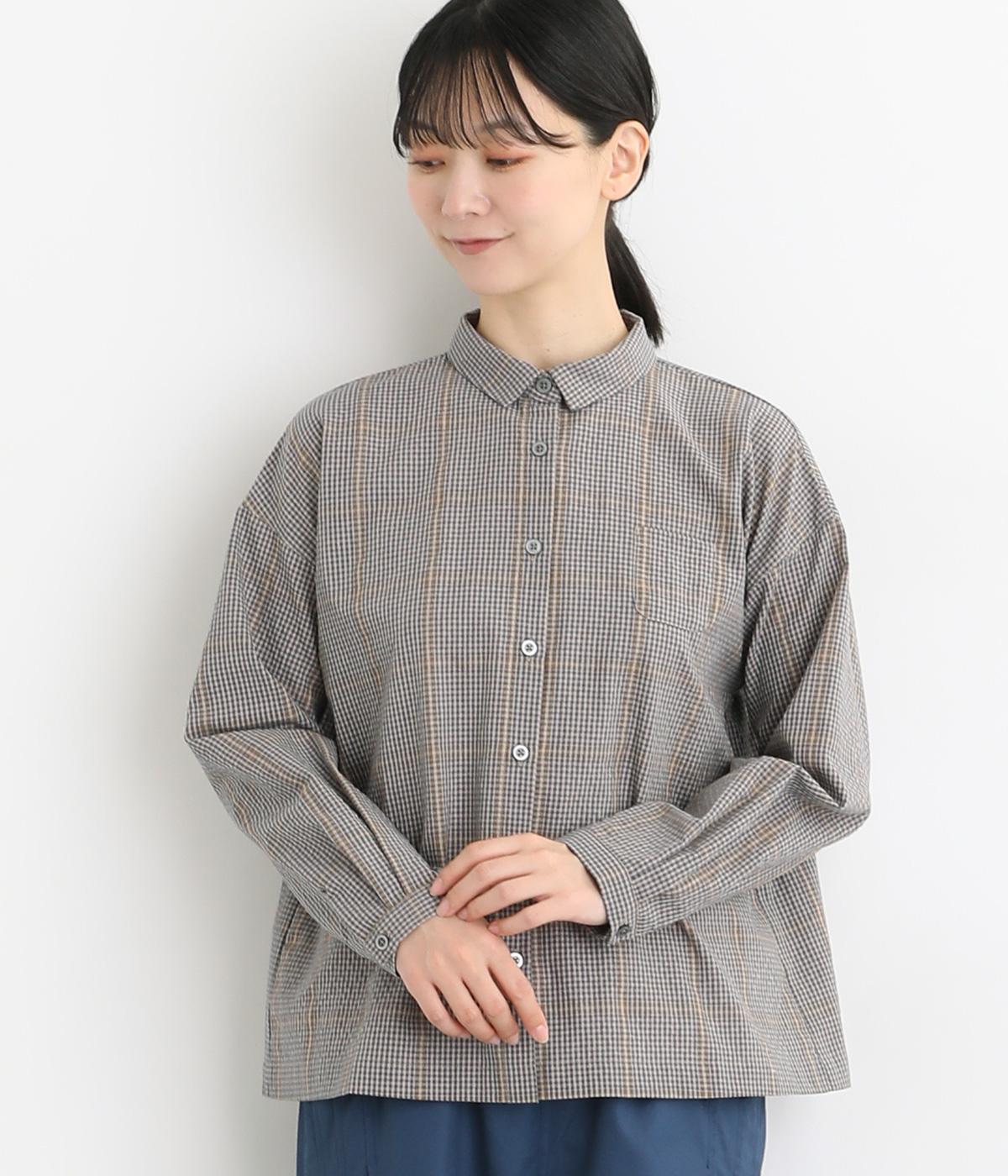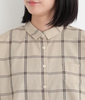 胸元にあるちびポケットがデザインポイントになったチェック柄シャツです。ベーシックなボックス型でパンツにもスカートにも合わせやすく、スタイリングしやすいのも魅力。襟つきできちんと感も出しました。