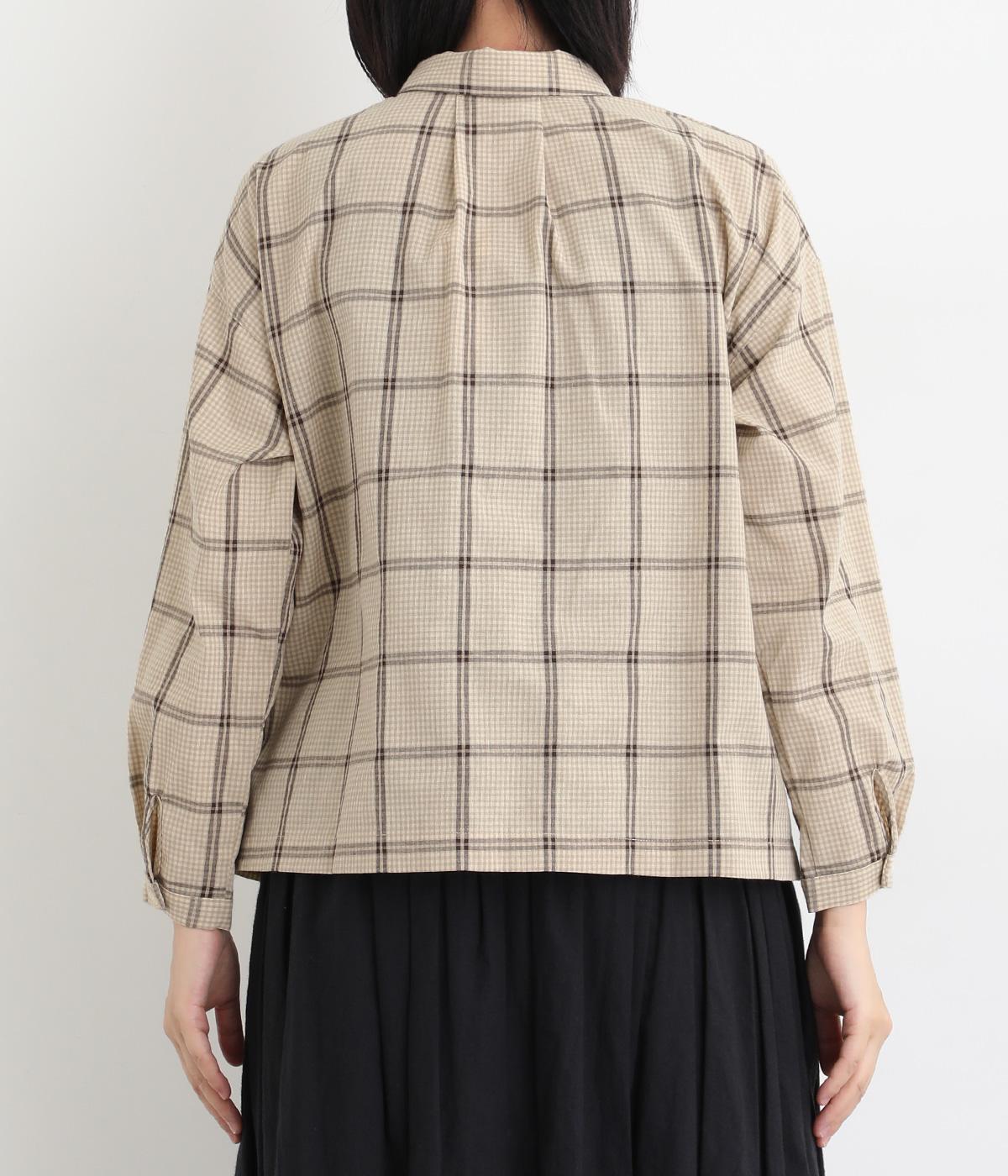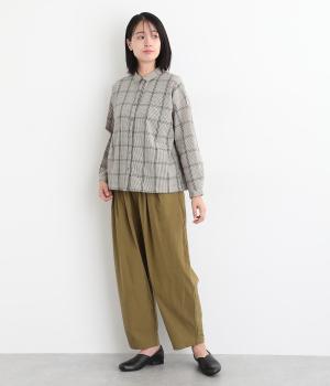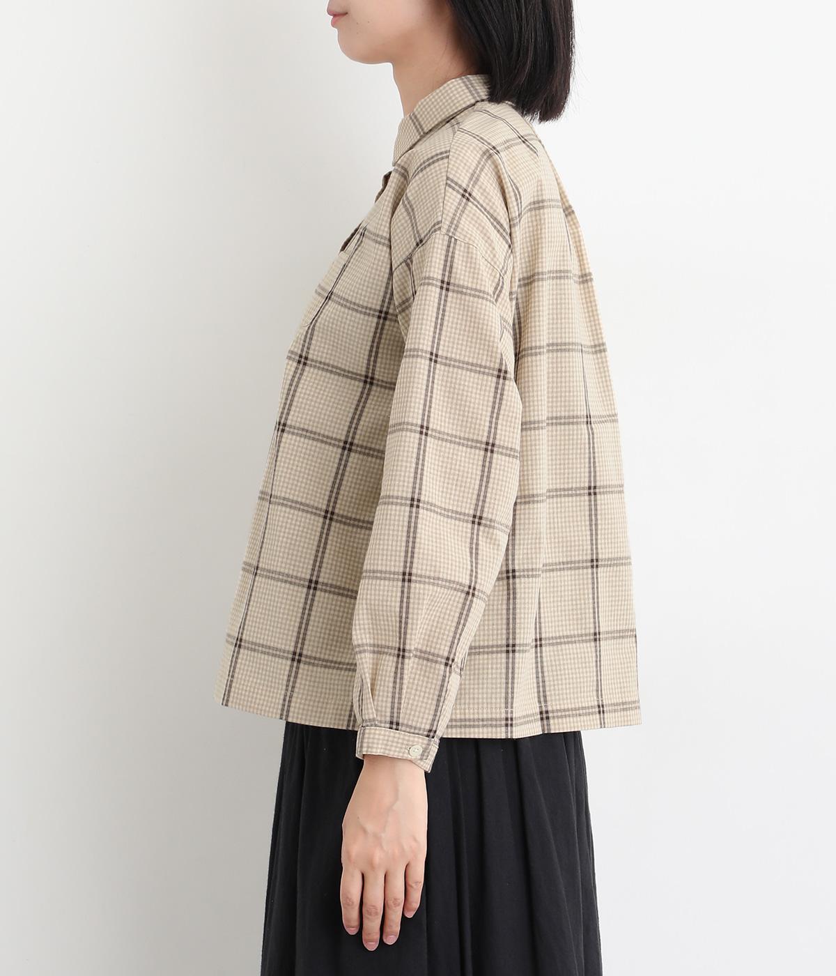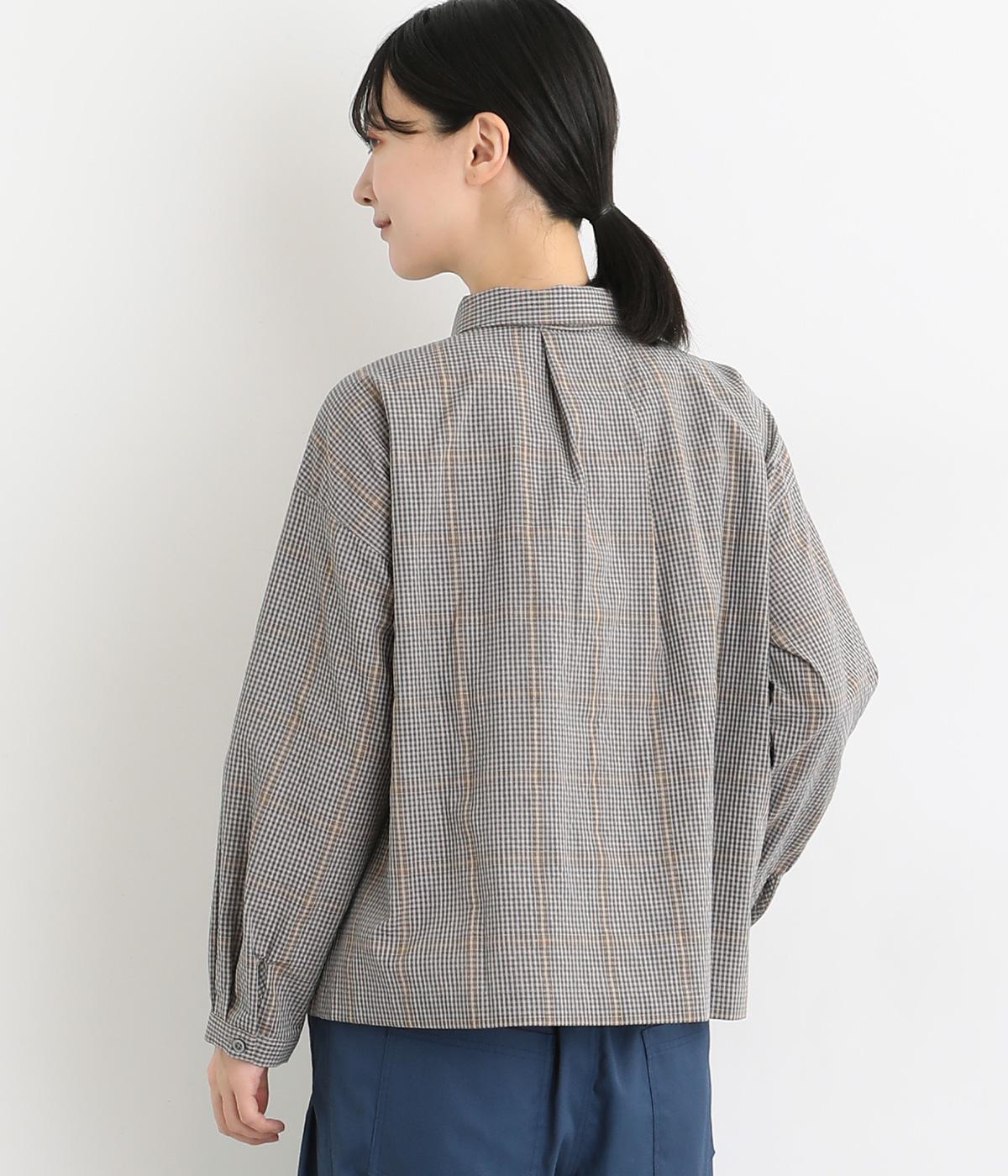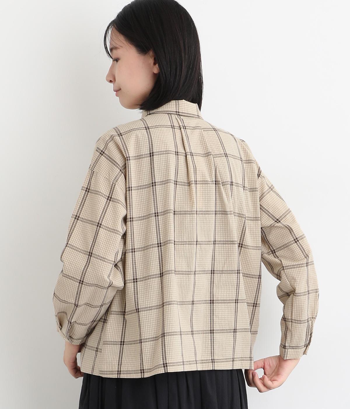 胸元にあるちびポケットがデザインポイントになったチェック柄シャツです。ベーシックなボックス型でパンツにもスカートにも合わせやすく、スタイリングしやすいのも魅力。襟つきできちんと感も出しました。