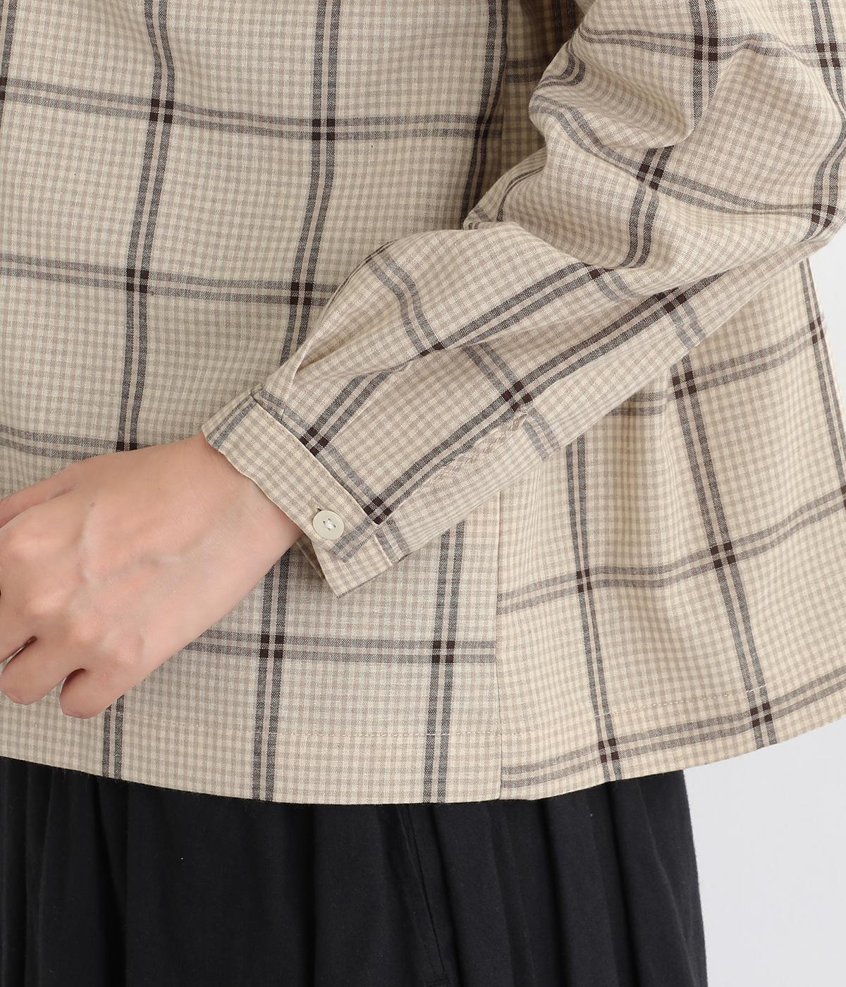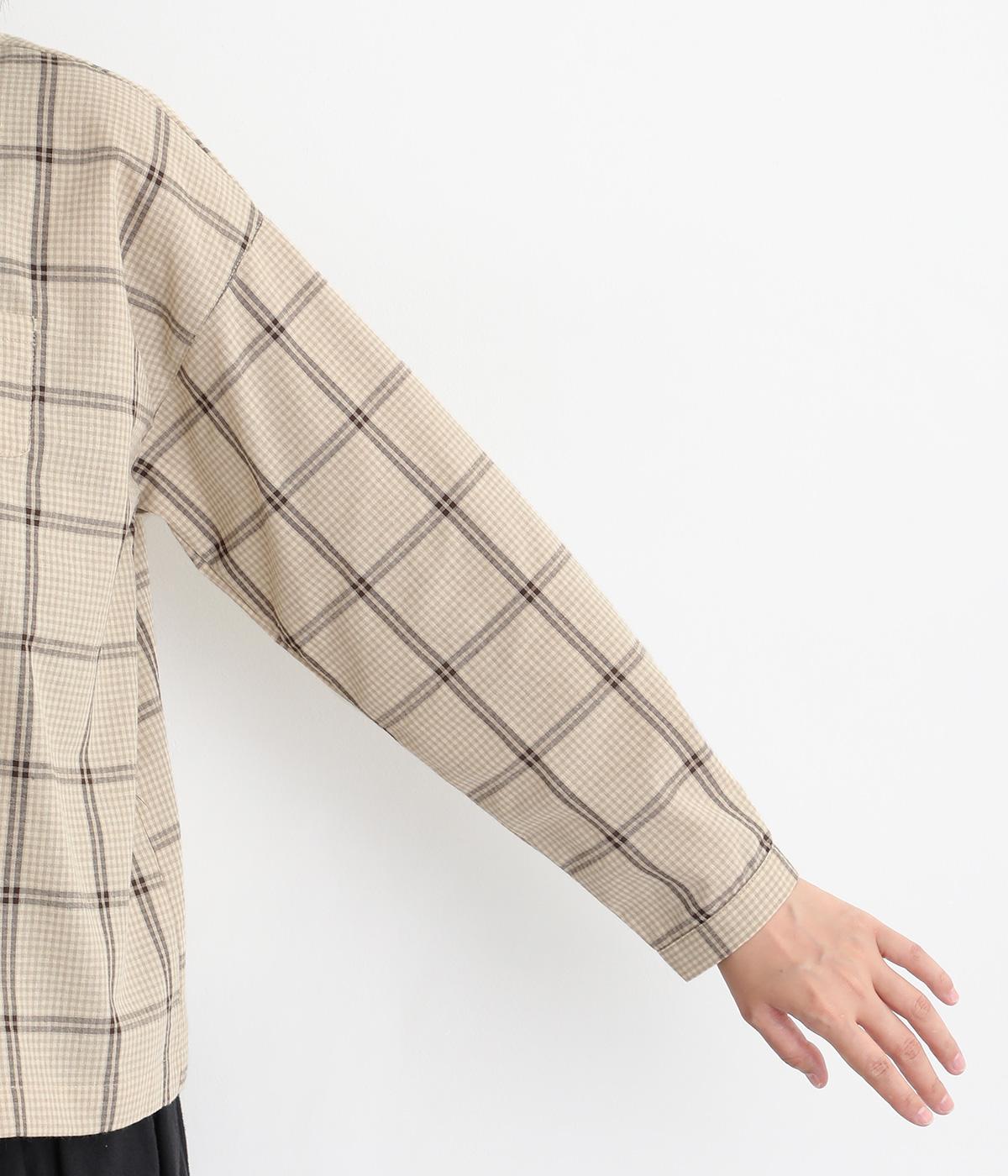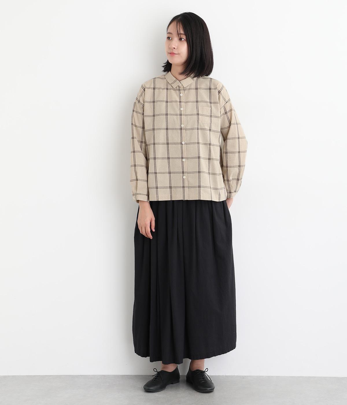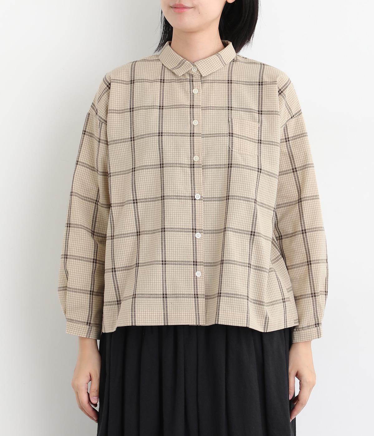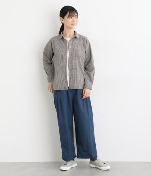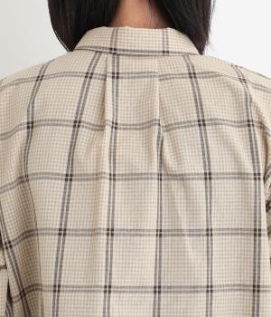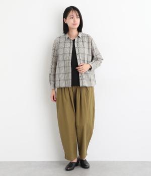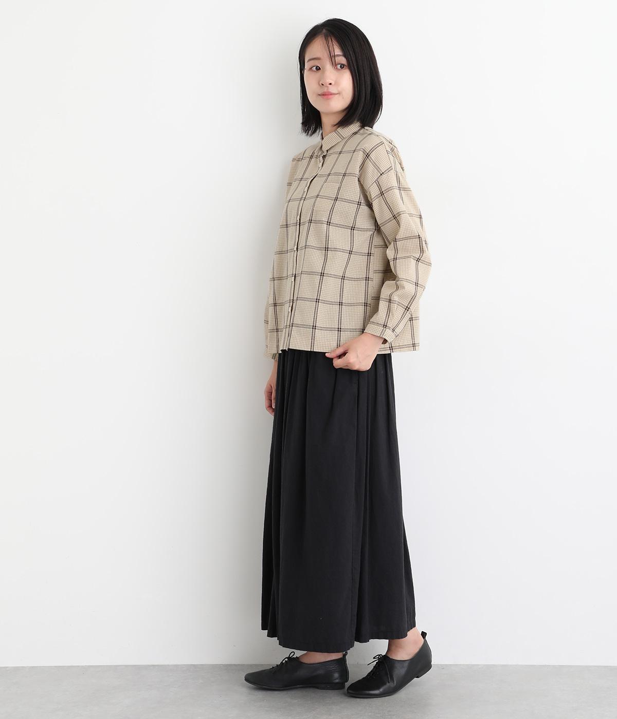 胸元にあるちびポケットがデザインポイントになったチェック柄シャツです。ベーシックなボックス型でパンツにもスカートにも合わせやすく、スタイリングしやすいのも魅力。襟つきできちんと感も出しました。
