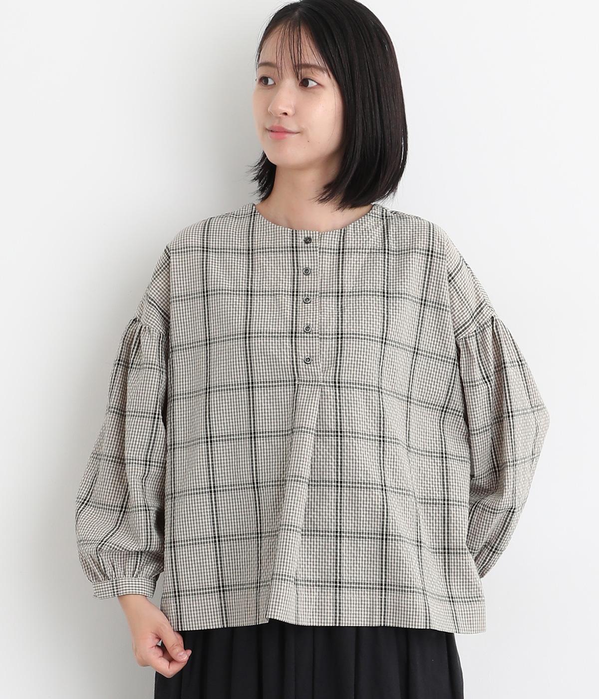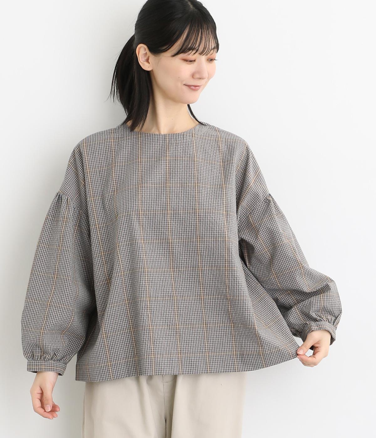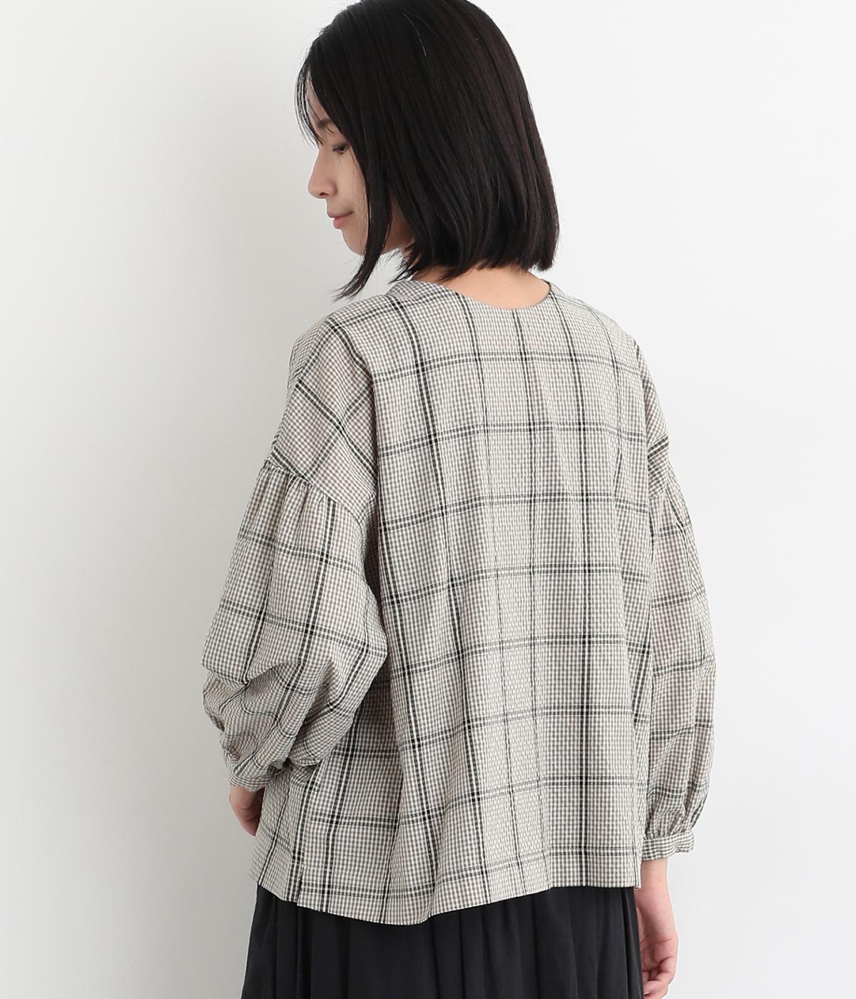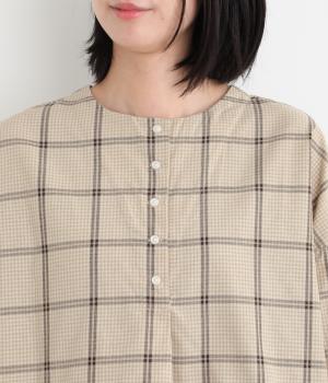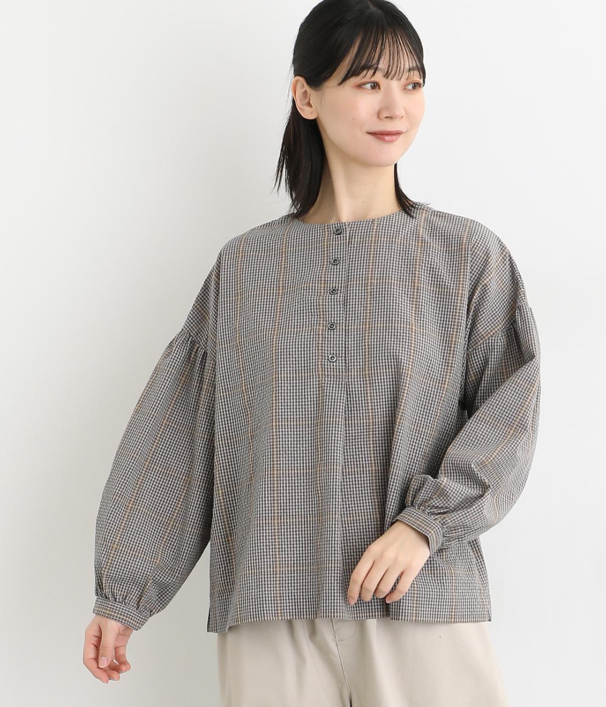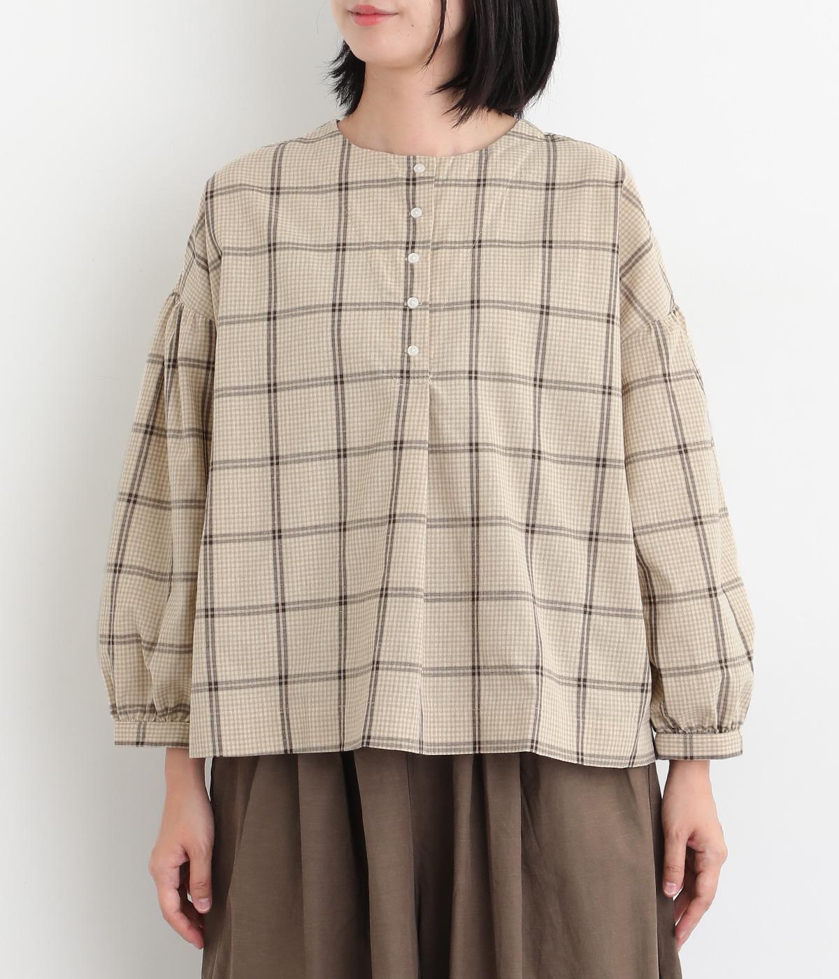 ラウンドネックのプルオーバーとヘンリーネック、印象の異なる前後着用可能な2wayブラウスです。着こなしのポイントになるチェック柄生地で、シンプルなボトム合わせもおしゃれ見えを叶えます。ギャザーを寄せてふわりとした袖も◎。
