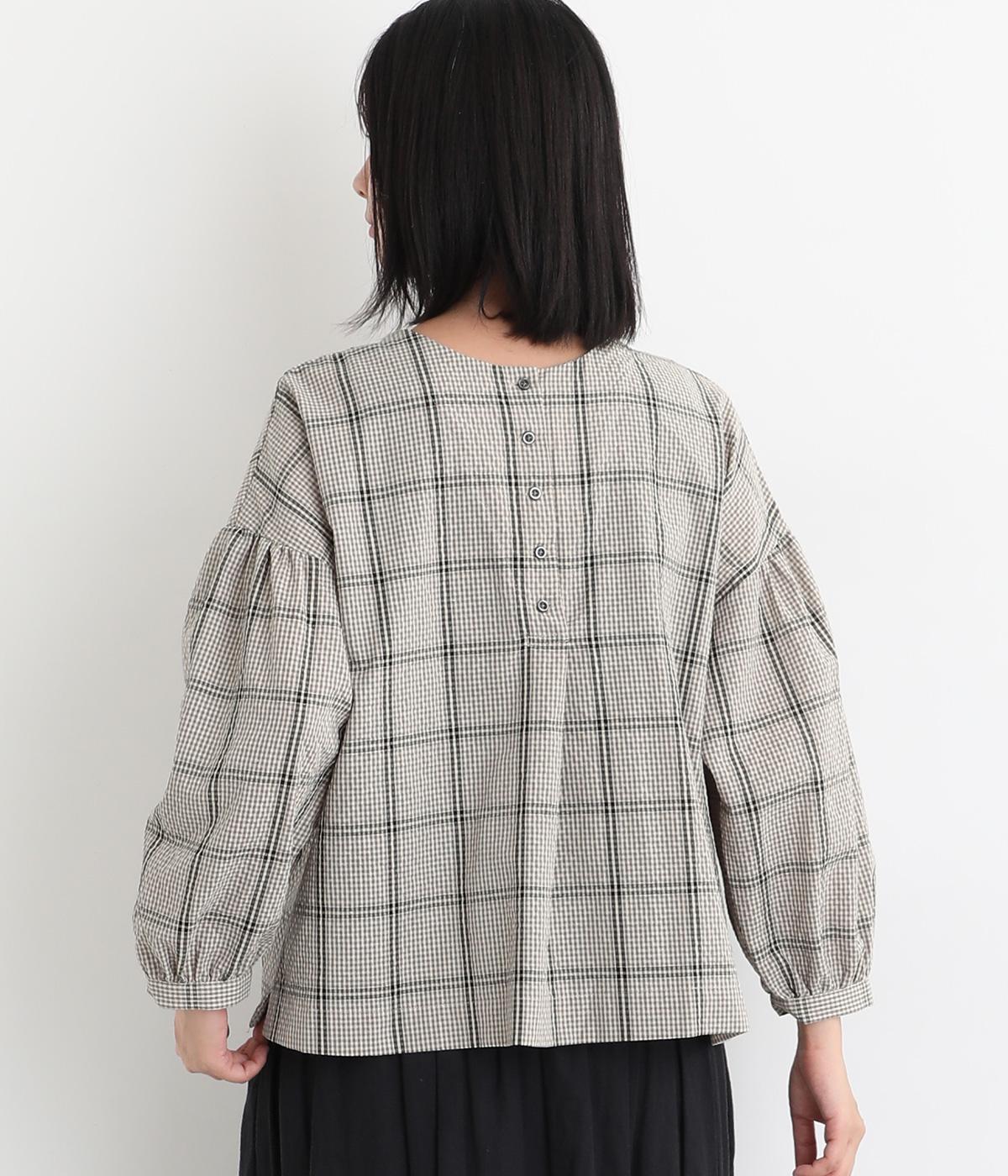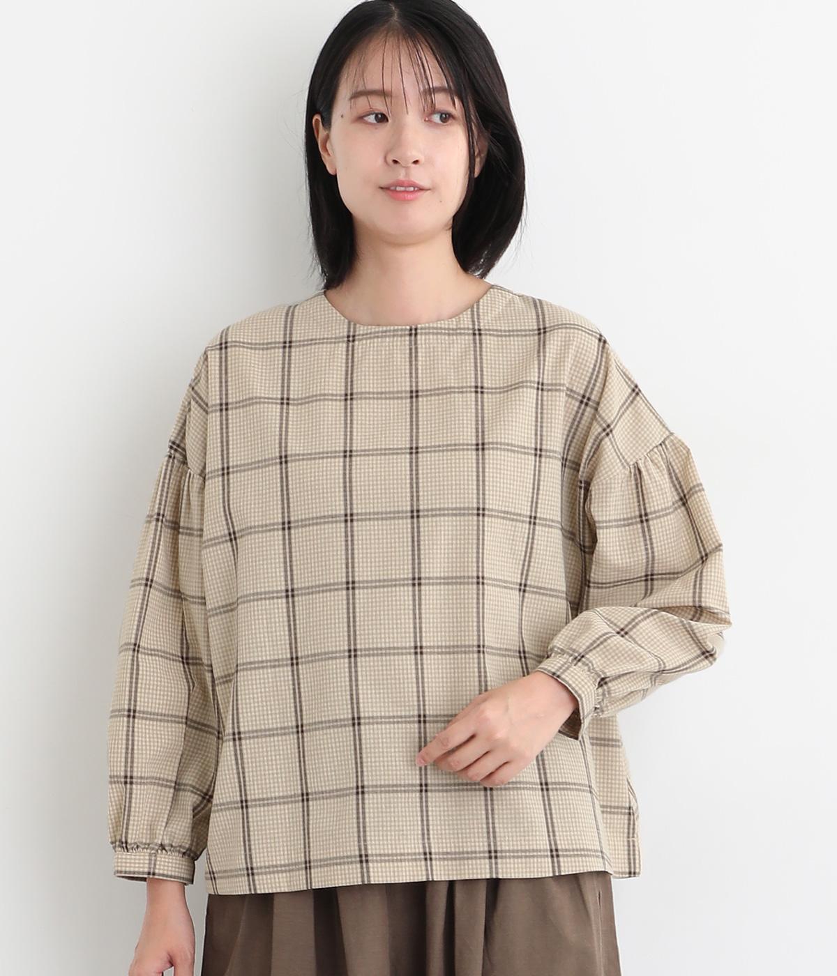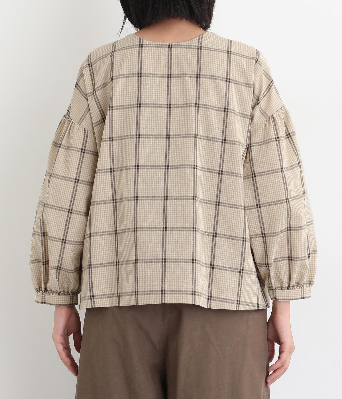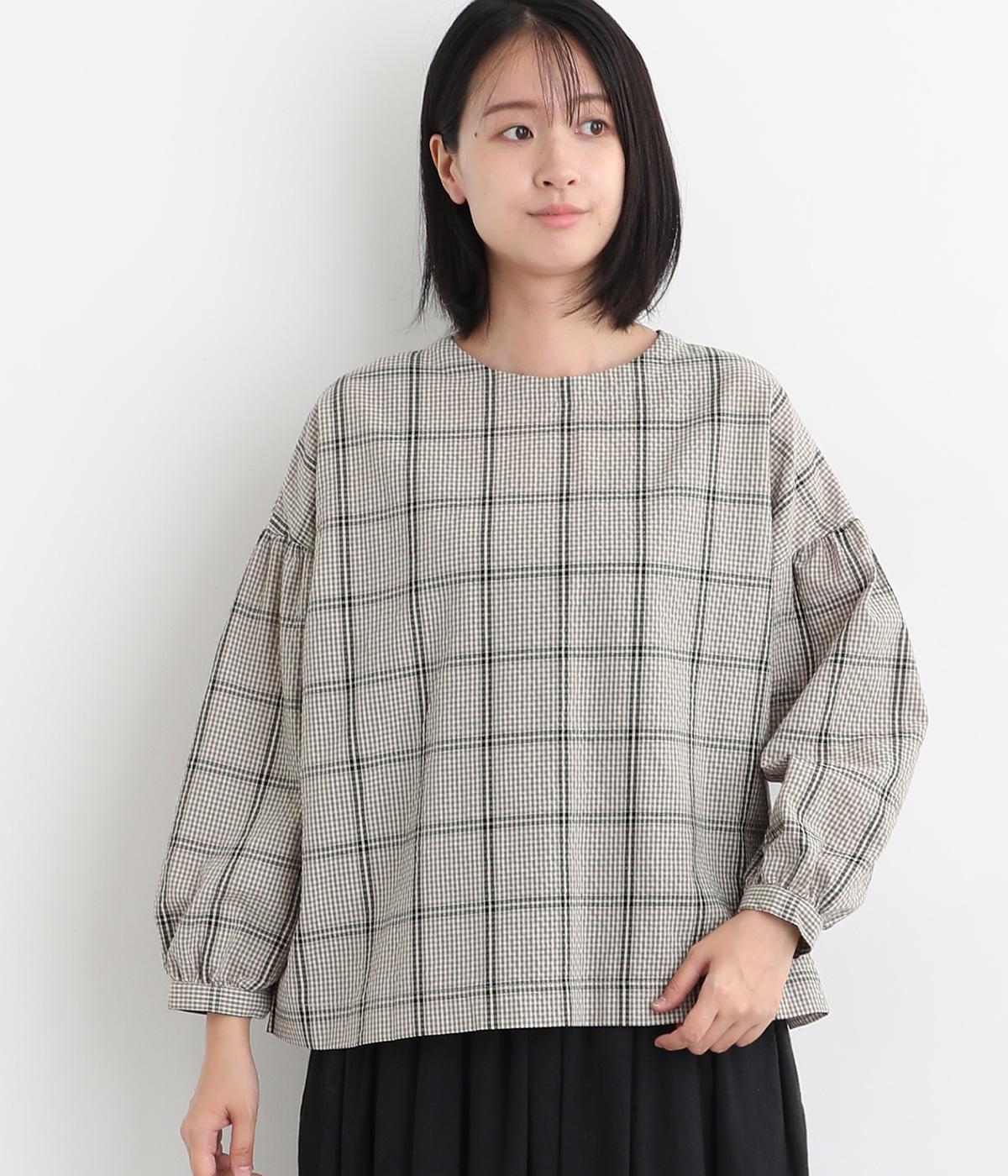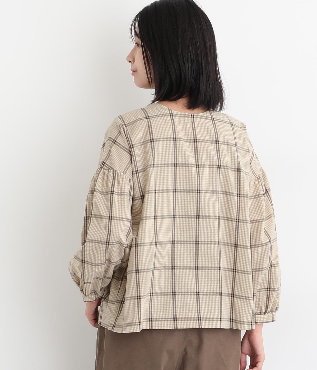 ラウンドネックのプルオーバーとヘンリーネック、印象の異なる前後着用可能な2wayブラウスです。着こなしのポイントになるチェック柄生地で、シンプルなボトム合わせもおしゃれ見えを叶えます。ギャザーを寄せてふわりとした袖も◎。