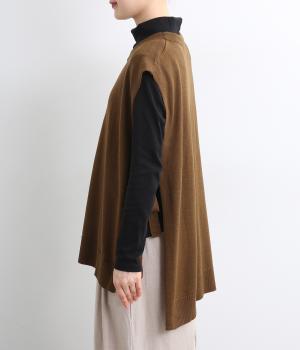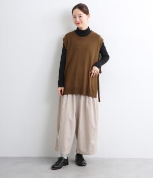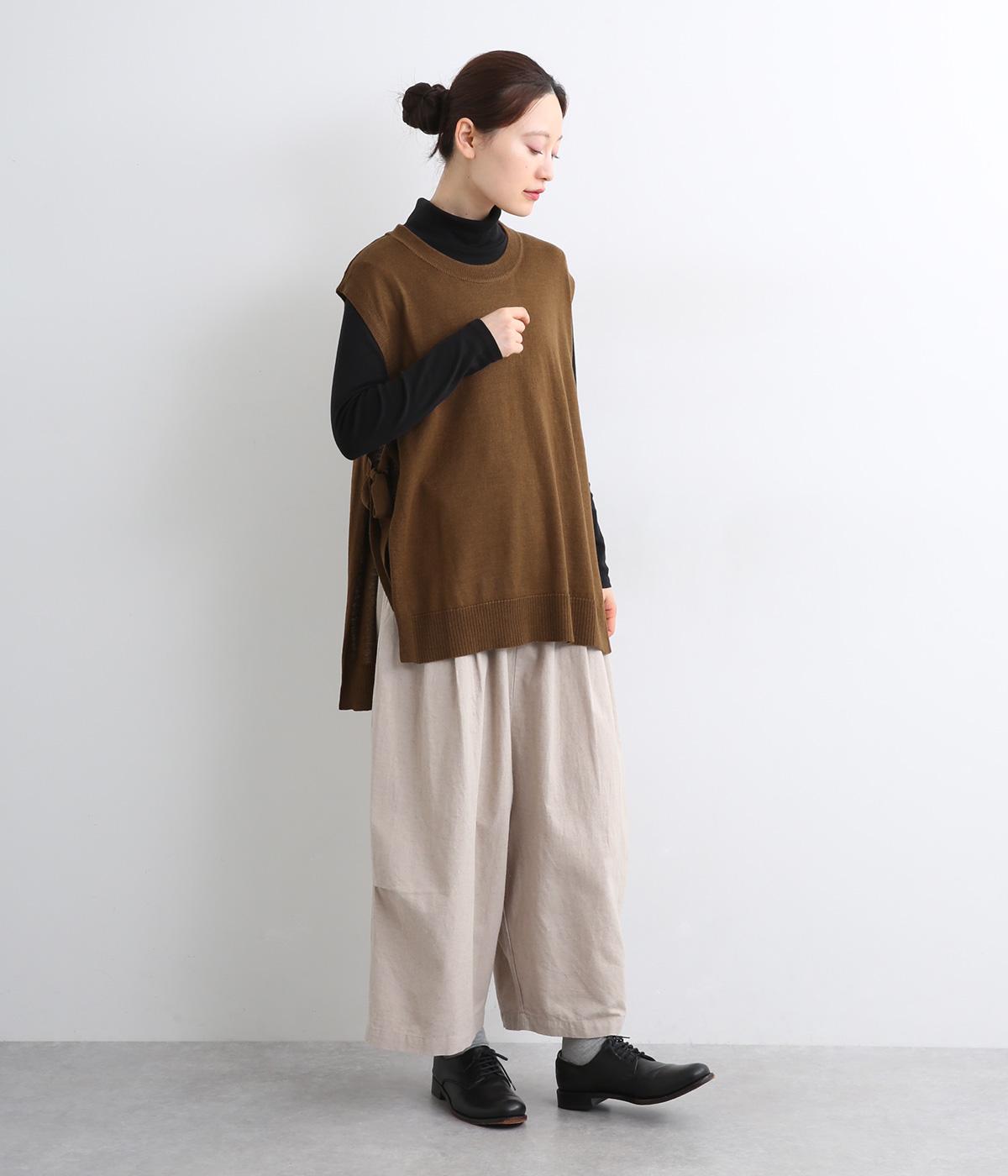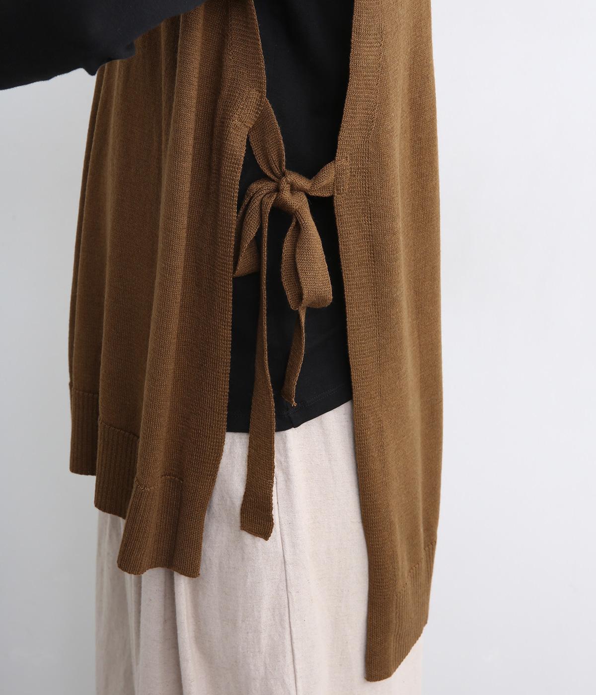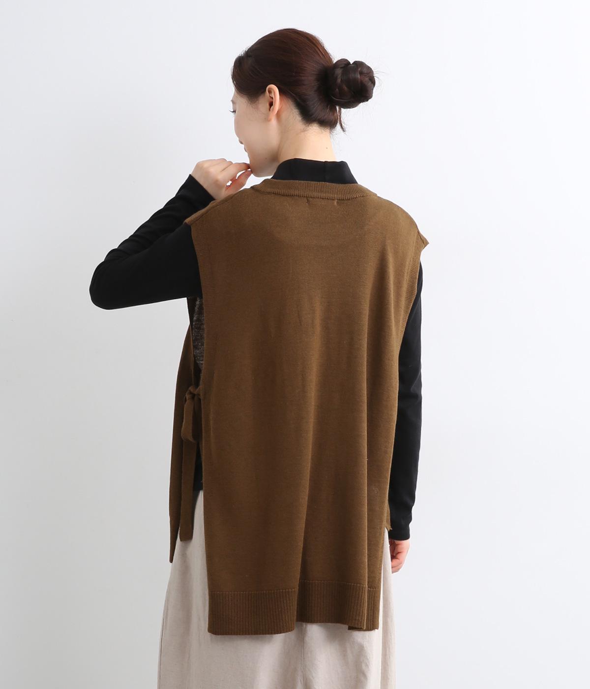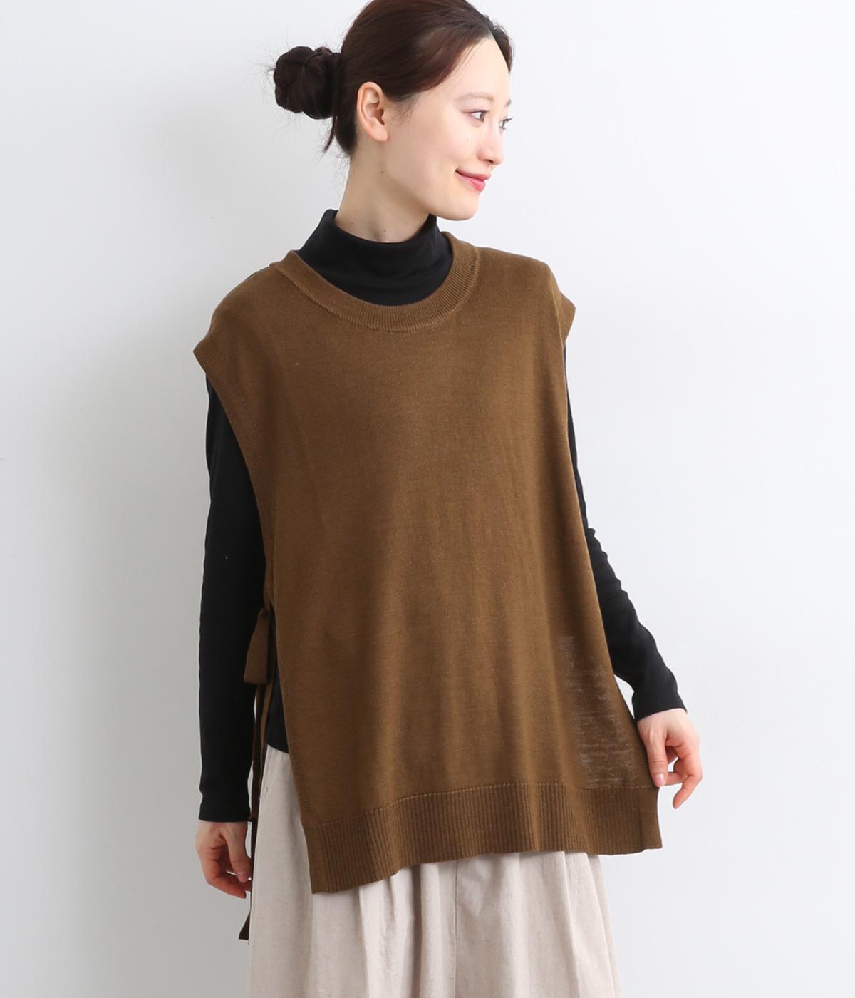 サイドがリボン結びのハイゲージベストです。ワンピースやゆったりしたデザインのアイテムとの重ね着もおすすめです。首と裾のリブがカジュアルさを演出し、幅広い着こなしが叶います。前後差のある裾で体型カバーも◎。