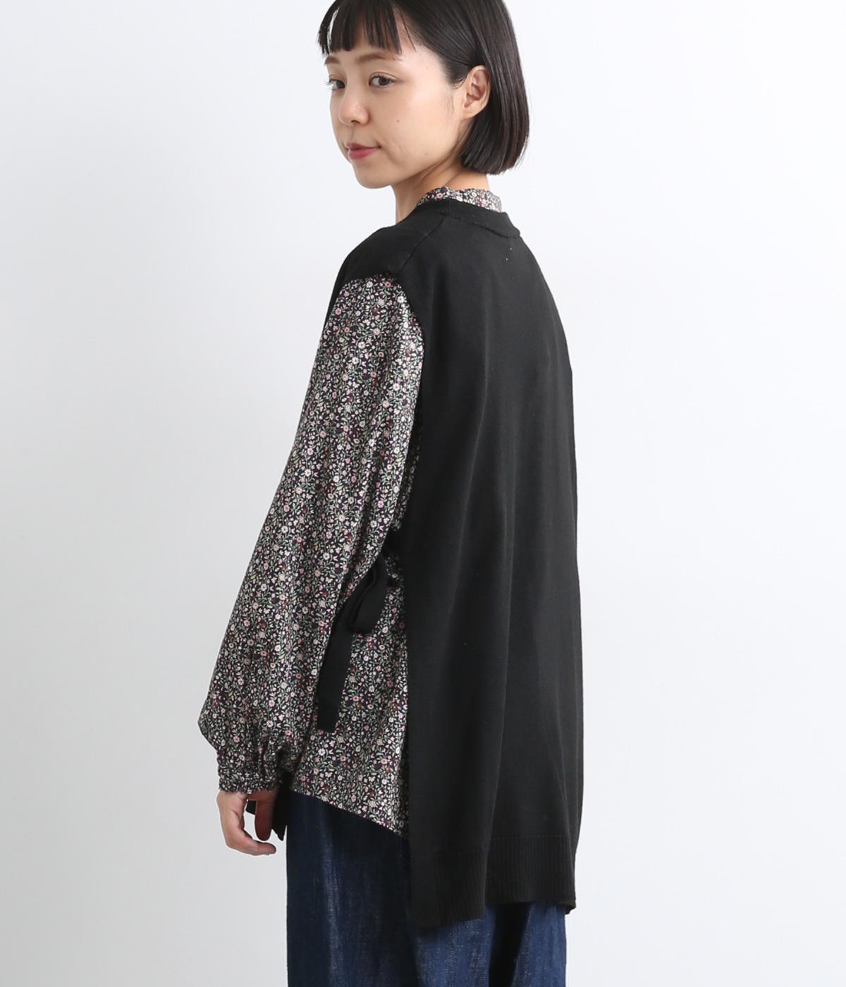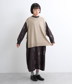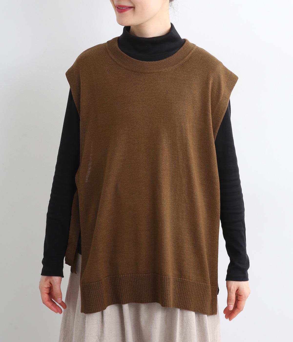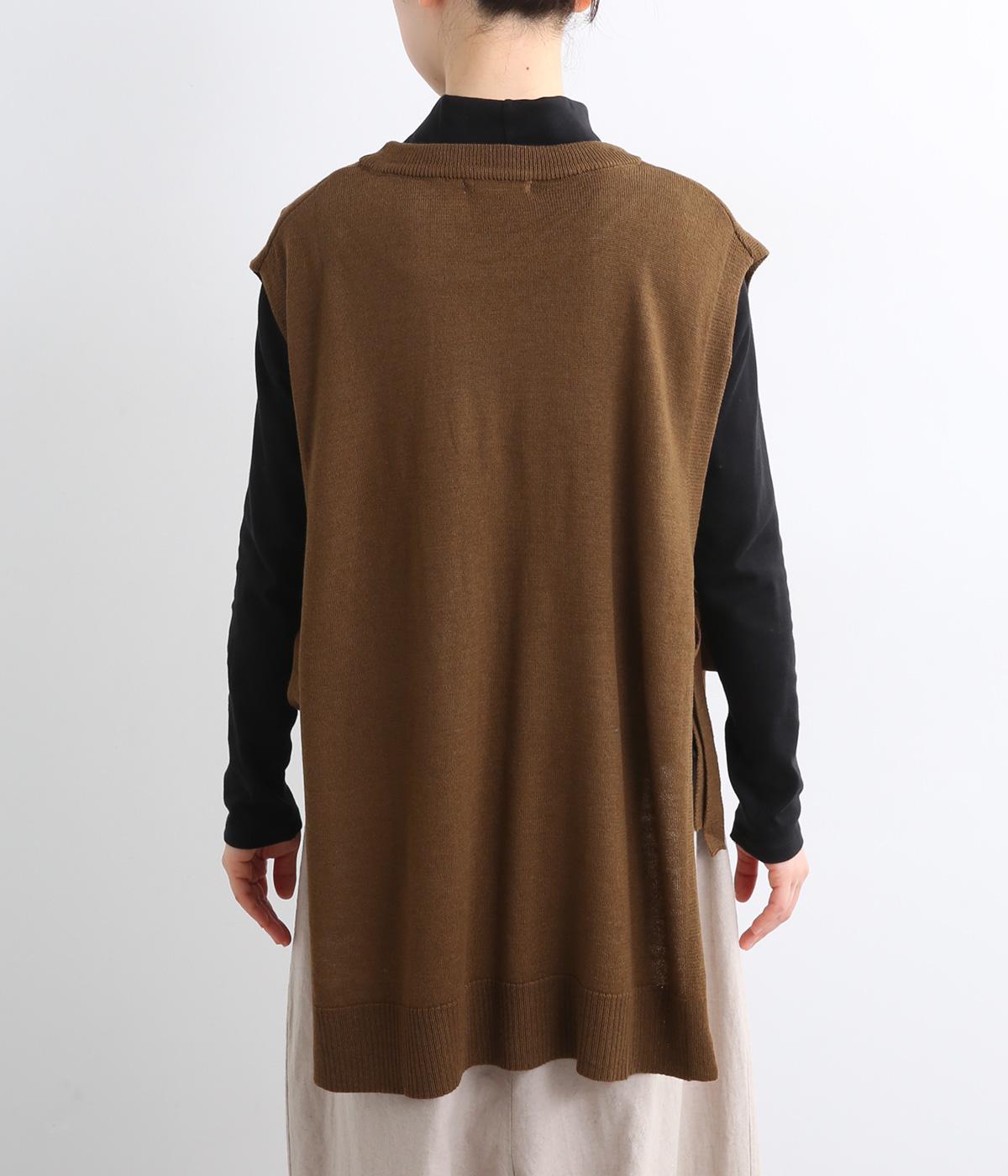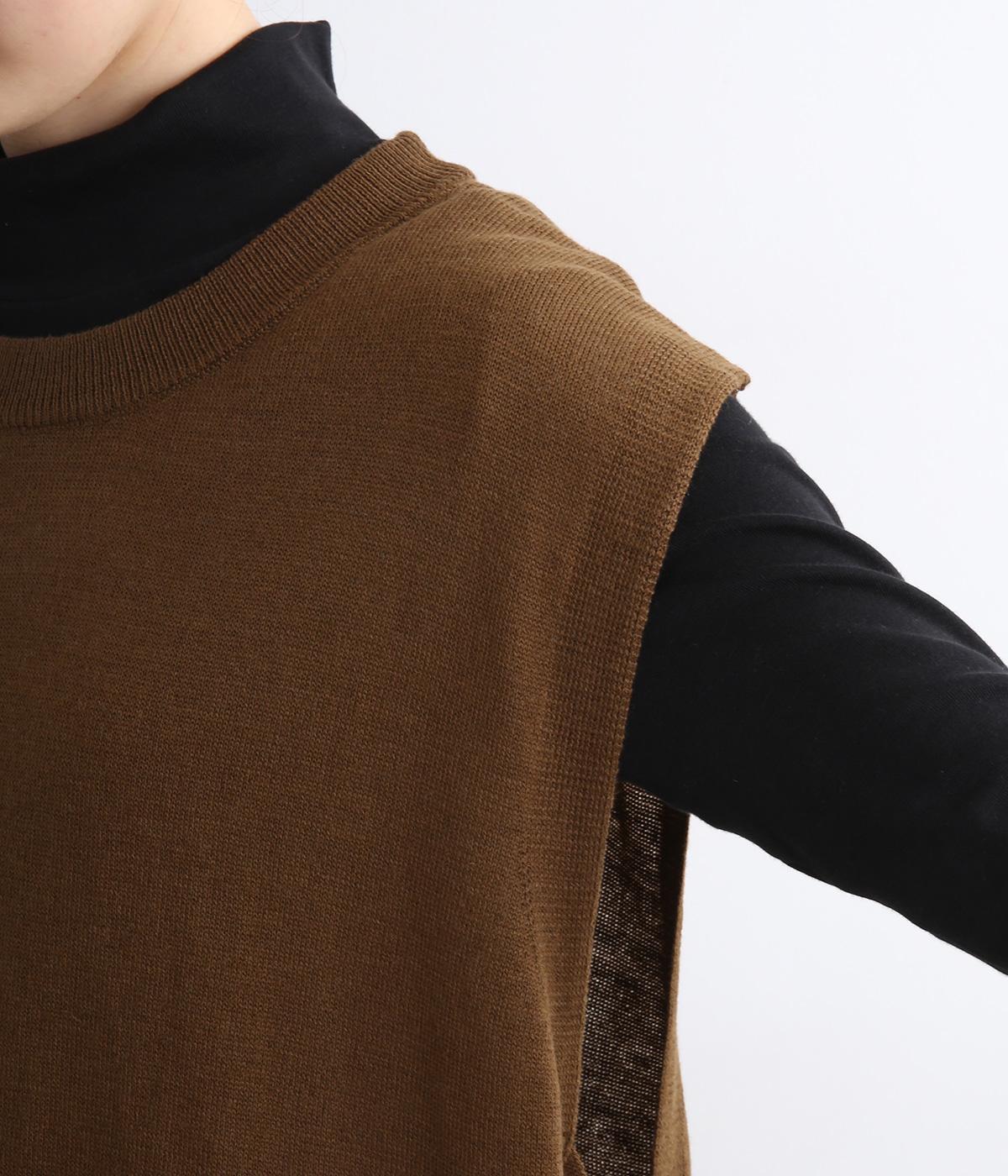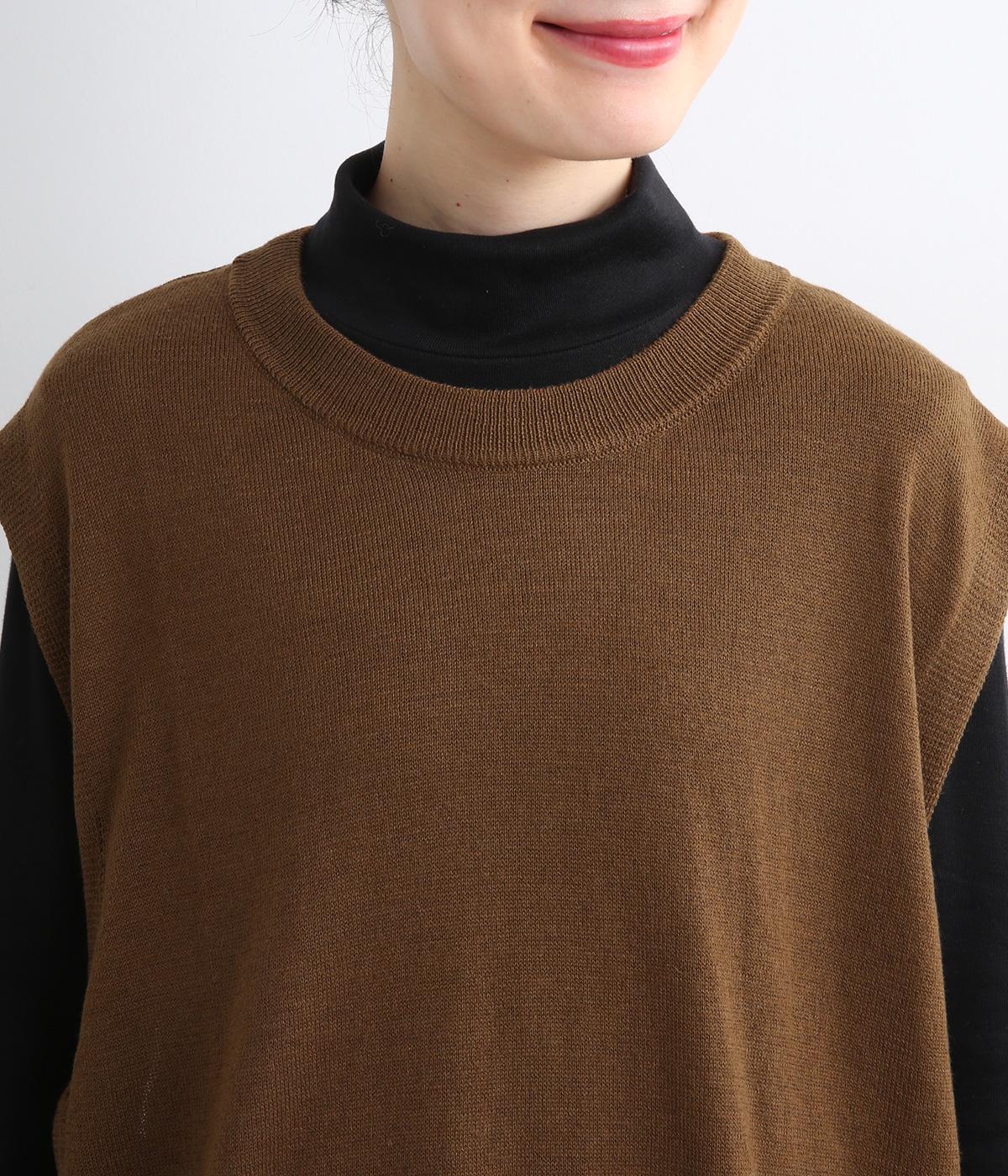 サイドがリボン結びのハイゲージベストです。ワンピースやゆったりしたデザインのアイテムとの重ね着もおすすめです。首と裾のリブがカジュアルさを演出し、幅広い着こなしが叶います。前後差のある裾で体型カバーも◎。