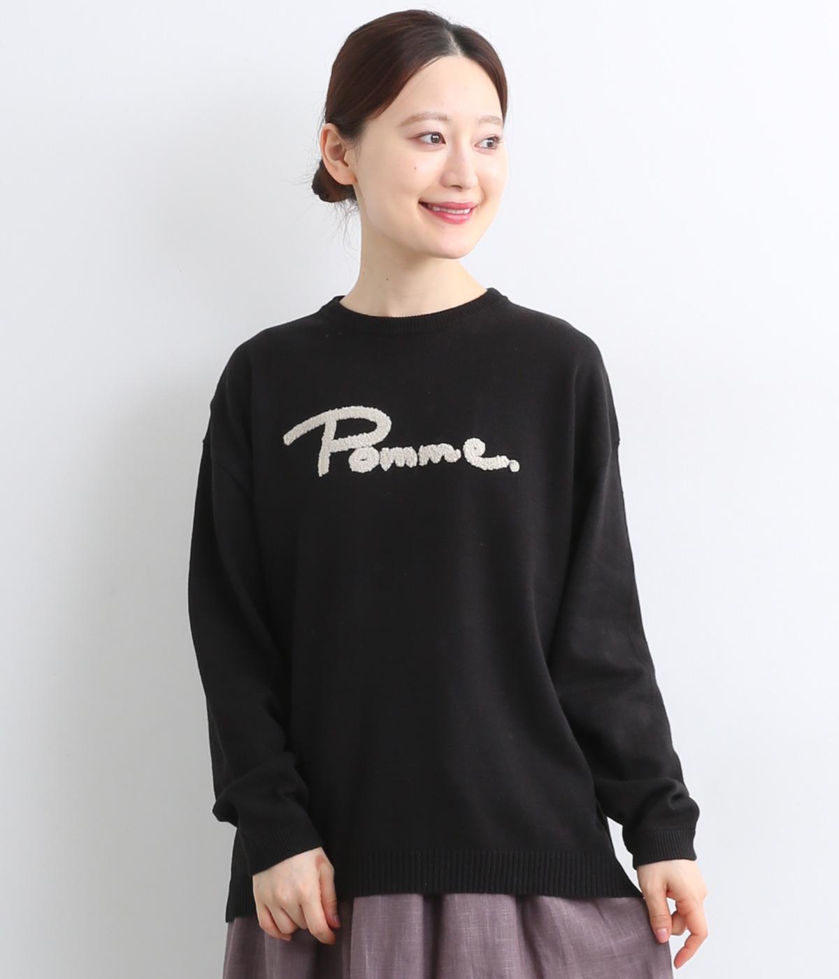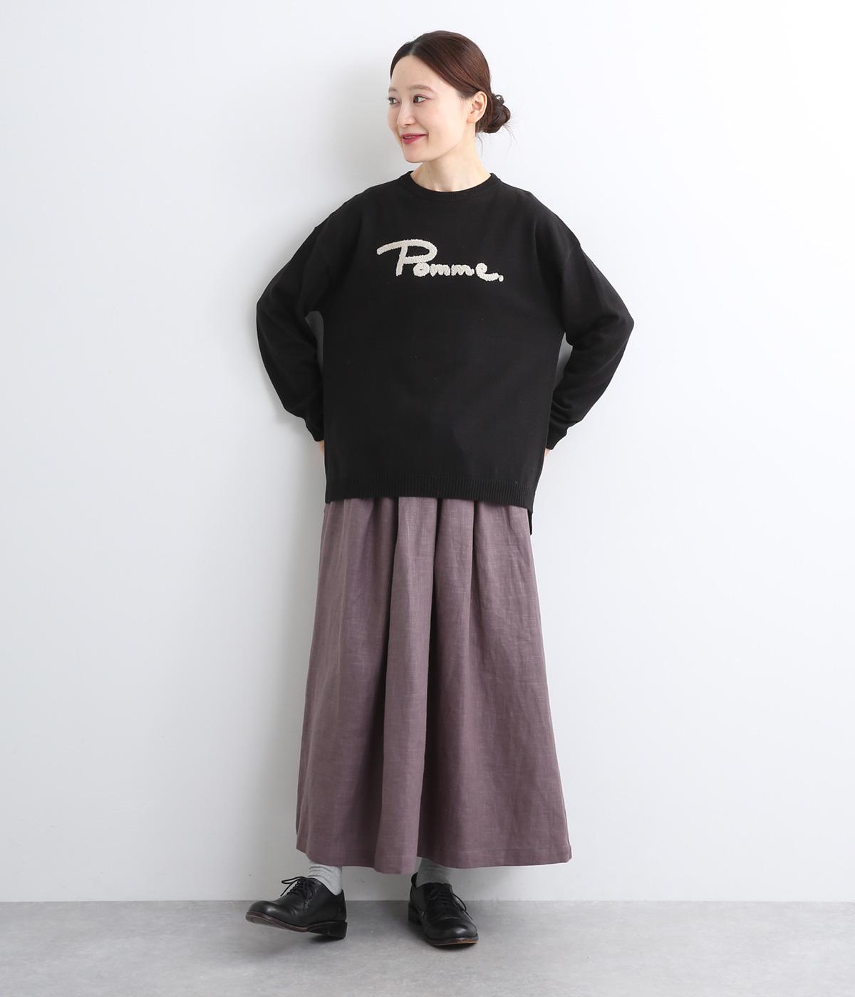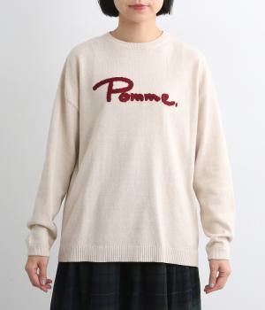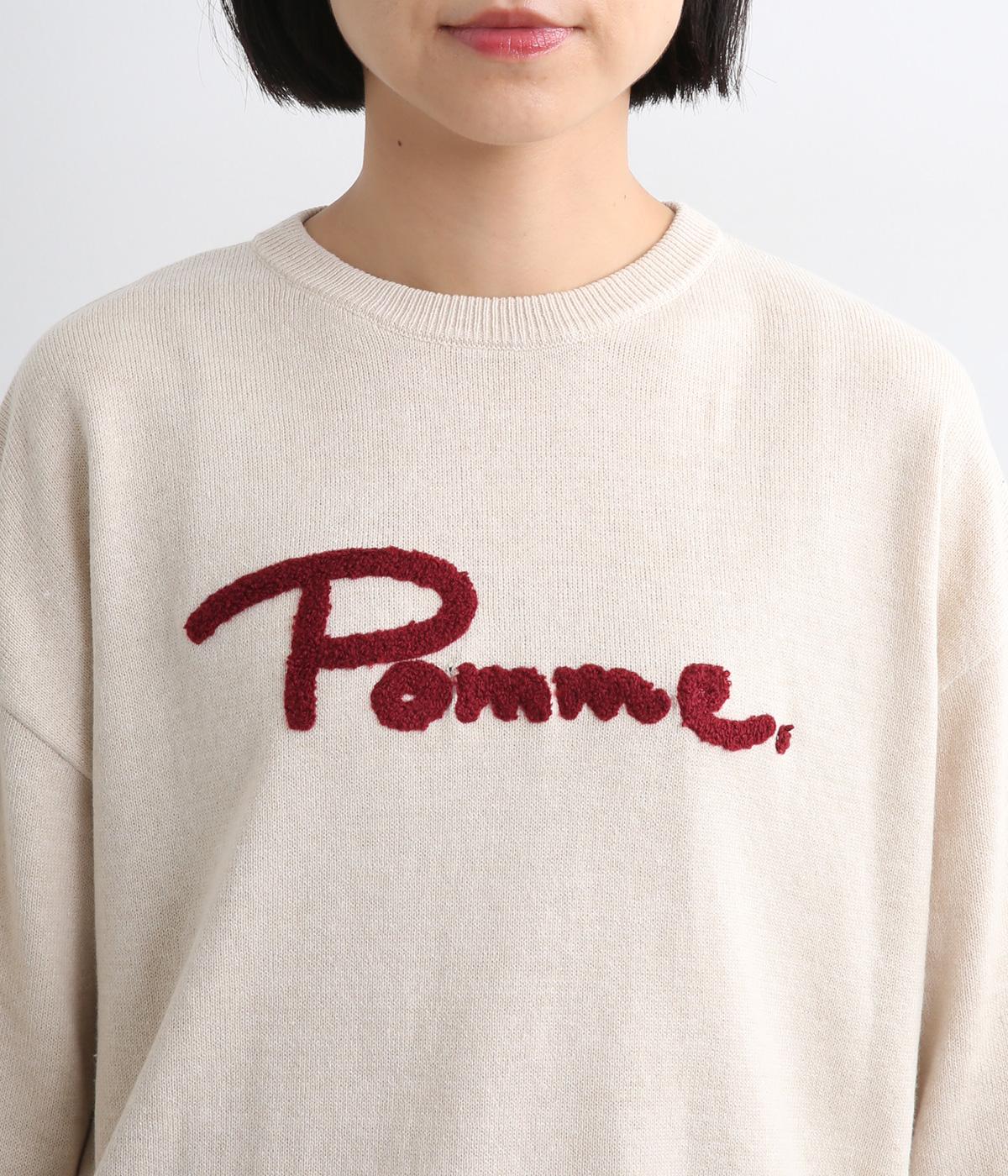 もこもこした立体感の刺しゅうが目をひくクルーネックプルオーバーです。モチーフのPommeはフランス語でリンゴを意味します。カジュアルな雰囲気に、裾のスリットやドロップショルダーで女性らしさをプラスしました。