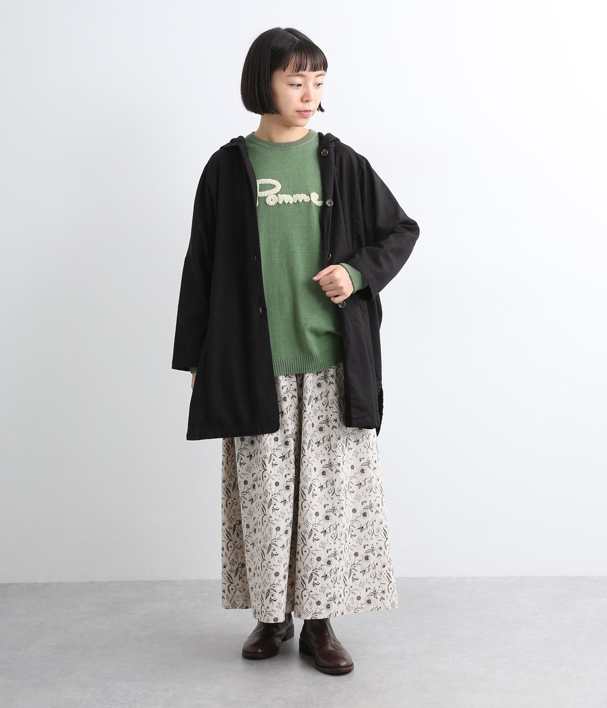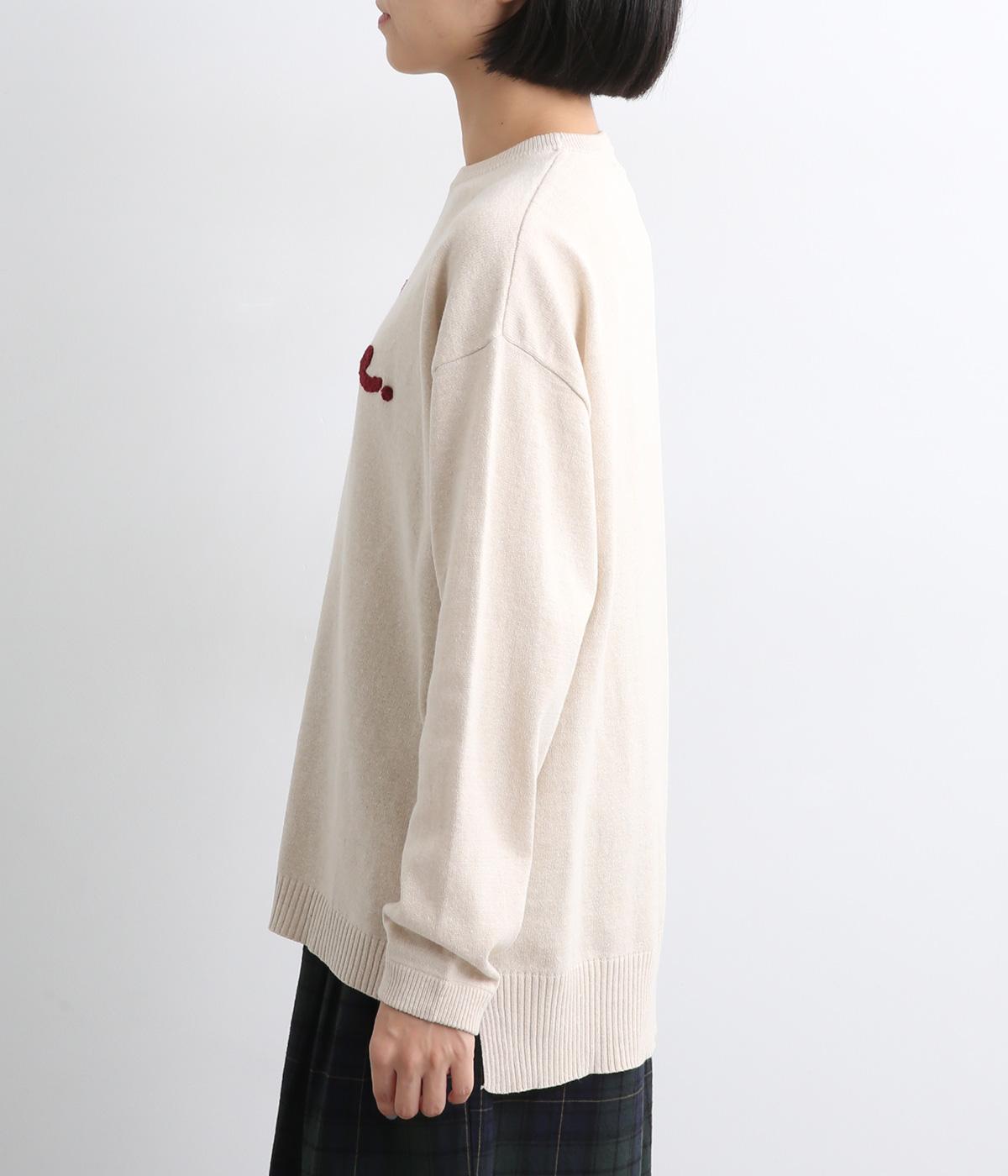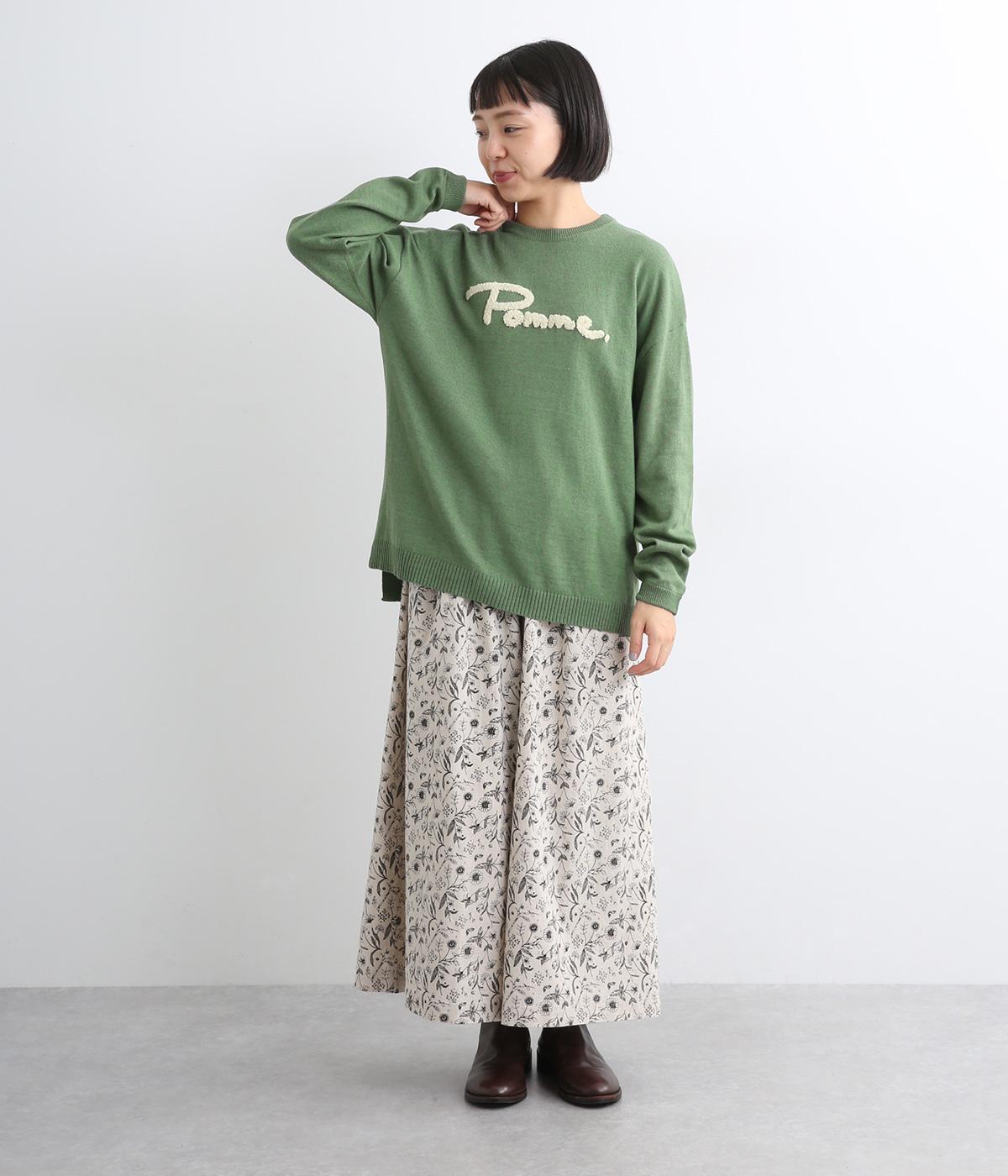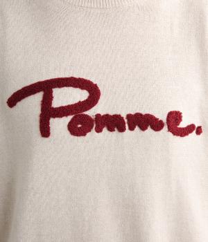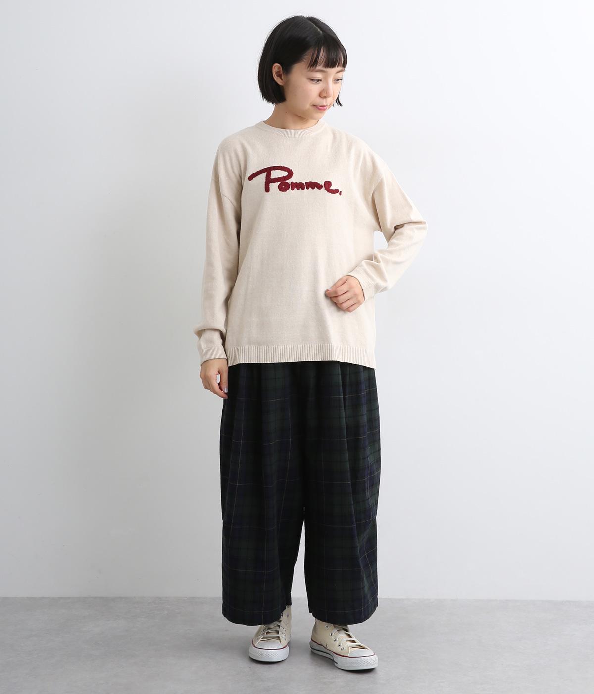 もこもこした立体感の刺しゅうが目をひくクルーネックプルオーバーです。モチーフのPommeはフランス語でリンゴを意味します。カジュアルな雰囲気に、裾のスリットやドロップショルダーで女性らしさをプラスしました。