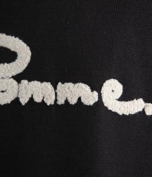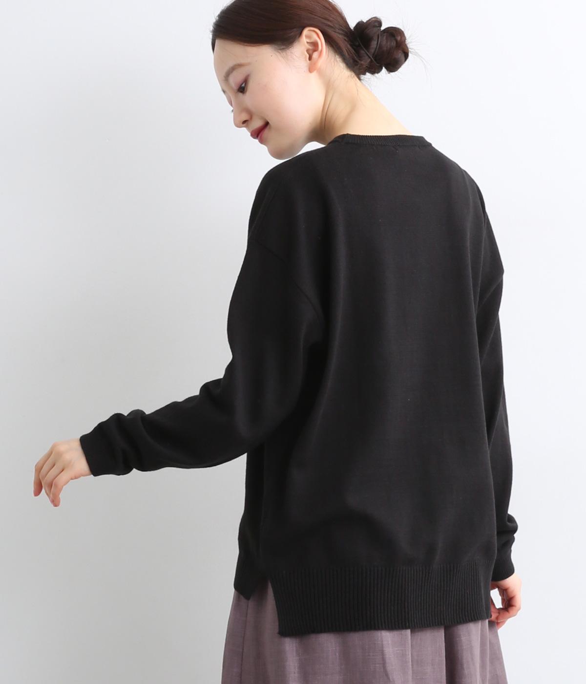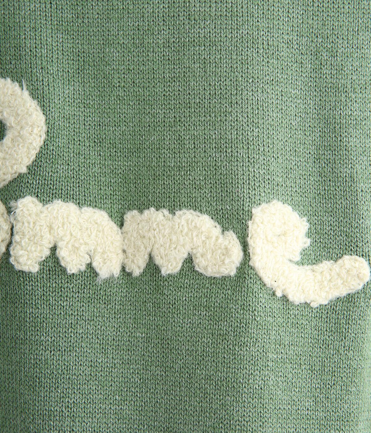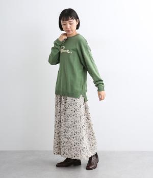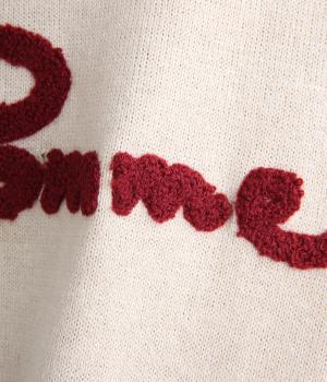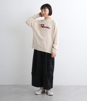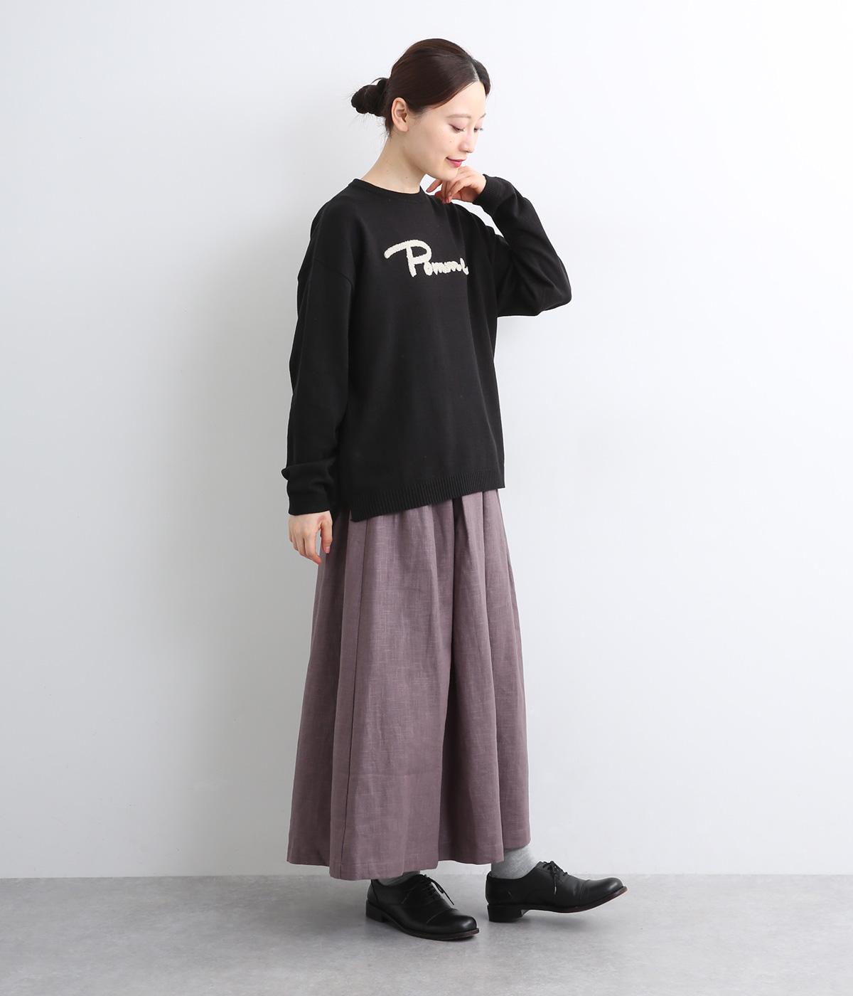 もこもこした立体感の刺しゅうが目をひくクルーネックプルオーバーです。モチーフのPommeはフランス語でリンゴを意味します。カジュアルな雰囲気に、裾のスリットやドロップショルダーで女性らしさをプラスしました。
