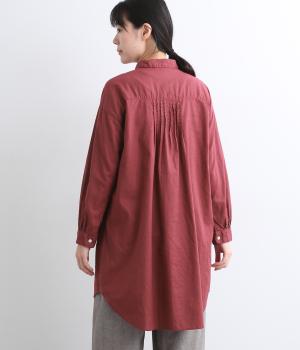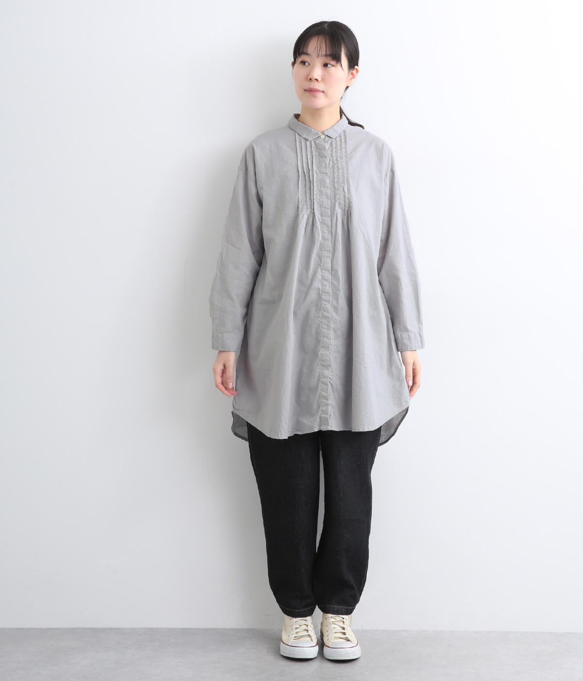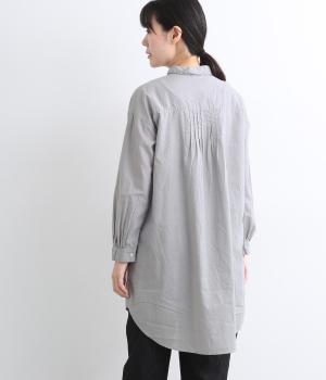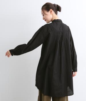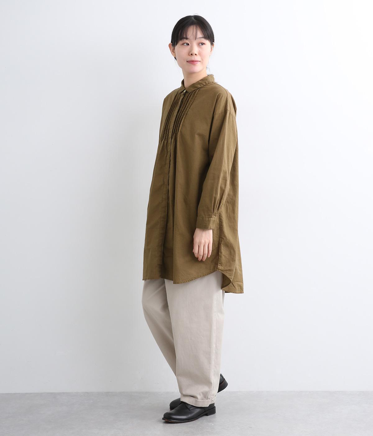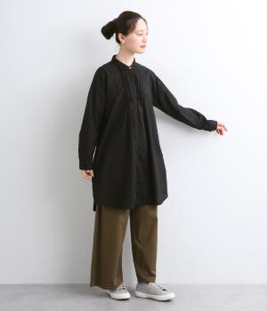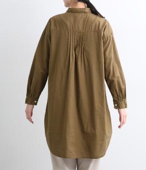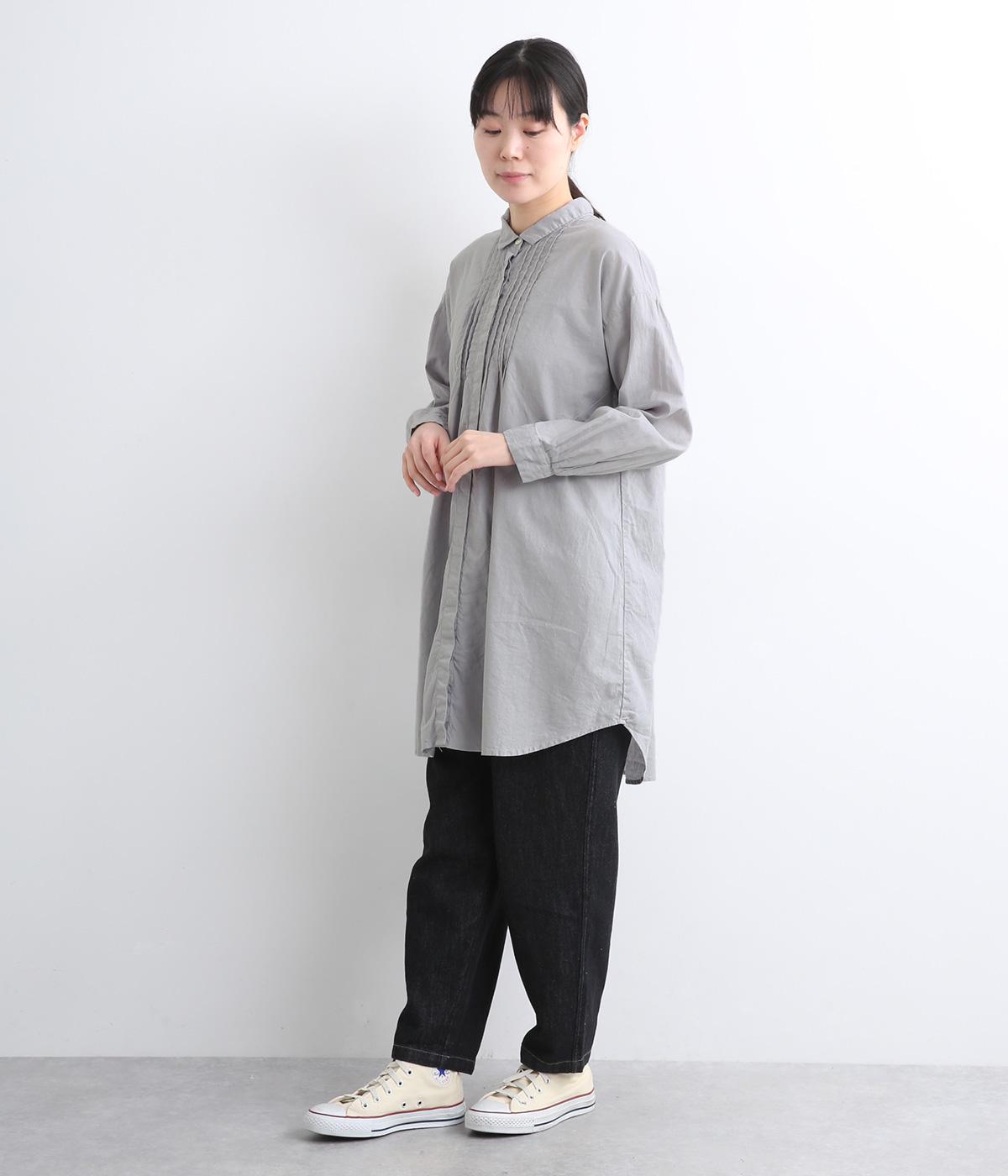 前後に入ったピンタックが目を惹くシャツチュニック。長め丈でほどよく広がるラインなので、腰まわりやヒップまわりをカバーしながらラフすぎない着こなしが叶います。小さめの襟で品よく見えるのもうれしい。