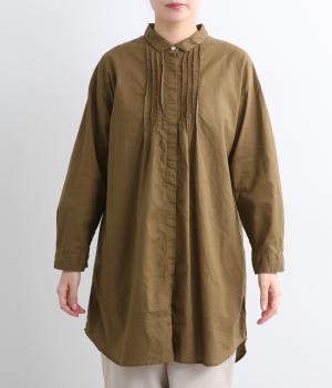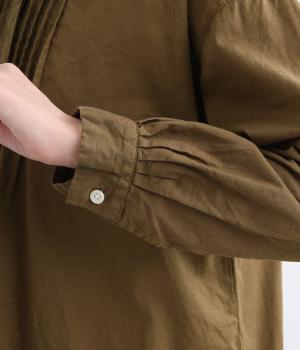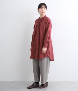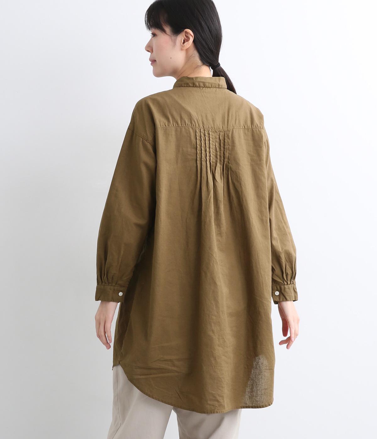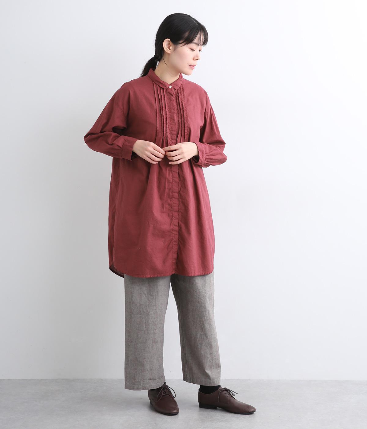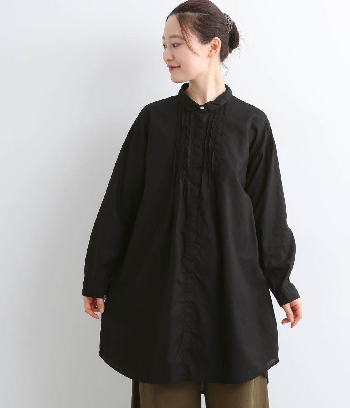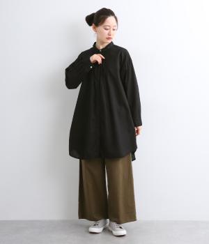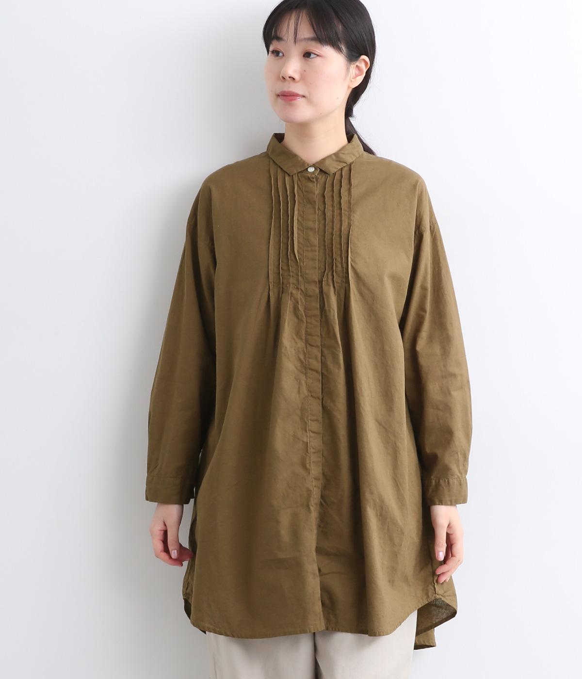 前後に入ったピンタックが目を惹くシャツチュニック。長め丈でほどよく広がるラインなので、腰まわりやヒップまわりをカバーしながらラフすぎない着こなしが叶います。小さめの襟で品よく見えるのもうれしい。