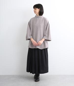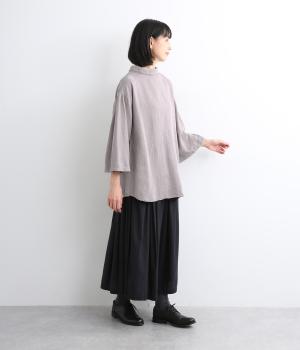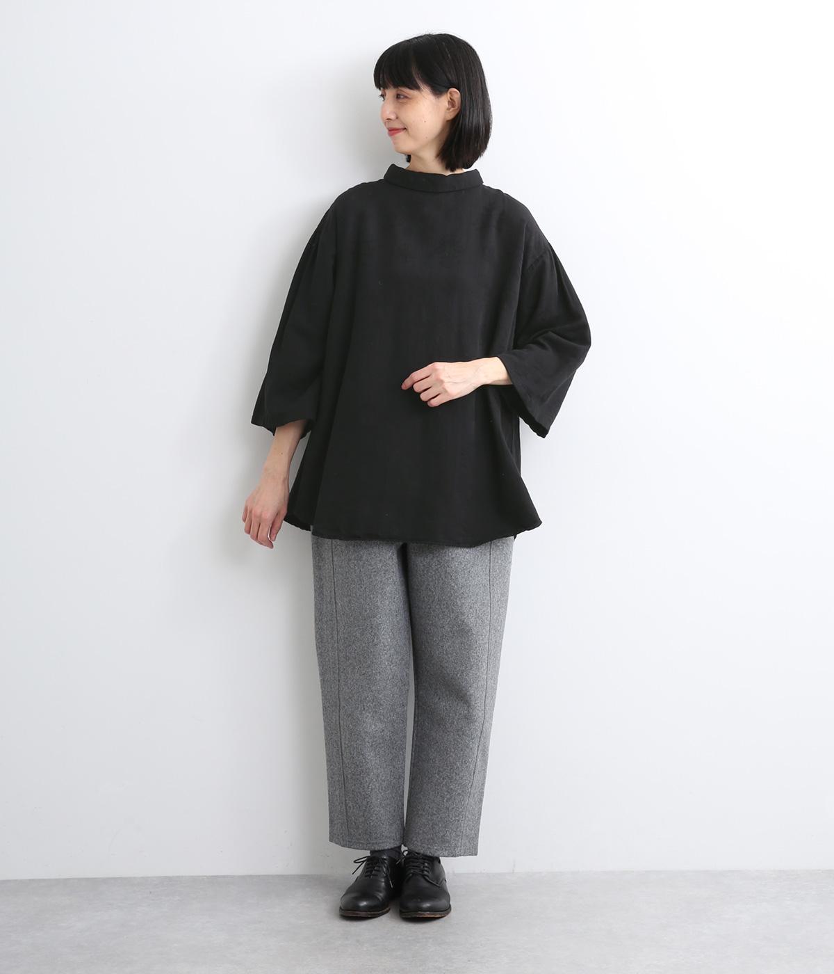 ゆったり広がる裾と袖のデザインが優雅なチュニックブラウス。ロールタイプのモックネックで顔まわりにニュアンスをつけました。9分袖で手元はすっきりと見せ、アクセサリーも映えます。襟つきボタンの後ろ姿もお洒落見え。