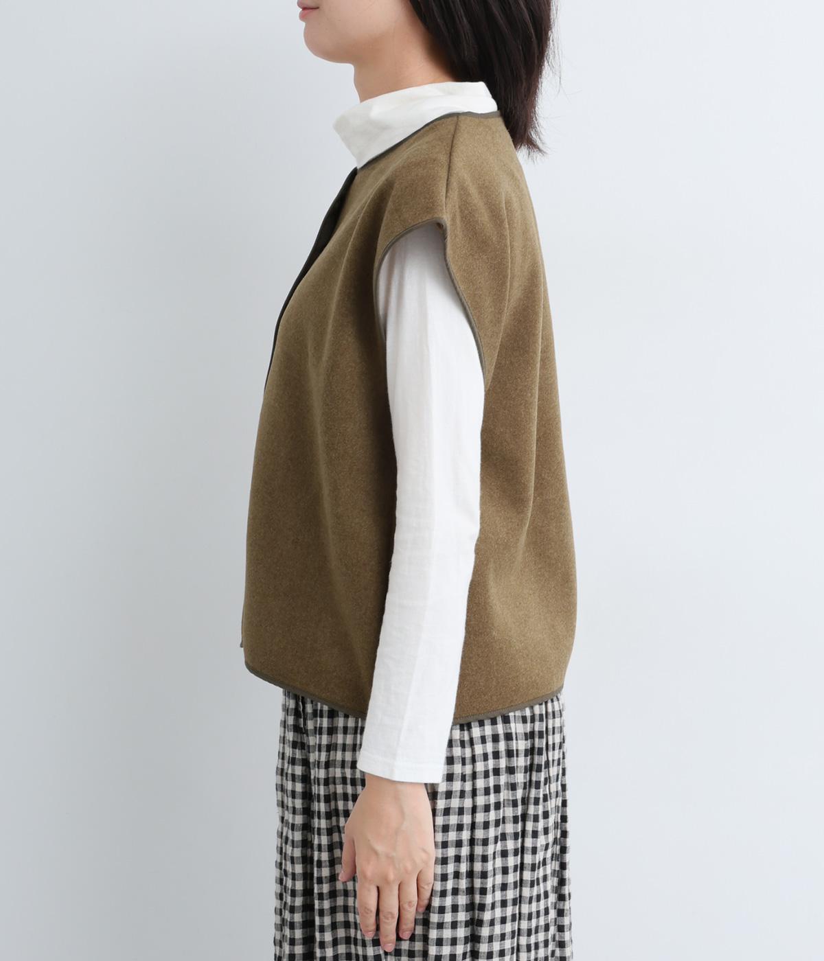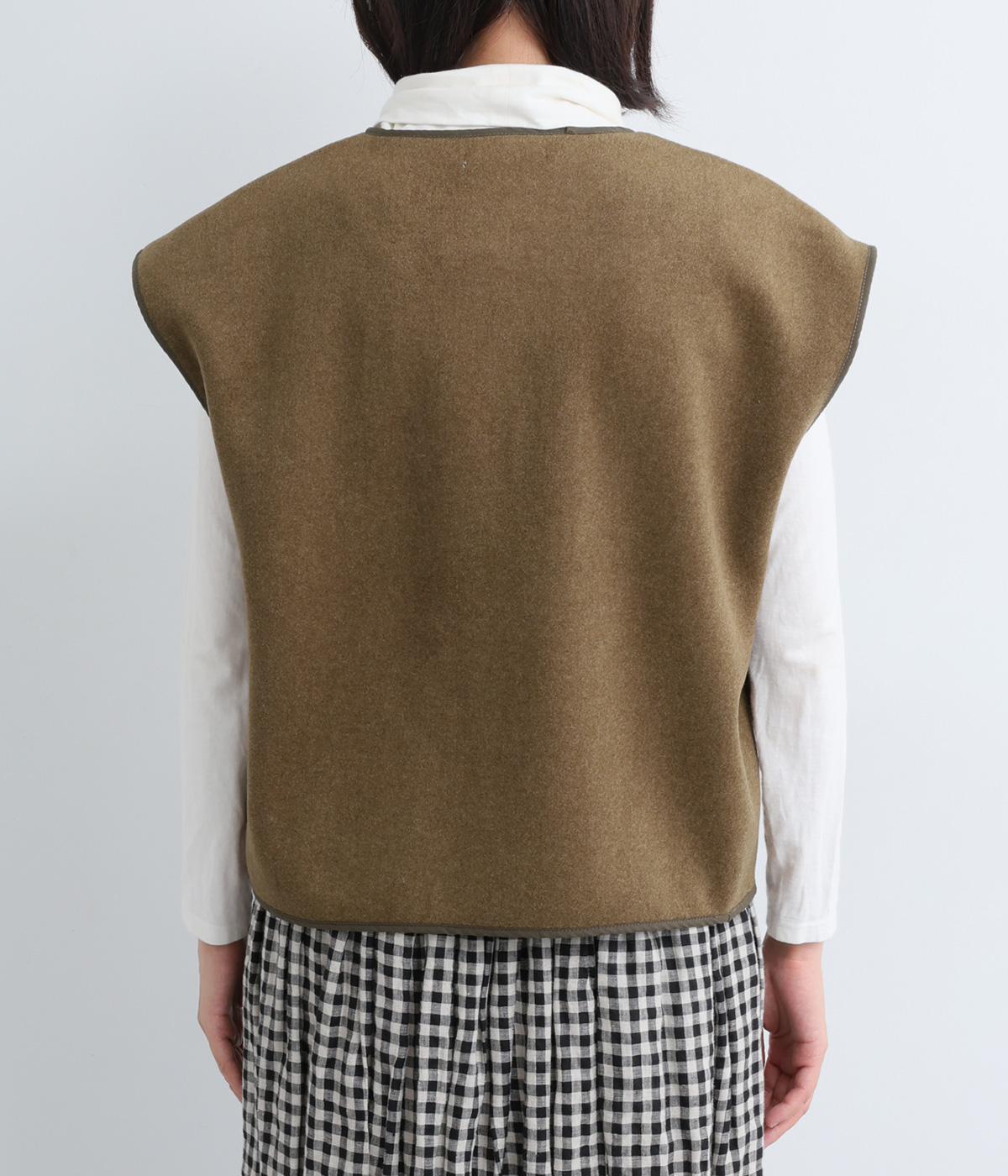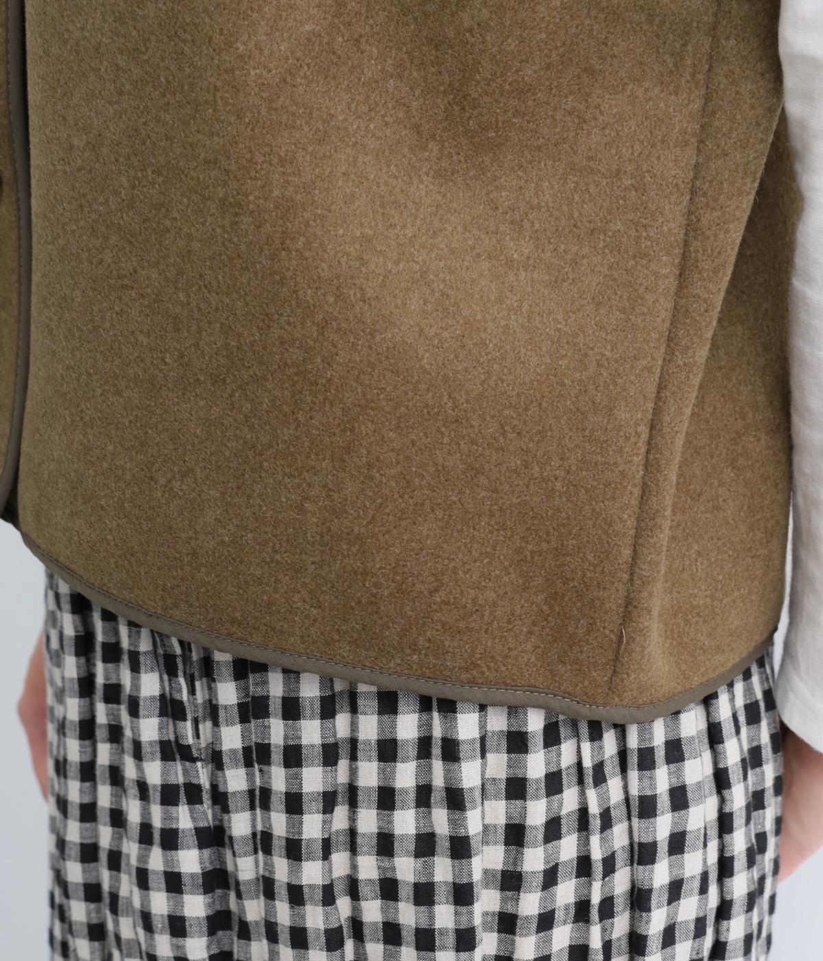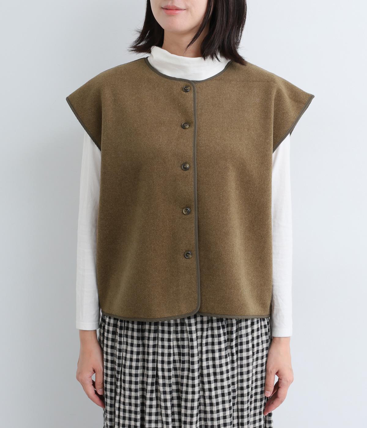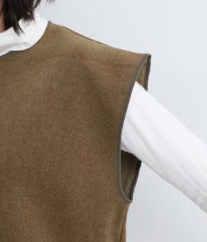 ゆとりのあるワイドなボックスシルエットのベストは、着用するとフレンチスリーブのようなポイントが生まれます。同色系のトリミングでさり気なくメリハリをつけながらも、シンプルでさまざまなスタイリングに取り入れやすい一枚。
