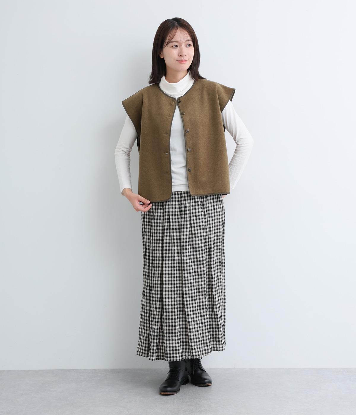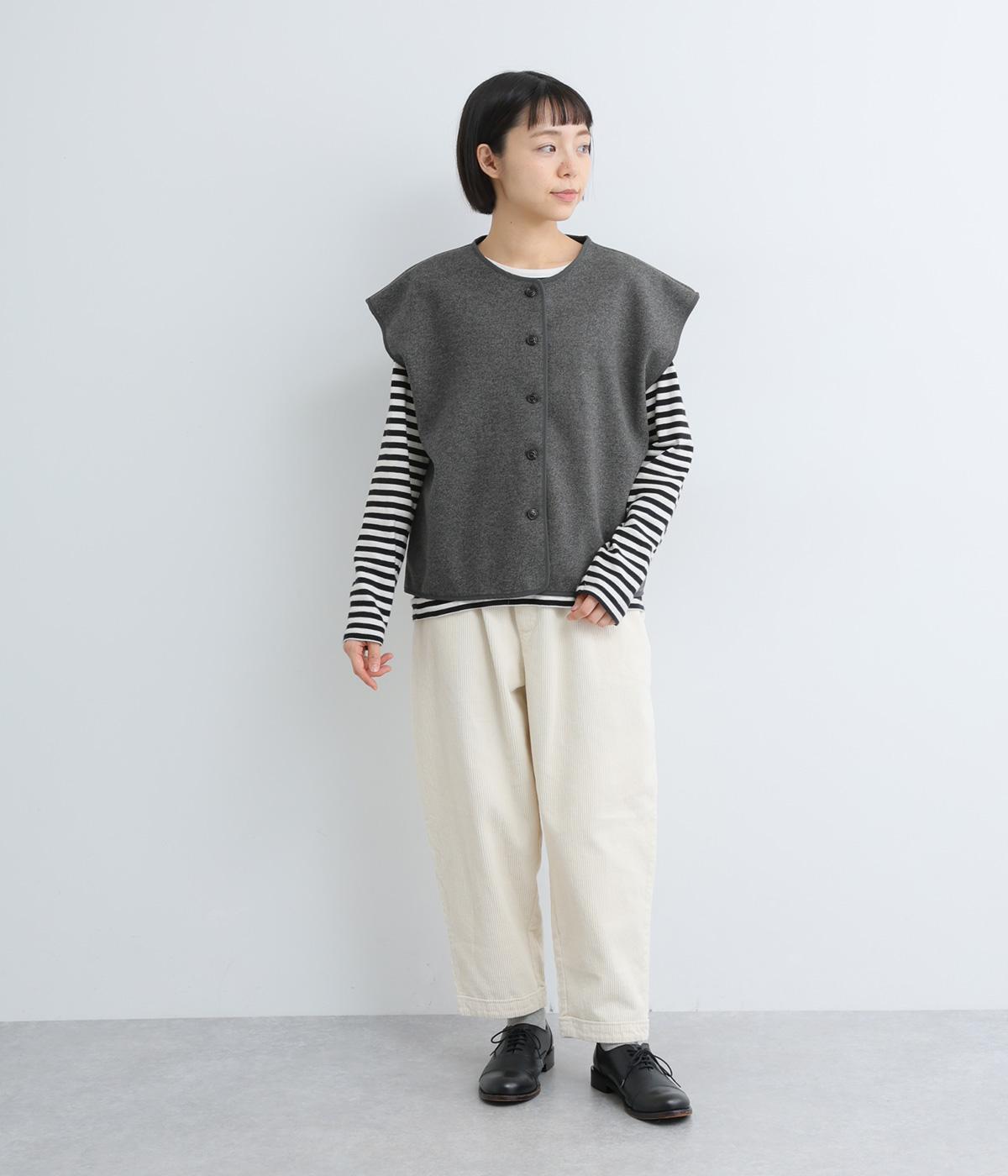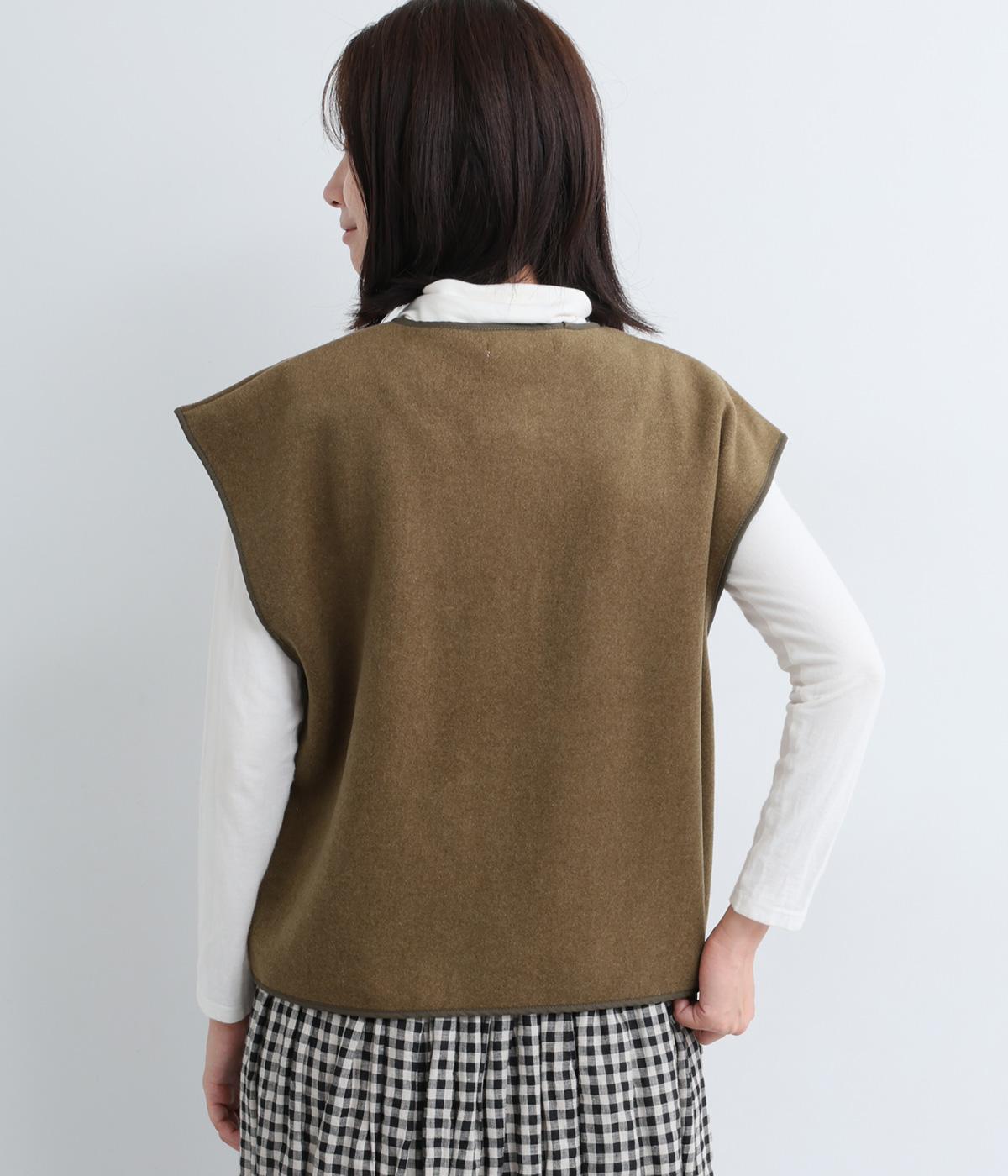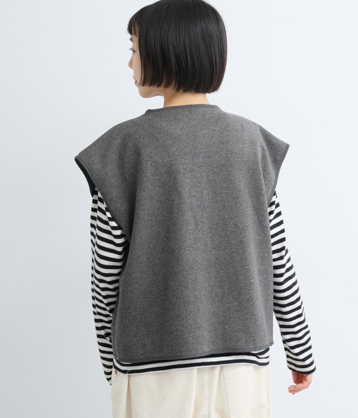 ゆとりのあるワイドなボックスシルエットのベストは、着用するとフレンチスリーブのようなポイントが生まれます。同色系のトリミングでさり気なくメリハリをつけながらも、シンプルでさまざまなスタイリングに取り入れやすい一枚。