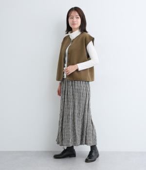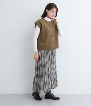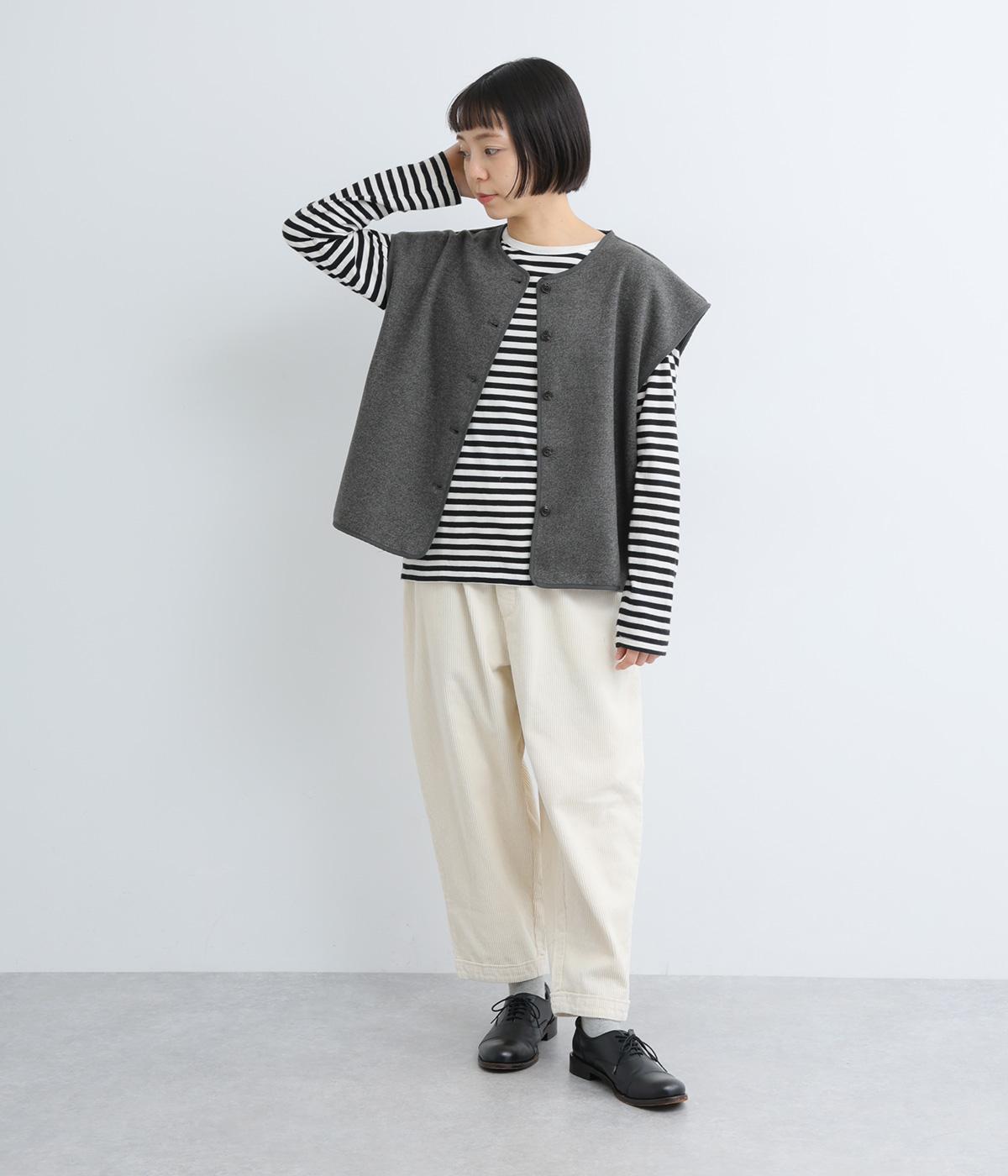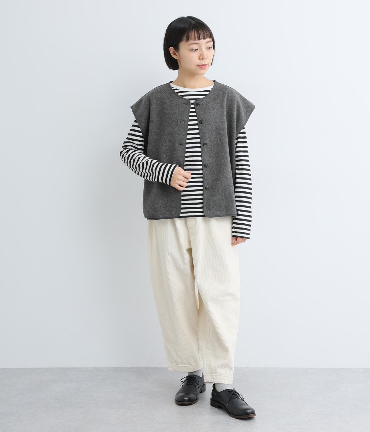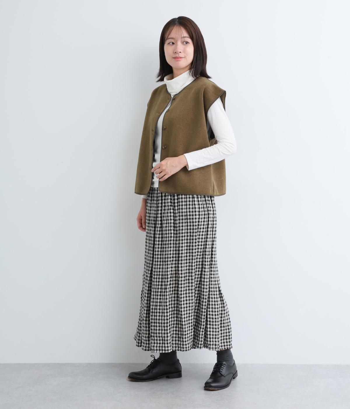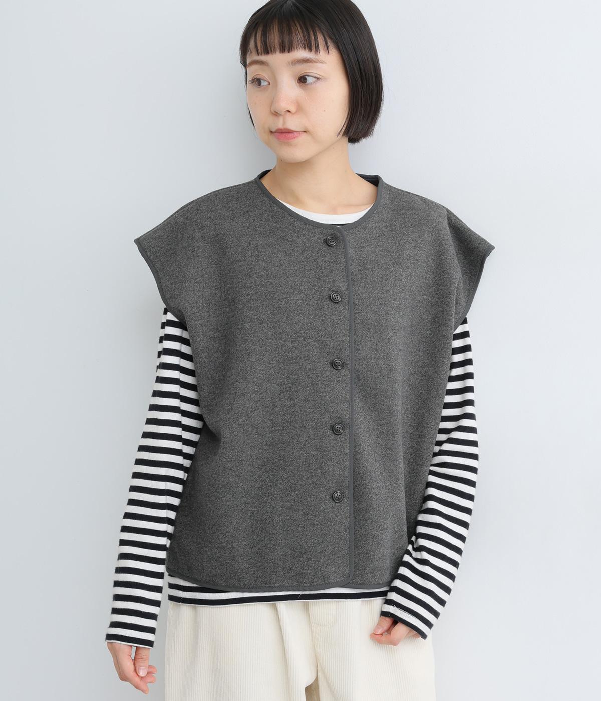 ゆとりのあるワイドなボックスシルエットのベストは、着用するとフレンチスリーブのようなポイントが生まれます。同色系のトリミングでさり気なくメリハリをつけながらも、シンプルでさまざまなスタイリングに取り入れやすい一枚。