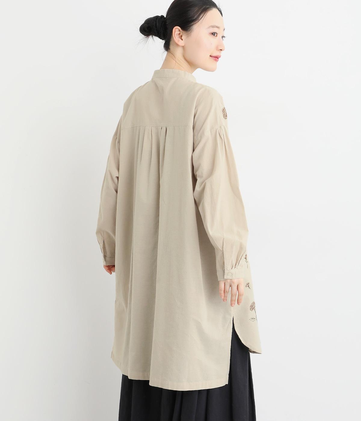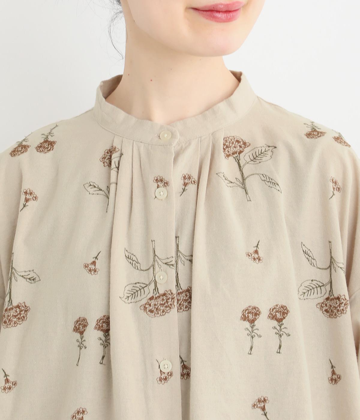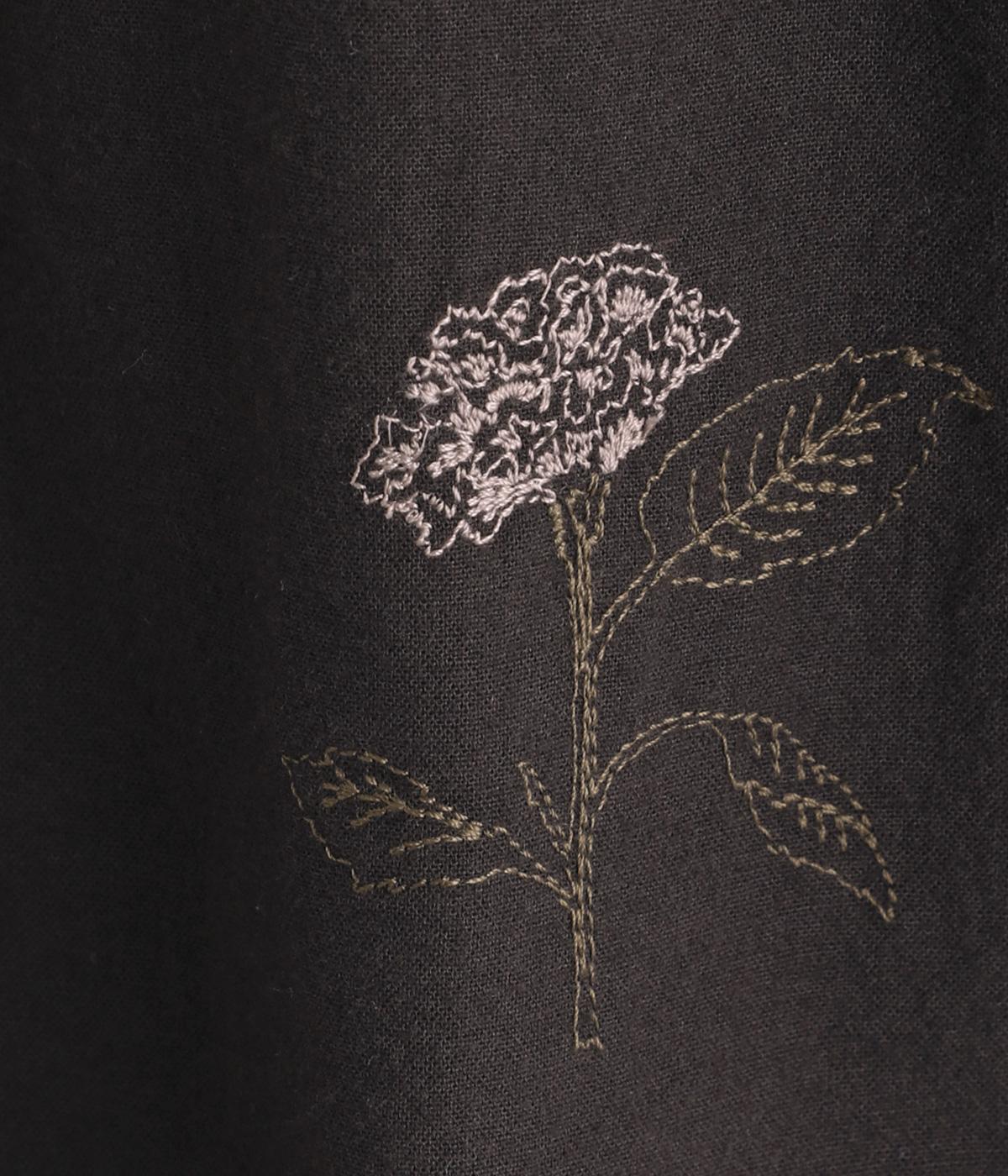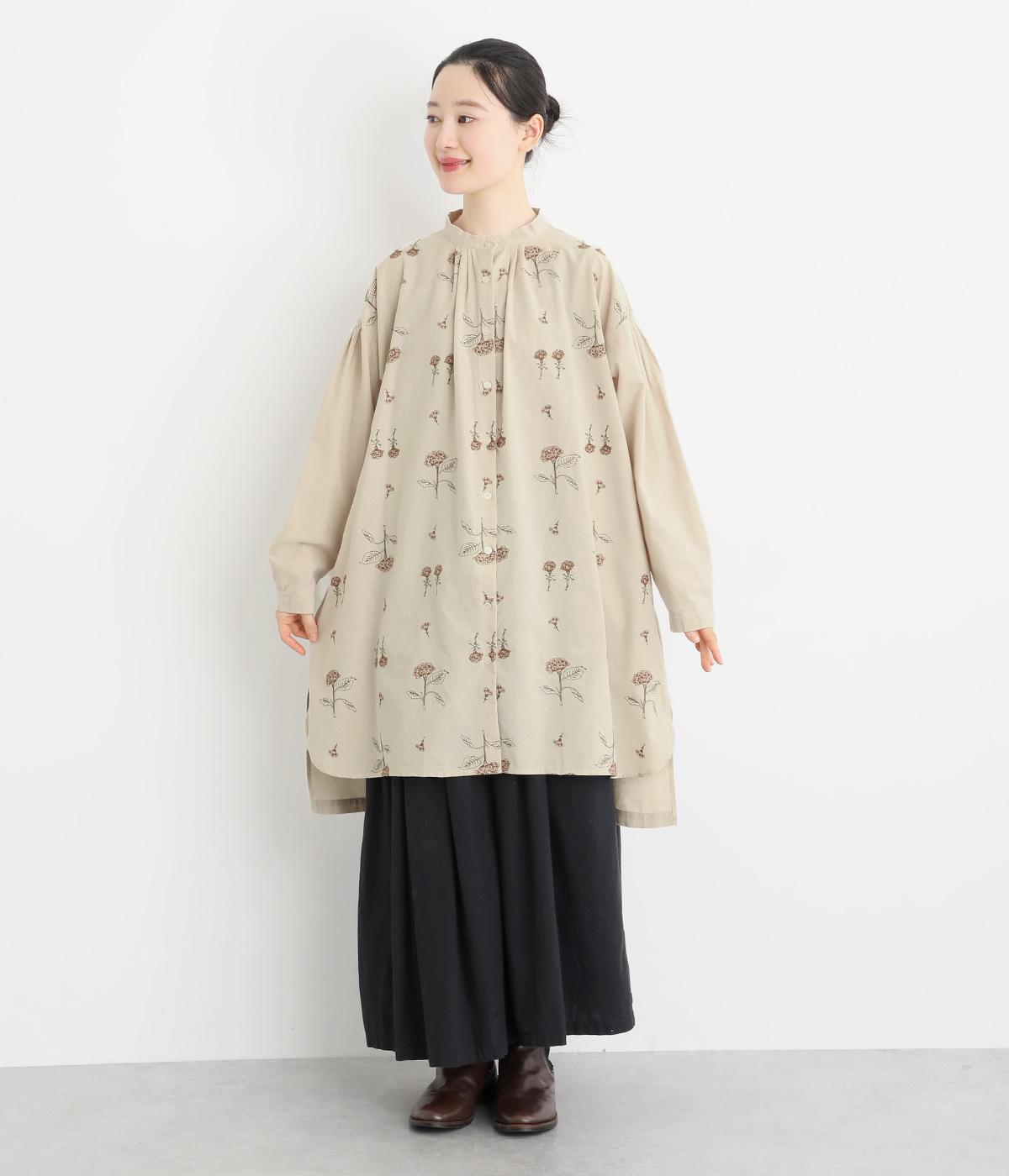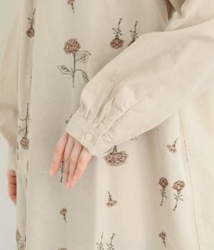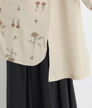 繊細なステッチの花柄刺繍を贅沢にあしらい、やさしい華やぎを添えた一枚。ドロップショルダーのリラックス感と、襟ぐりに入ったタックがつくるふんわりシルエットが魅力です。前後差のある丈感で、体のラインもさりげなくカバーします。袖と後ろ身頃は無地で仕立て、刺繍の美しさを引き立てました。