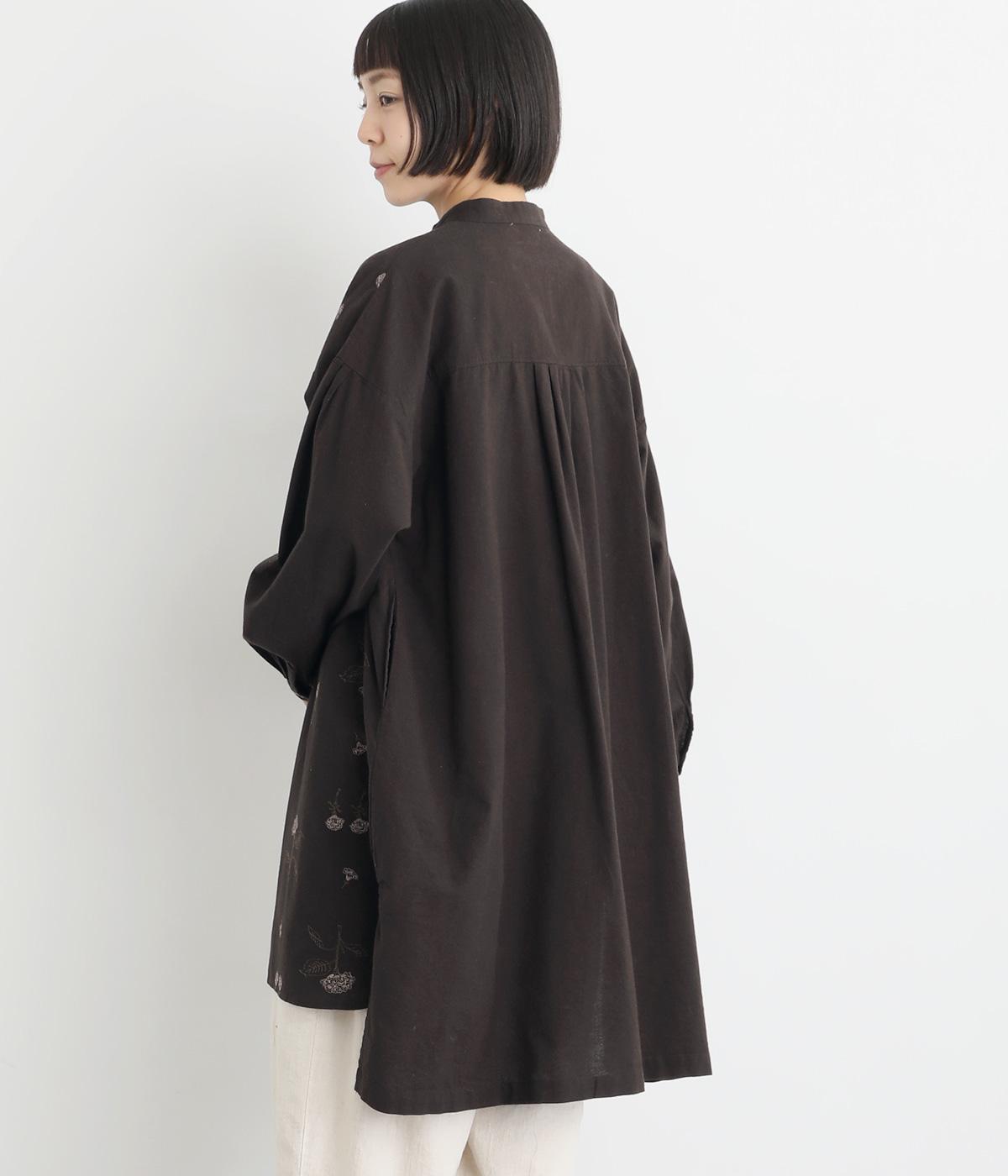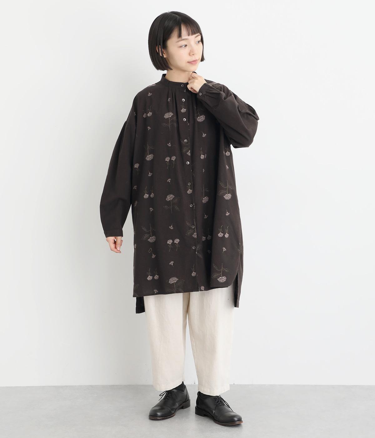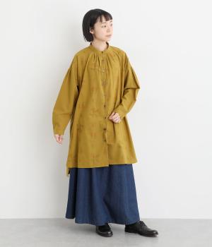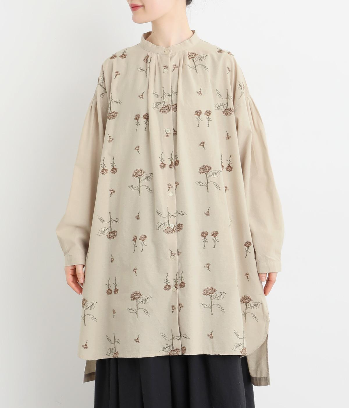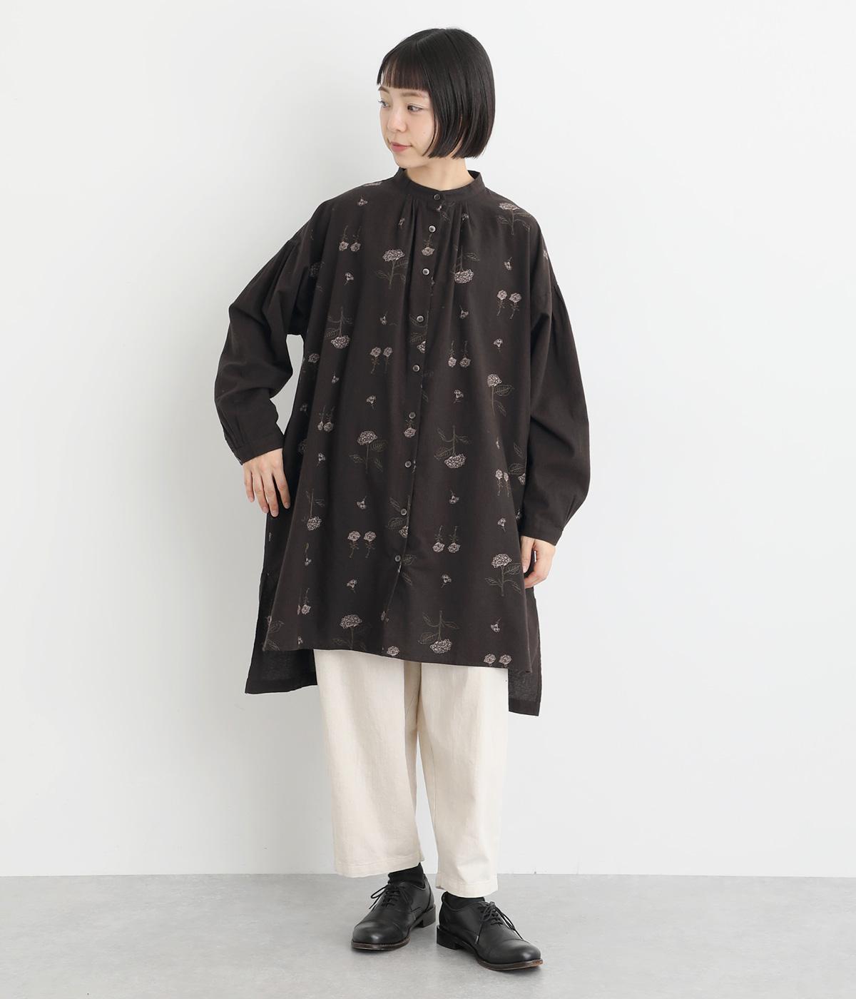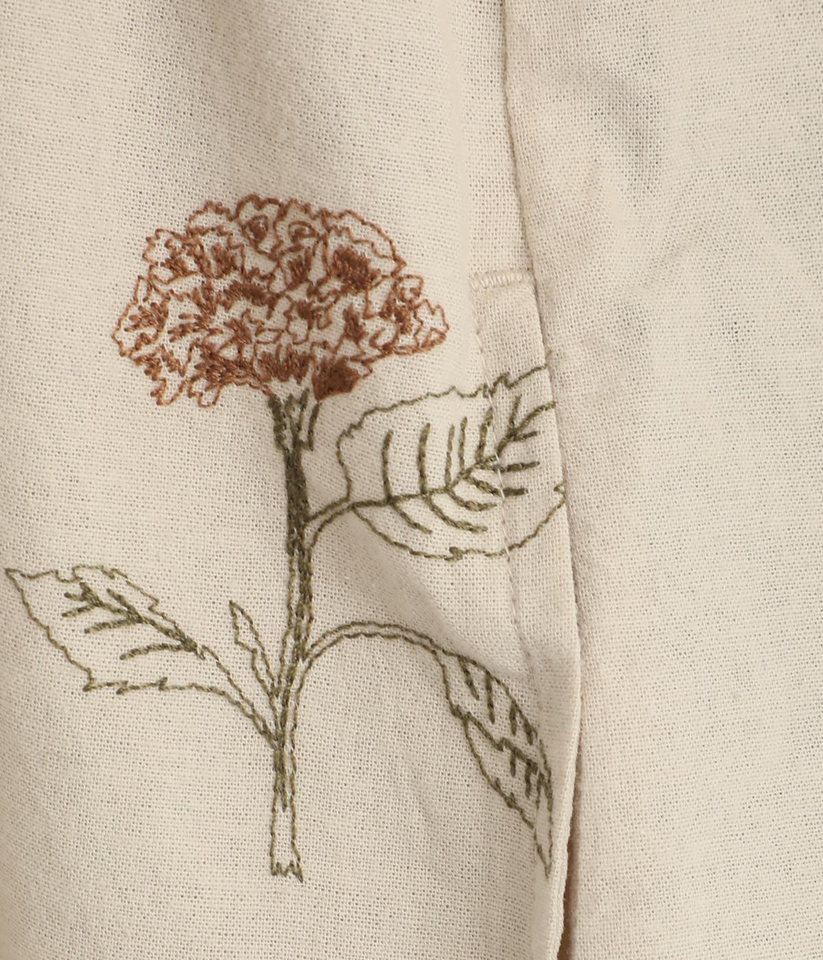 繊細なステッチの花柄刺繍を贅沢にあしらい、やさしい華やぎを添えた一枚。ドロップショルダーのリラックス感と、襟ぐりに入ったタックがつくるふんわりシルエットが魅力です。前後差のある丈感で、体のラインもさりげなくカバーします。袖と後ろ身頃は無地で仕立て、刺繍の美しさを引き立てました。