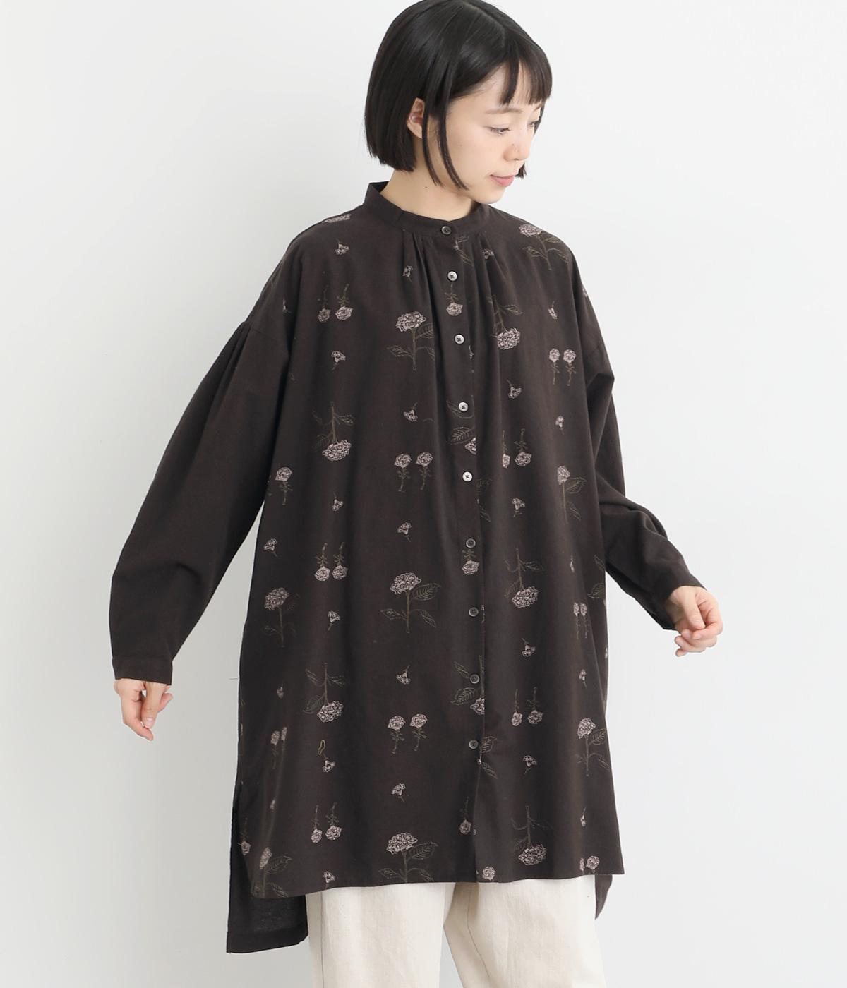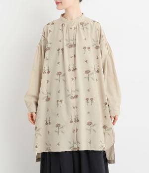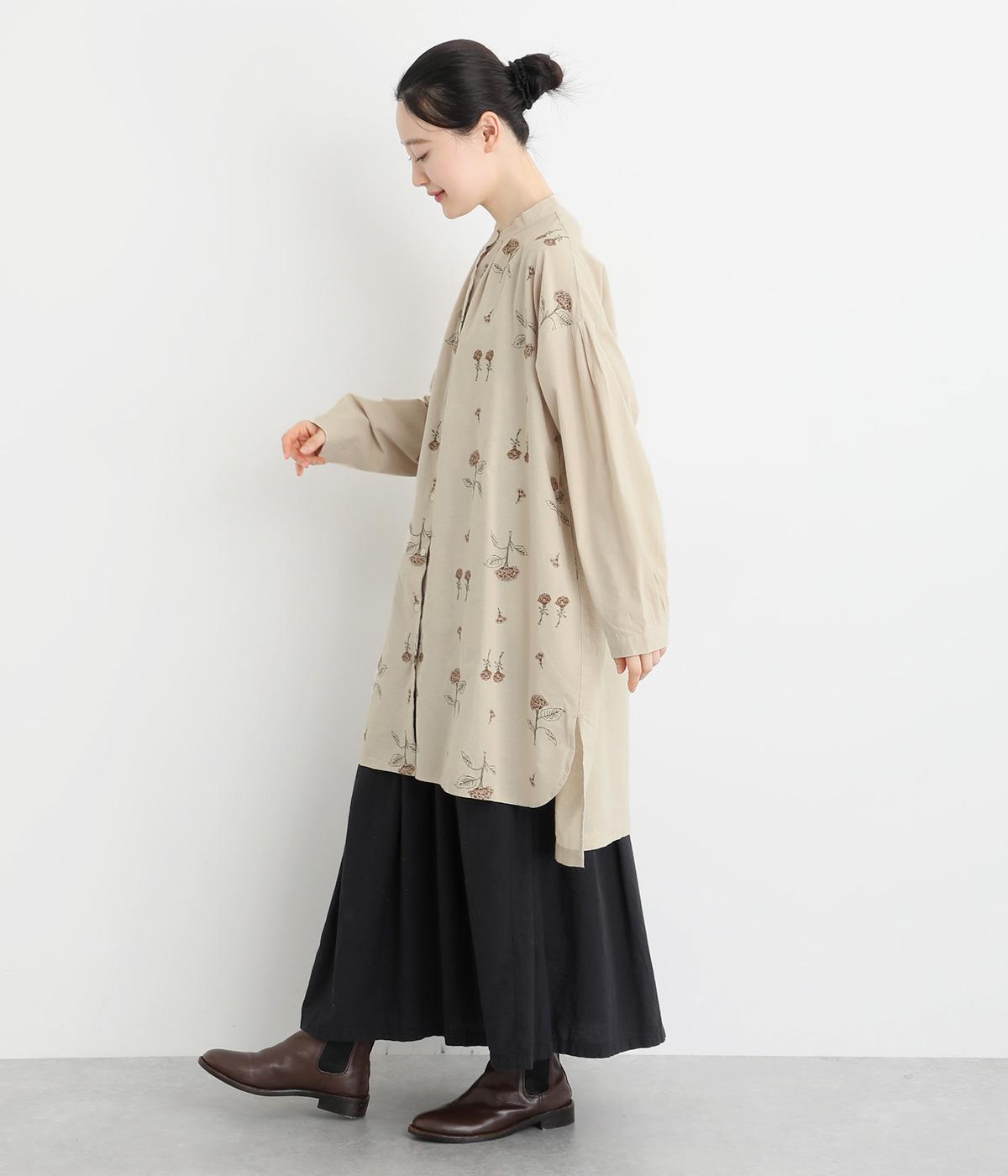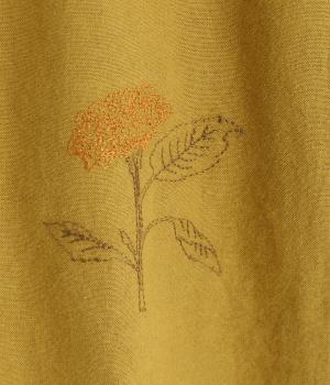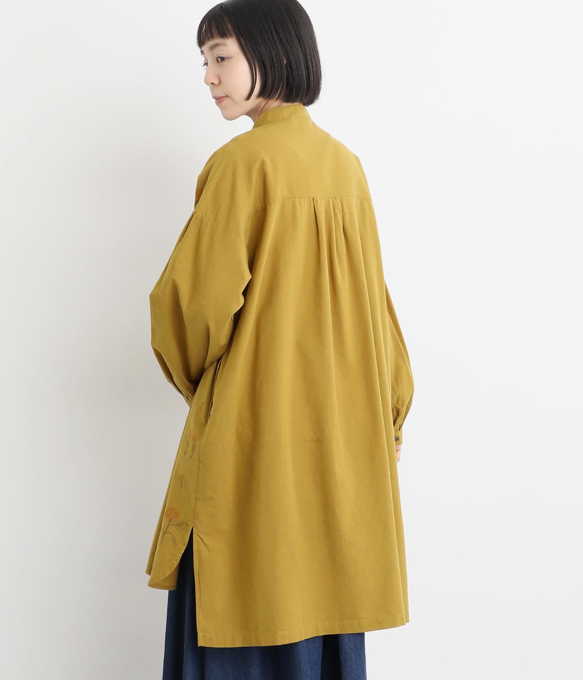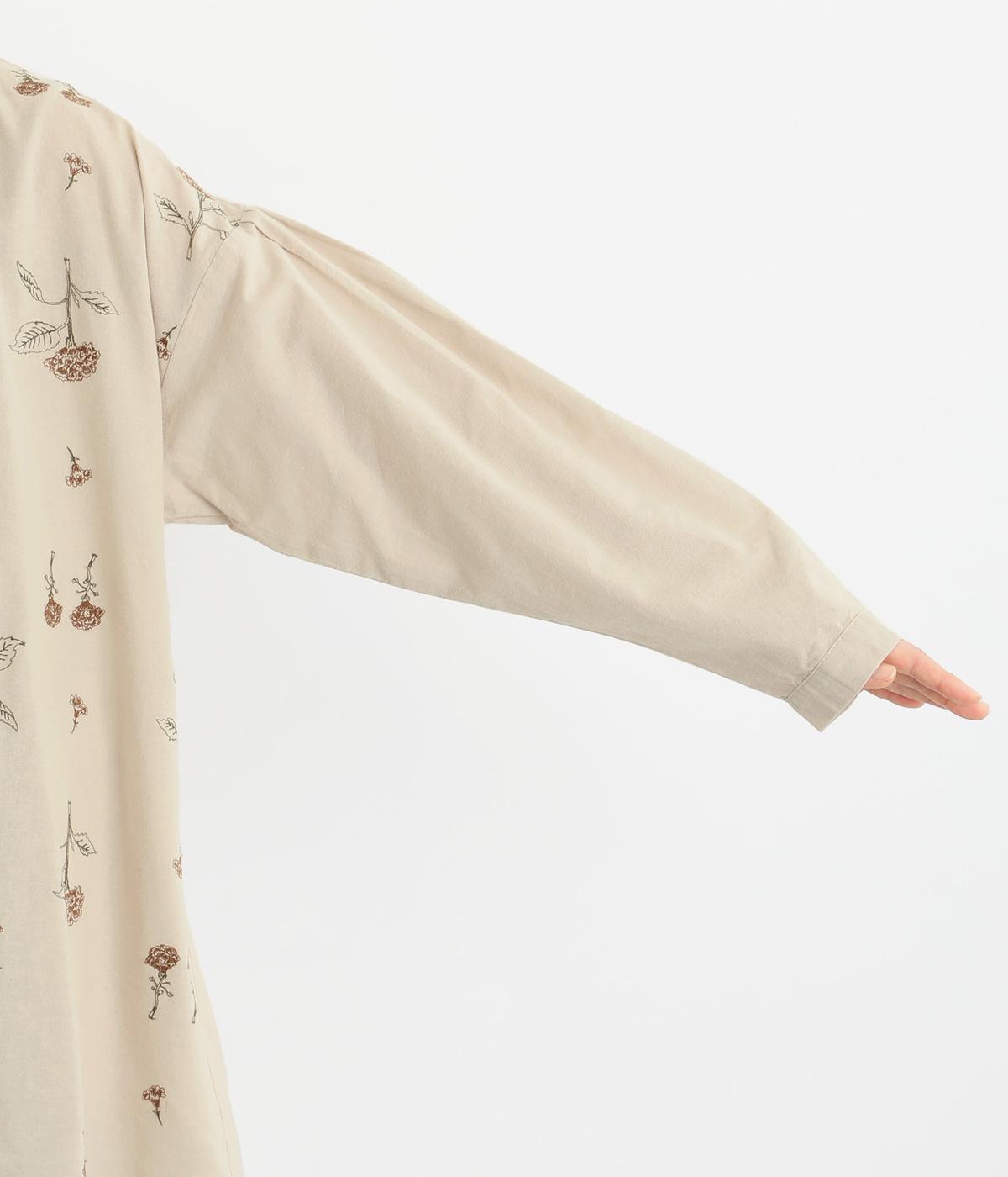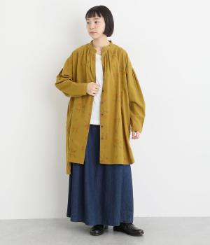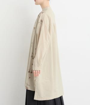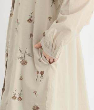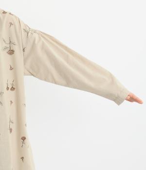 繊細なステッチの花柄刺繍を贅沢にあしらい、やさしい華やぎを添えた一枚。ドロップショルダーのリラックス感と、襟ぐりに入ったタックがつくるふんわりシルエットが魅力です。前後差のある丈感で、体のラインもさりげなくカバーします。袖と後ろ身頃は無地で仕立て、刺繍の美しさを引き立てました。