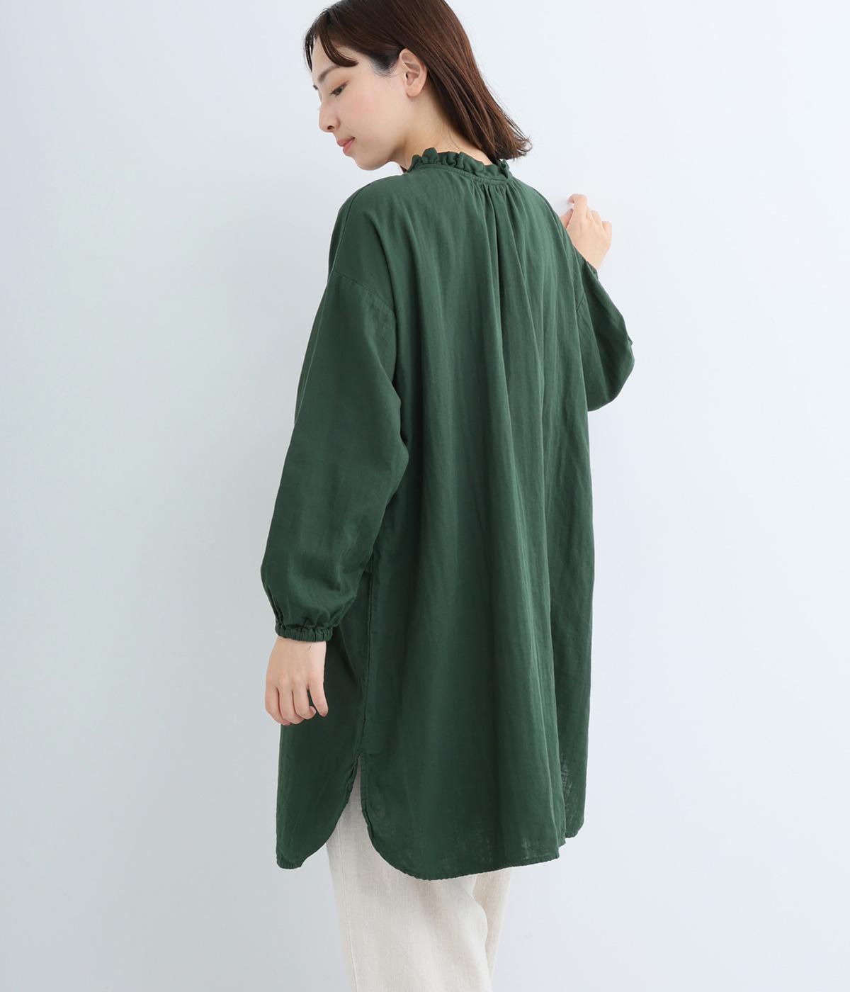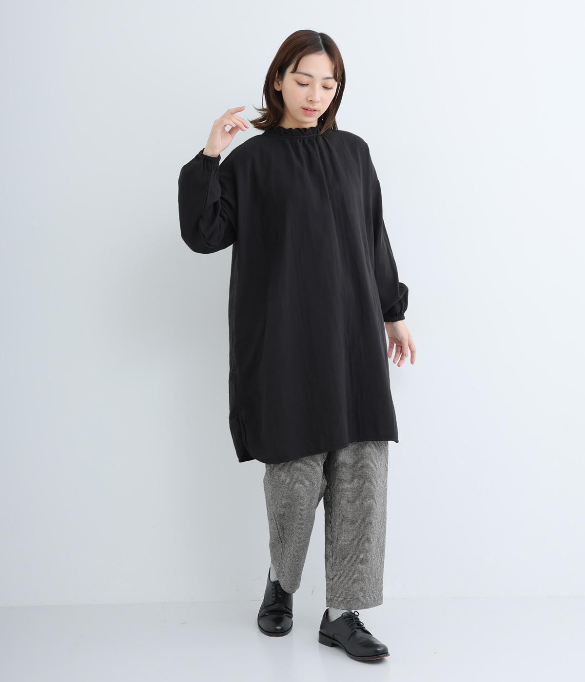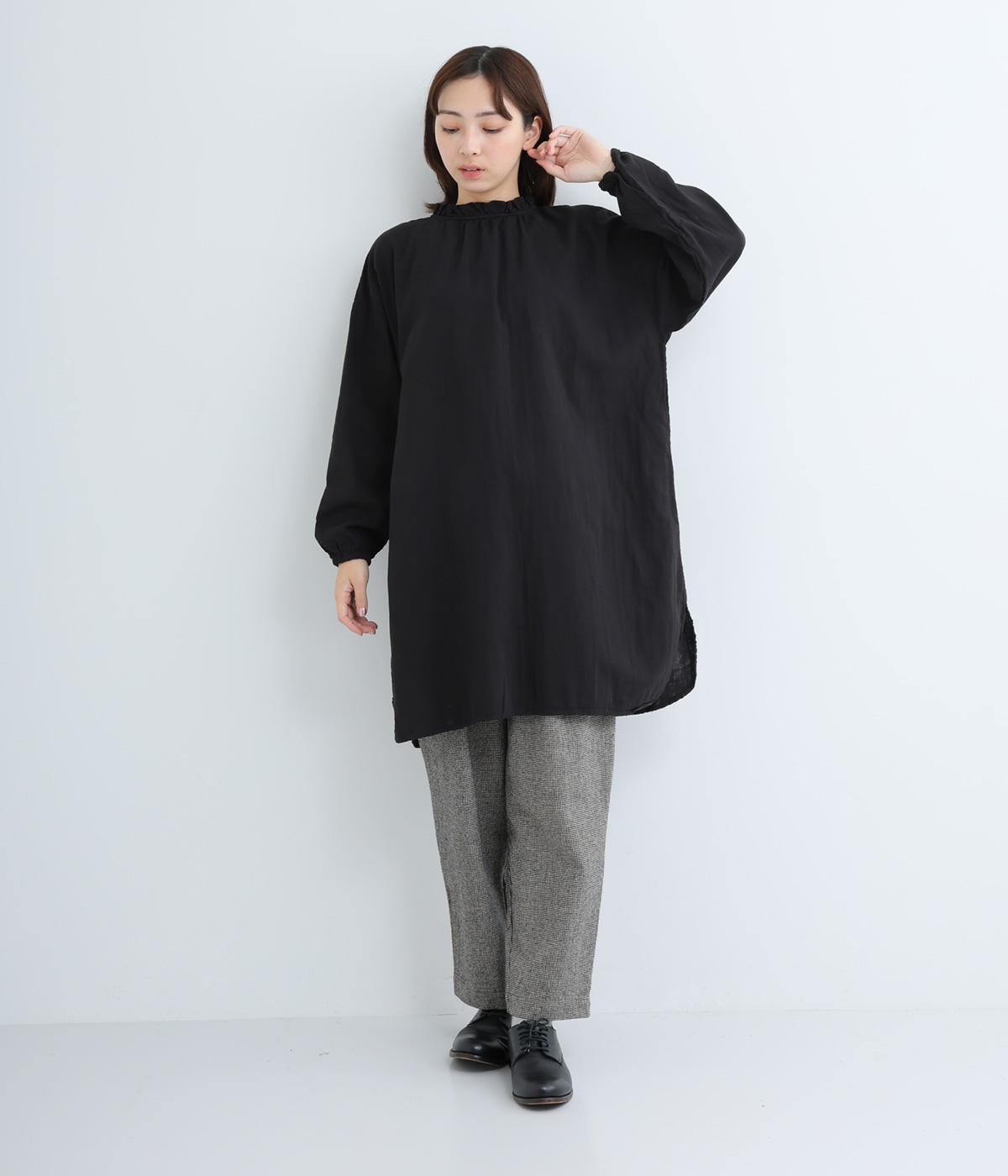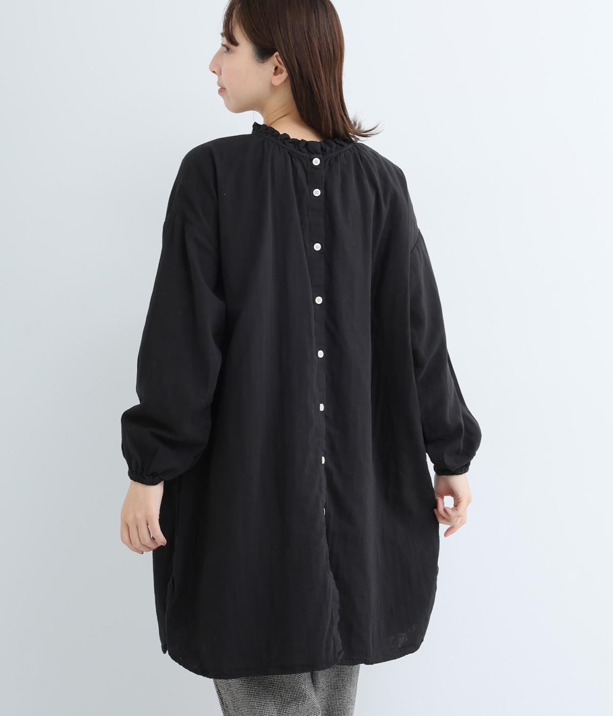 前後どちらを前にしても着用できる2way仕様のチュニックシャツ。エレガントで上品な印象のフリルネックがポイントです。サイドスリットで抜け感を出しました。気になるヒップや太ももまわりを覆ってくれる丈感なので、きれいなシルエットが実現します。
