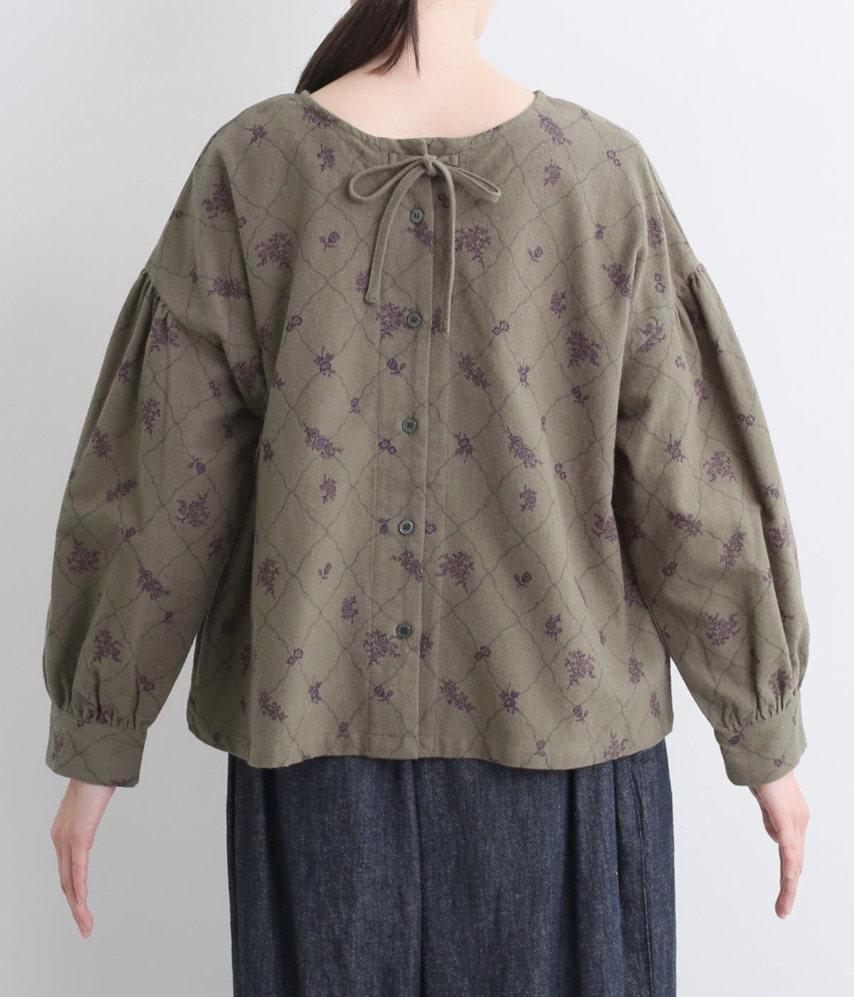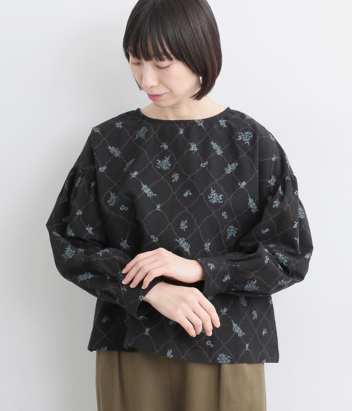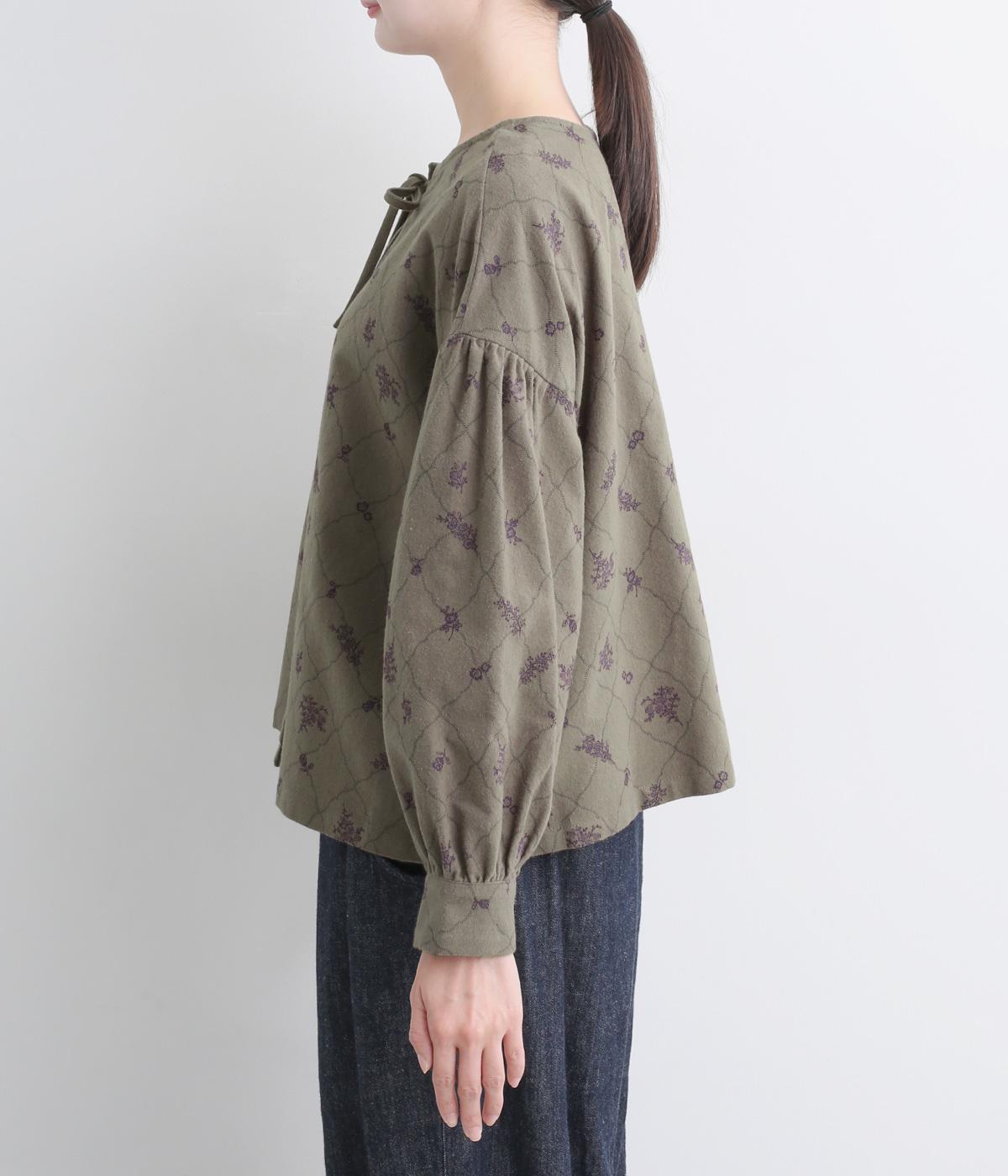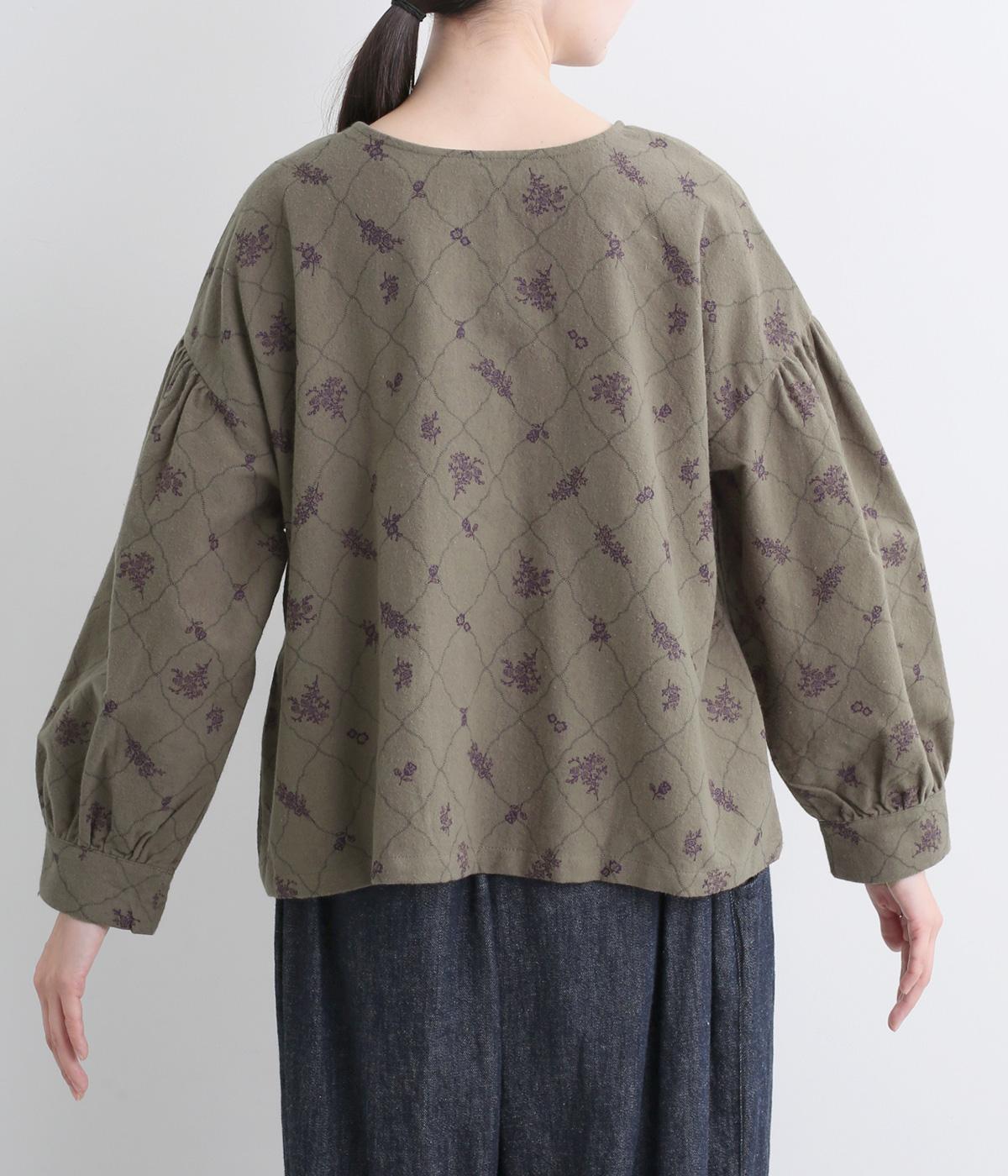前後で着用できる2way仕様のブラウスです。レトロな雰囲気の総柄プリントが落ち着いた表情に仕上げています。ギャザーをほどこし、ふんわりとした袖のシルエットが華やかさをプラス。ゆったりした身幅とほどよい丈感でさまざまなボトムスと合わせられます。