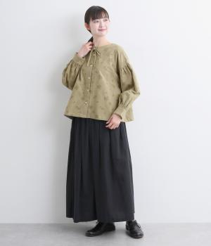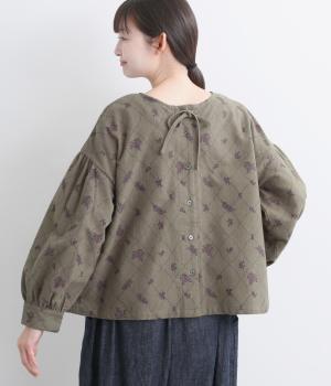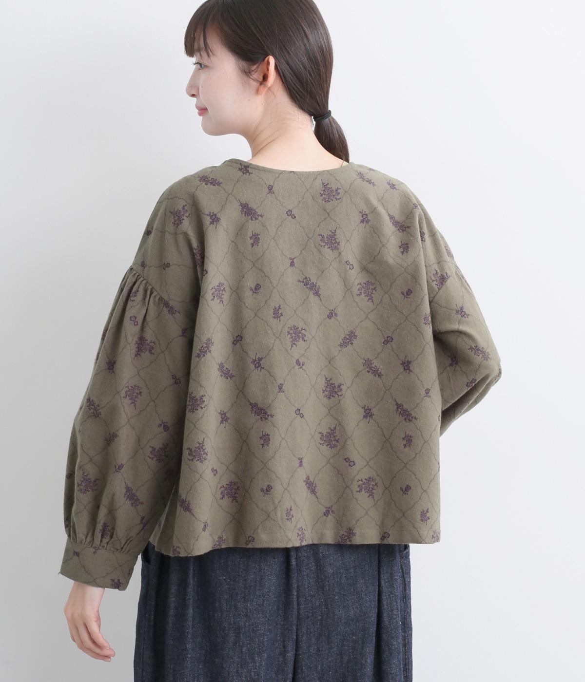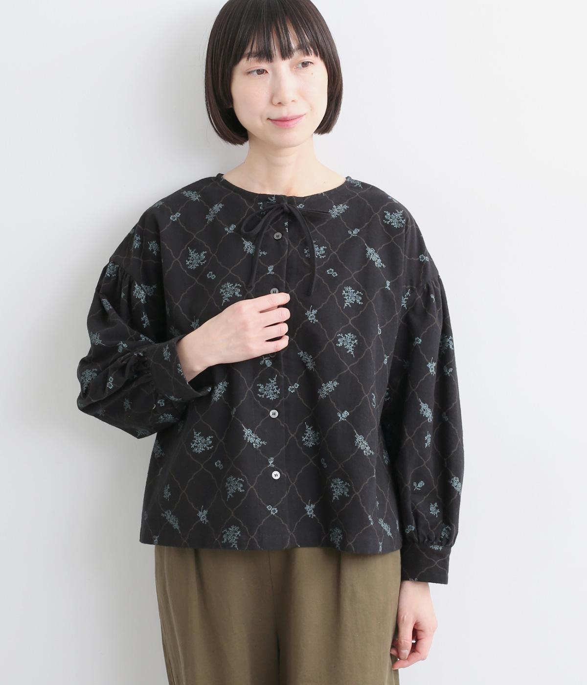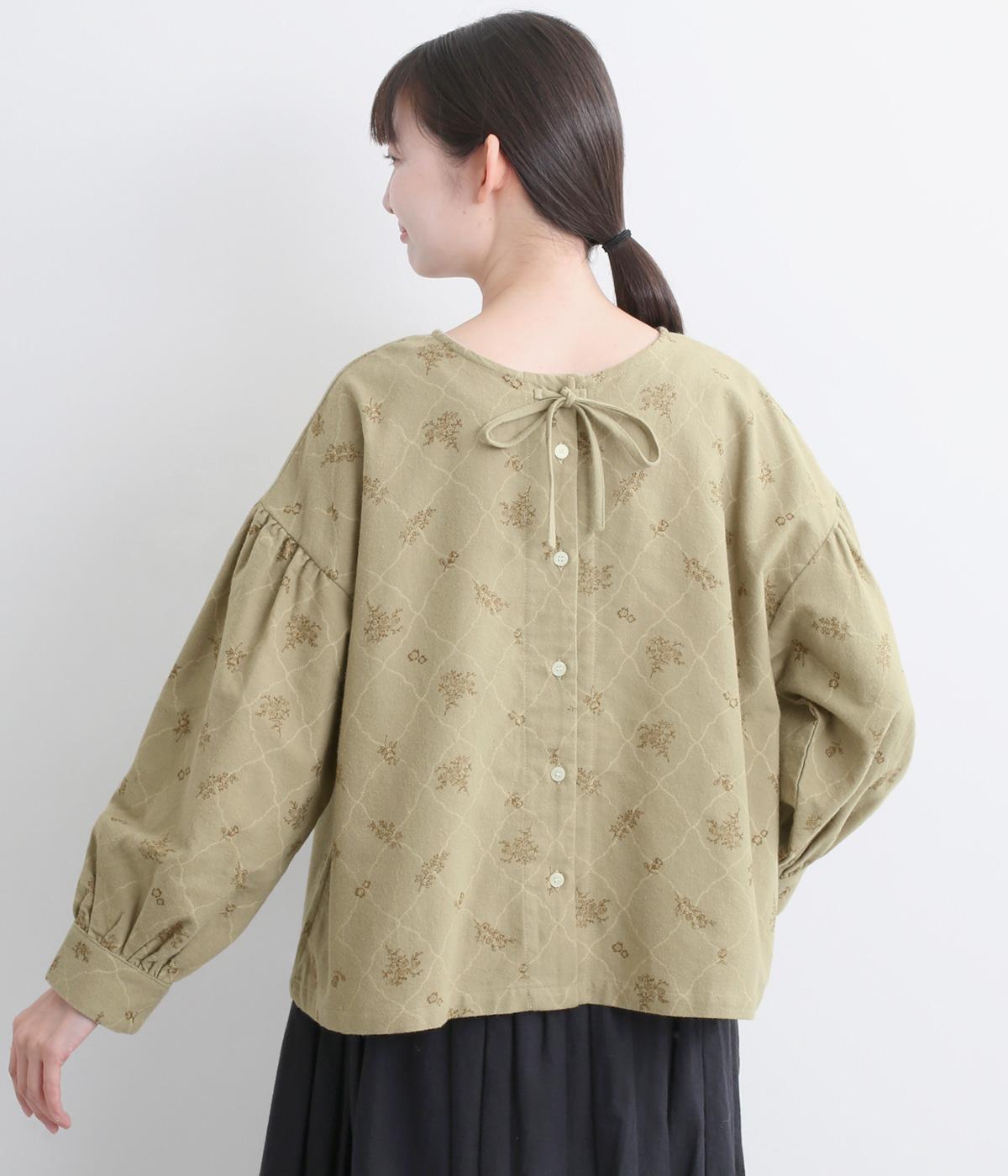 前後で着用できる2way仕様のブラウスです。レトロな雰囲気の総柄プリントが落ち着いた表情に仕上げています。ギャザーをほどこし、ふんわりとした袖のシルエットが華やかさをプラス。ゆったりした身幅とほどよい丈感でさまざまなボトムスと合わせられます。