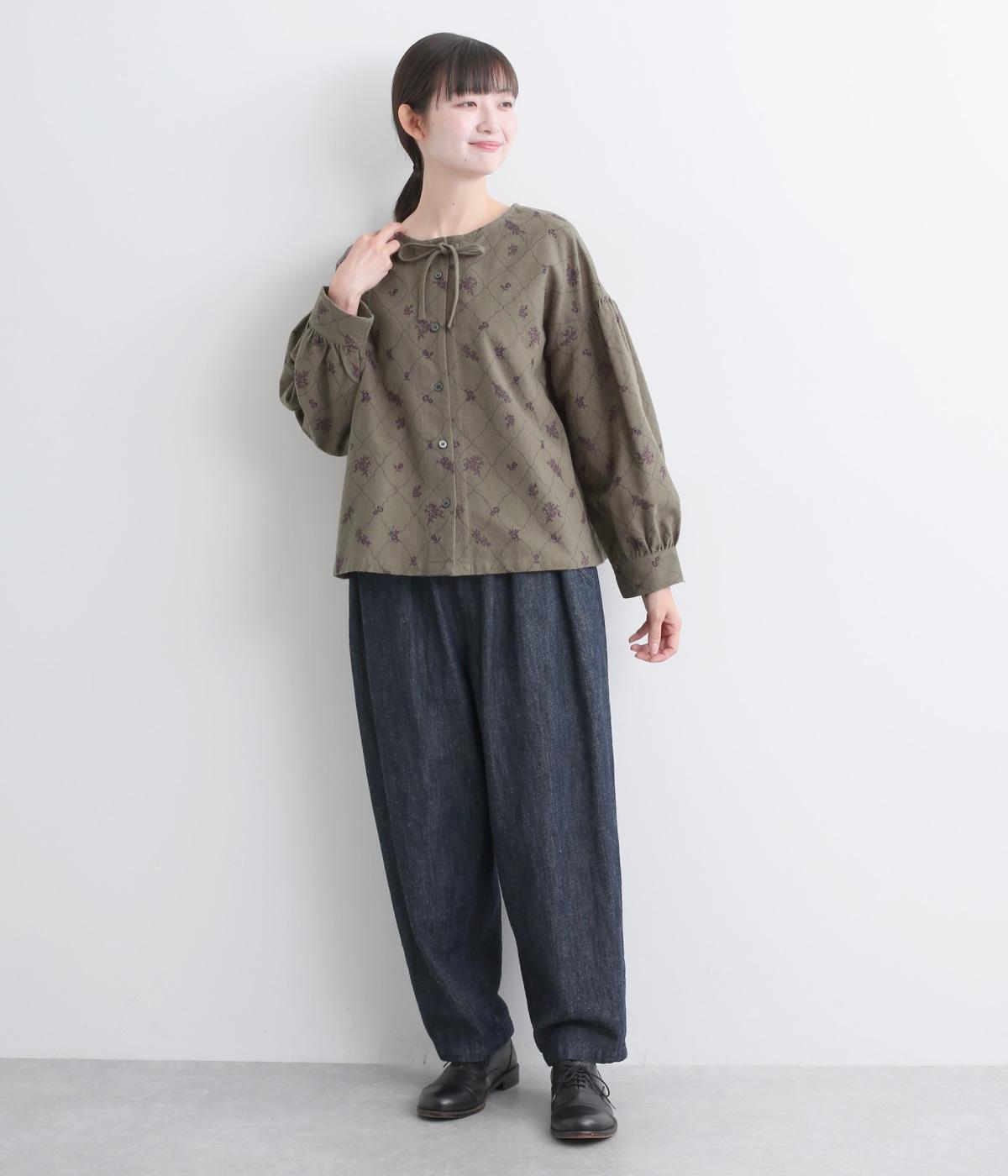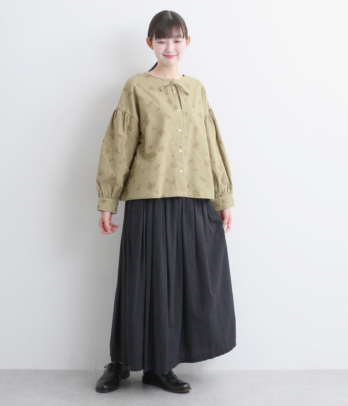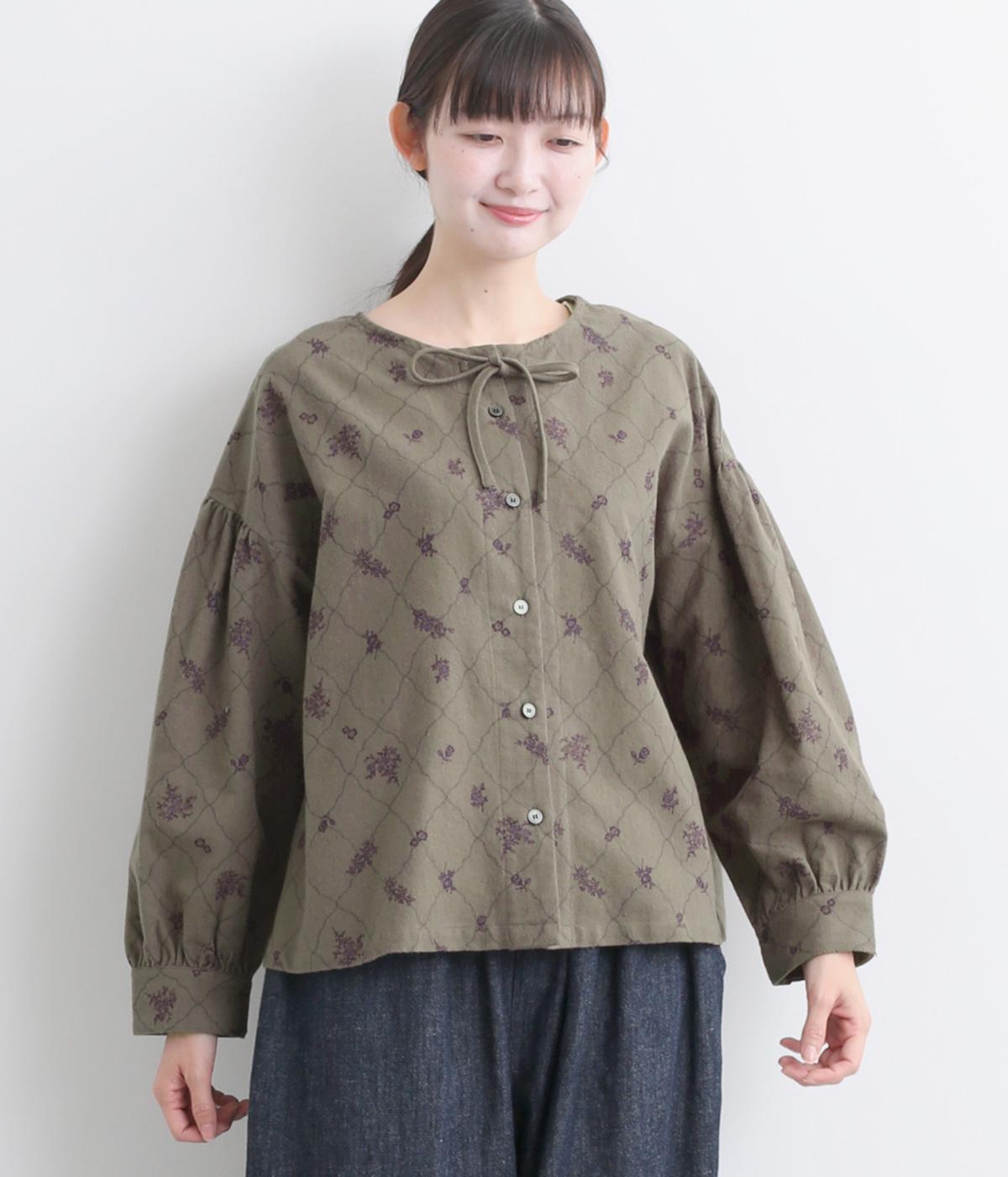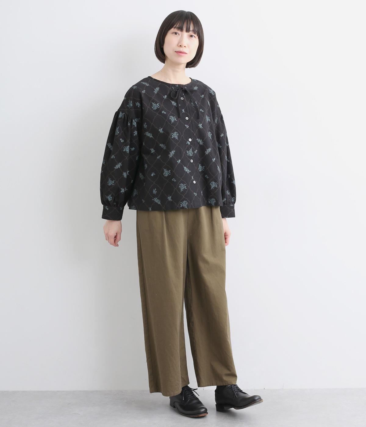 前後で着用できる2way仕様のブラウスです。レトロな雰囲気の総柄プリントが落ち着いた表情に仕上げています。ギャザーをほどこし、ふんわりとした袖のシルエットが華やかさをプラス。ゆったりした身幅とほどよい丈感でさまざまなボトムスと合わせられます。
