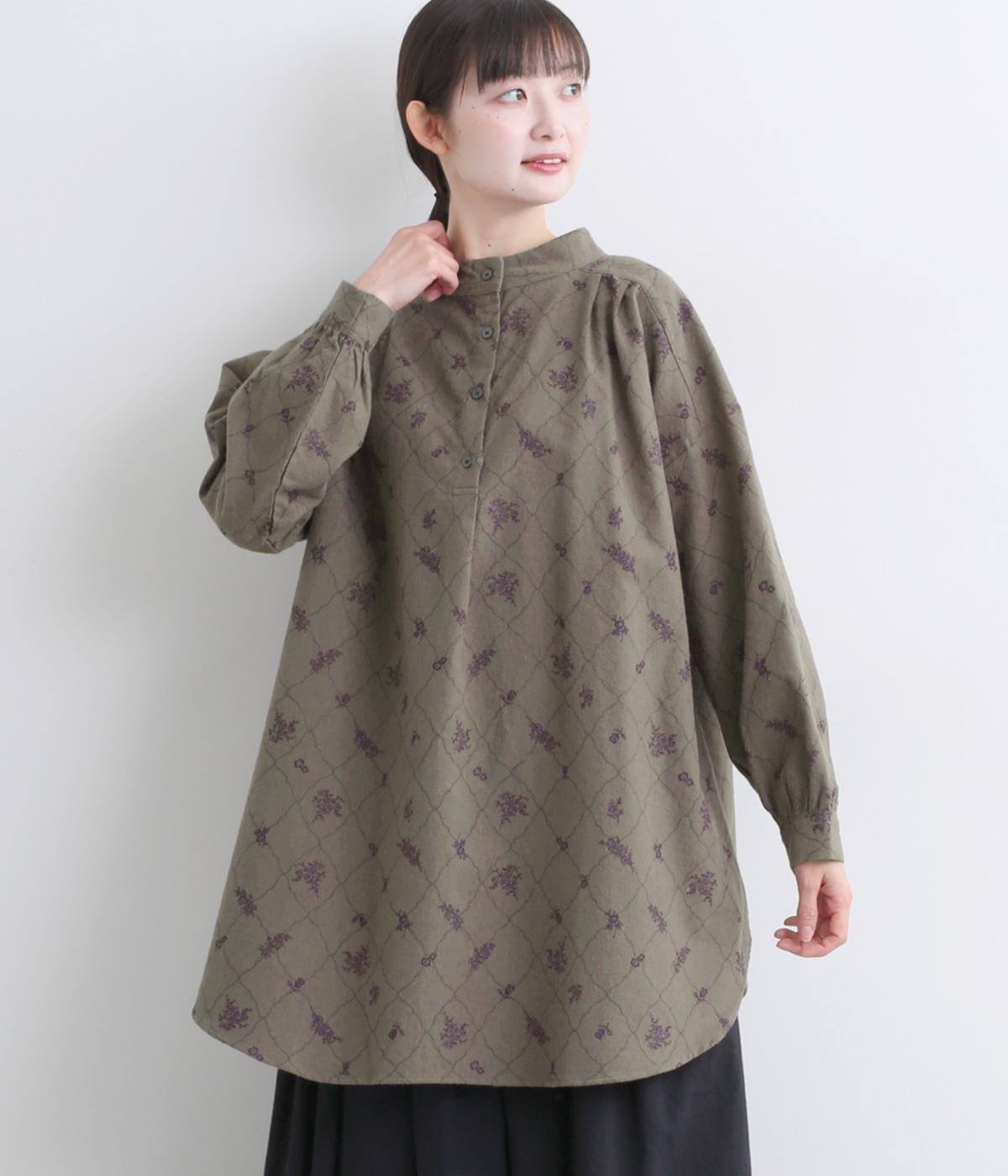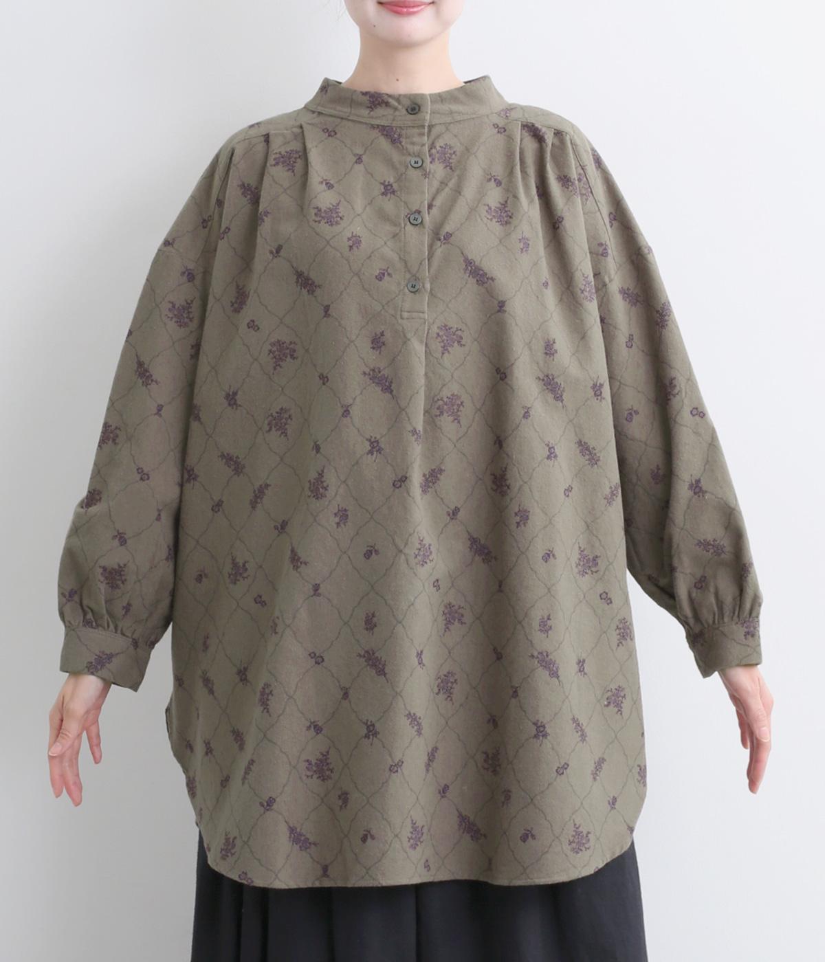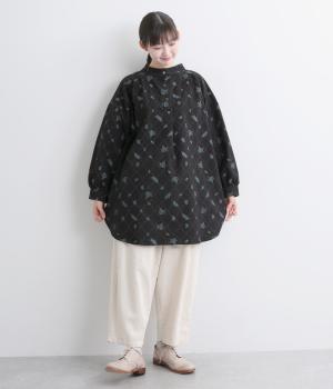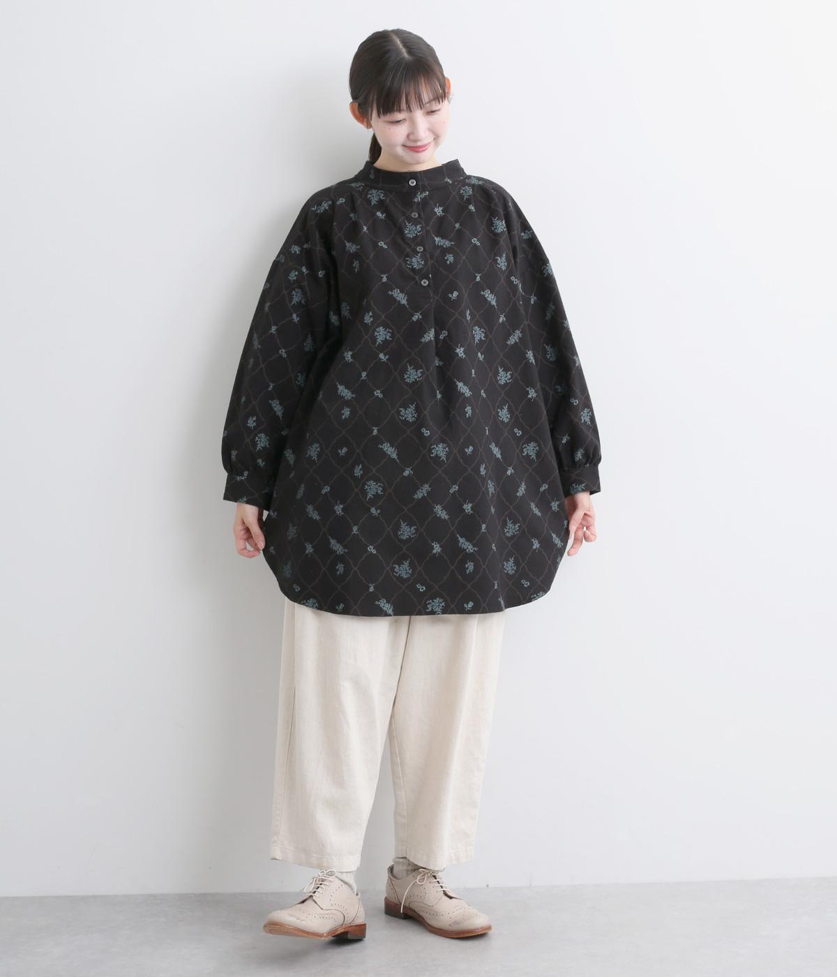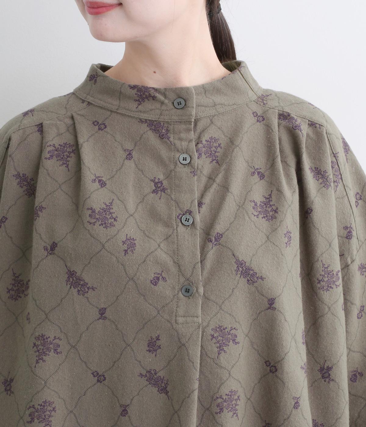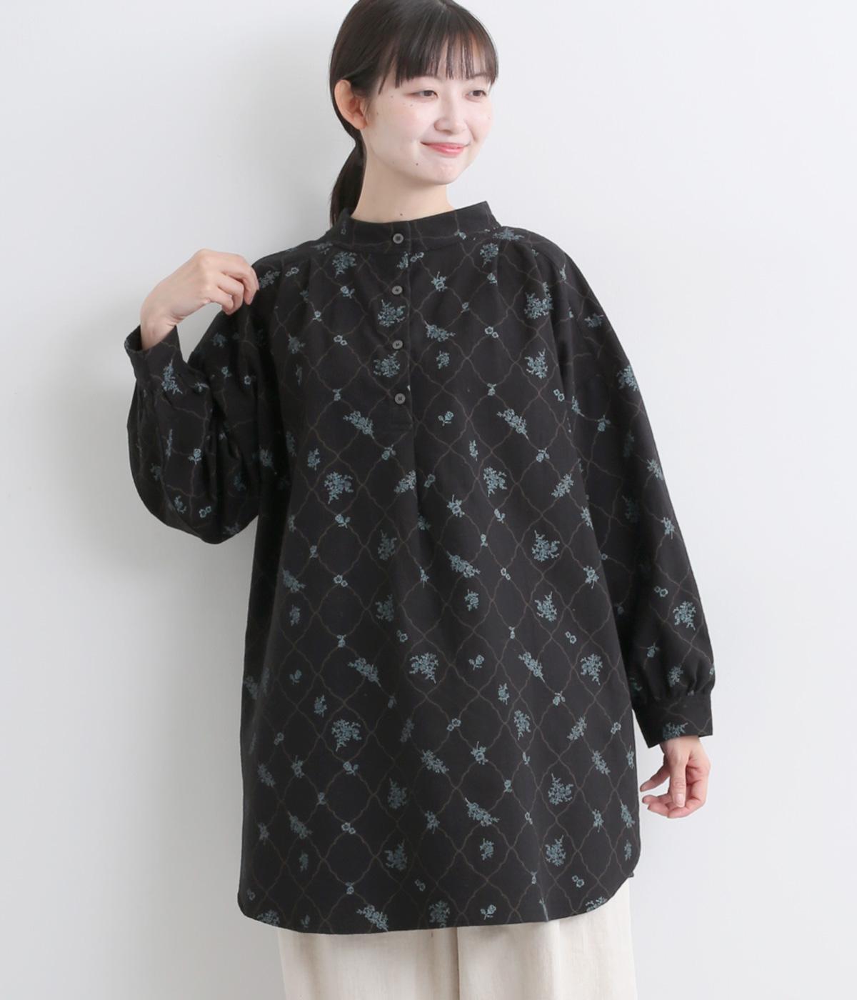 丸みをつけた裾のラインがかわいらしいニュアンスを添えるチュニックブラウス。レトロな雰囲気の総柄プリントが落ち着いた表情に仕上げています。ゆったりとしたシルエットに首元はスタンドカラーですっきりさせました。