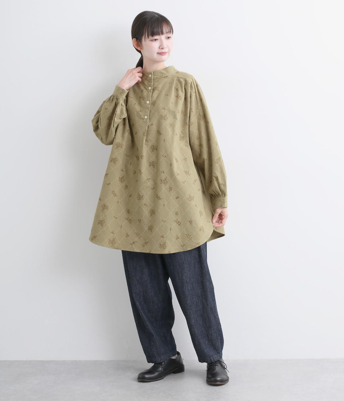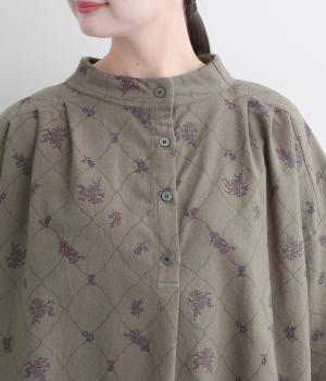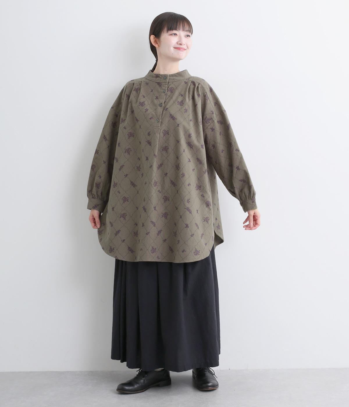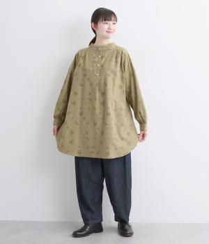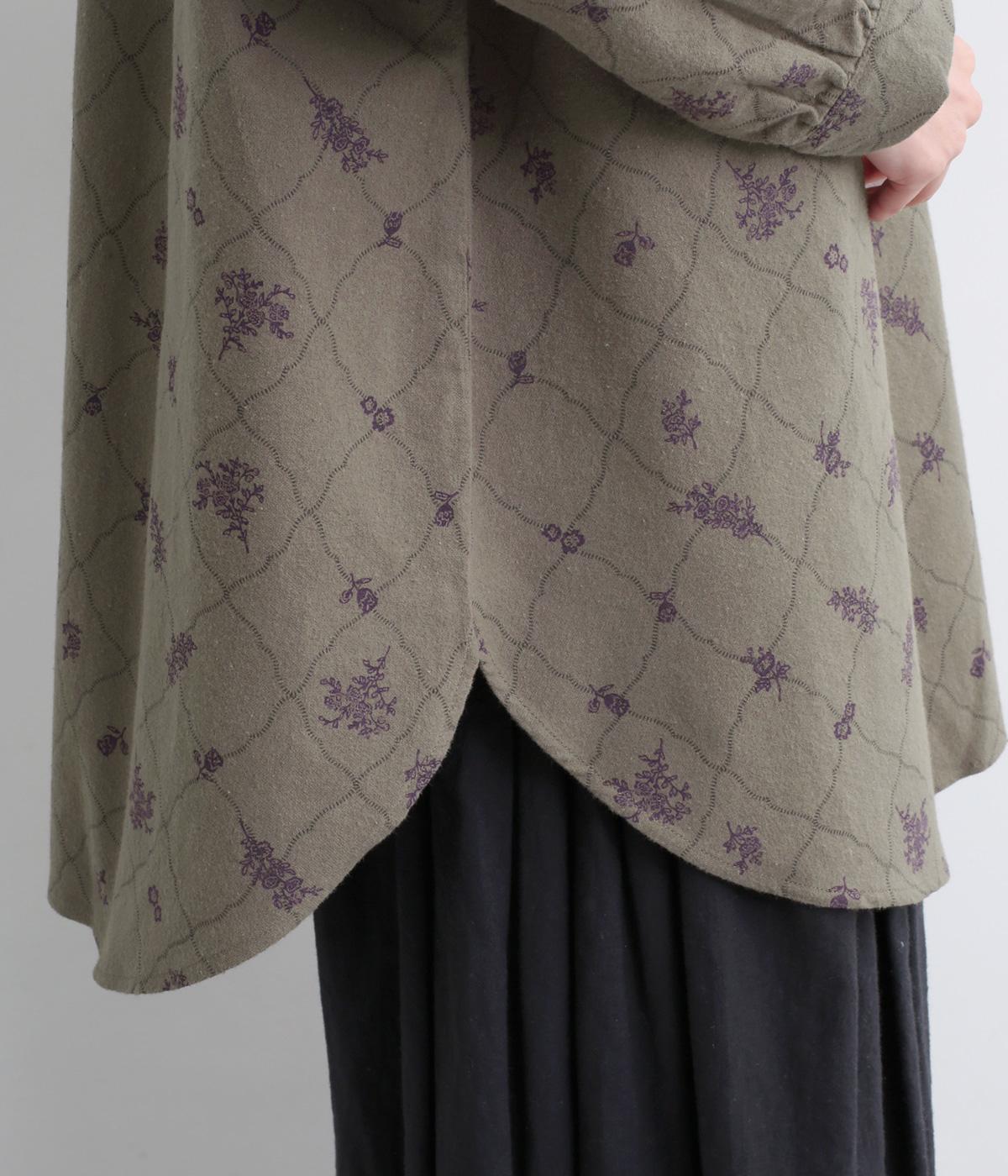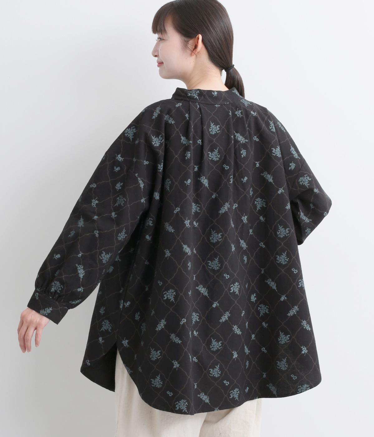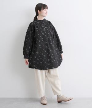 丸みをつけた裾のラインがかわいらしいニュアンスを添えるチュニックブラウス。レトロな雰囲気の総柄プリントが落ち着いた表情に仕上げています。ゆったりとしたシルエットに首元はスタンドカラーですっきりさせました。