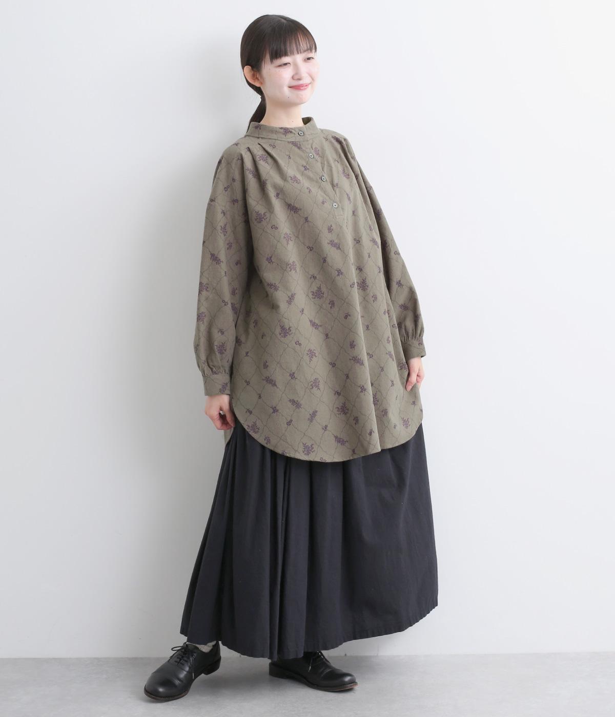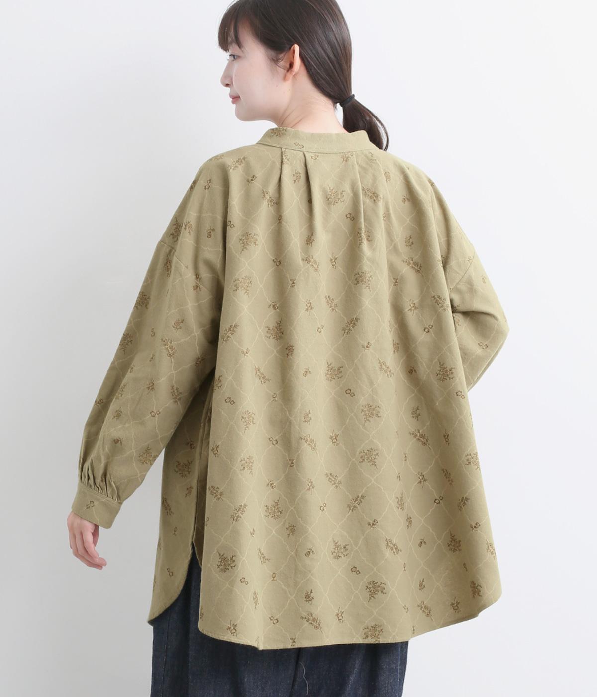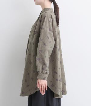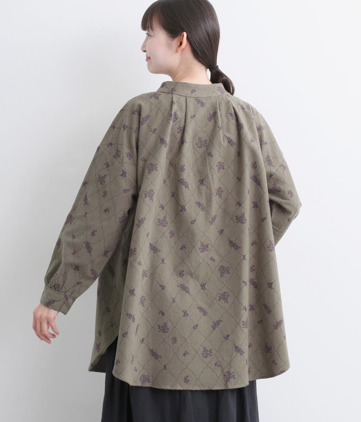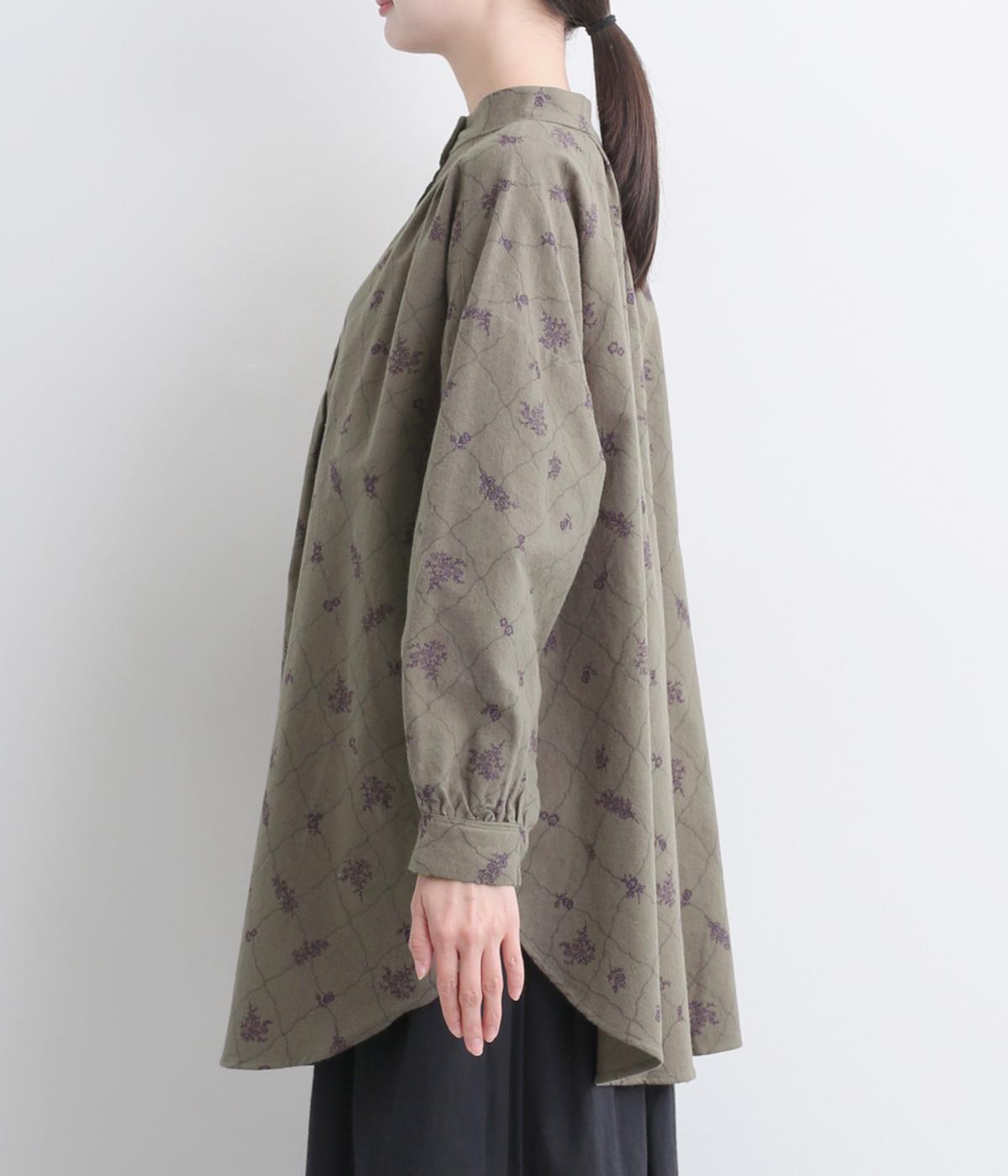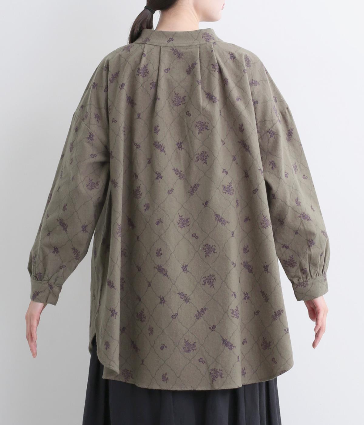 丸みをつけた裾のラインがかわいらしいニュアンスを添えるチュニックブラウス。レトロな雰囲気の総柄プリントが落ち着いた表情に仕上げています。ゆったりとしたシルエットに首元はスタンドカラーですっきりさせました。