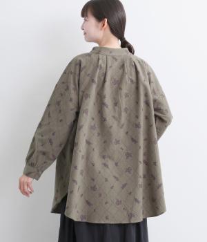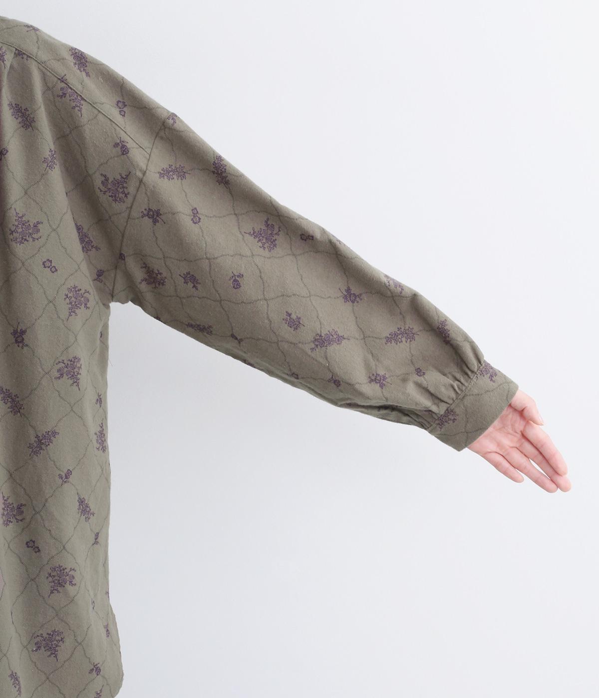 しっかりとした生地感ながら肌になじむコットン素材です。素朴で優しい風合いにシックな総柄プリントをほどこしました。ハリのある生地感がきちんと見えします。