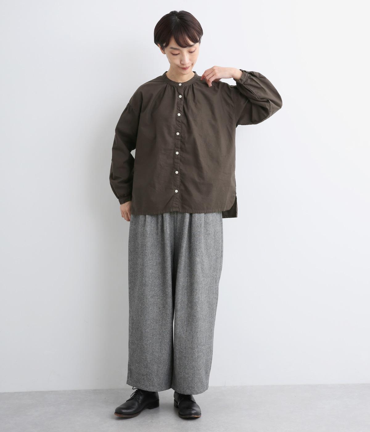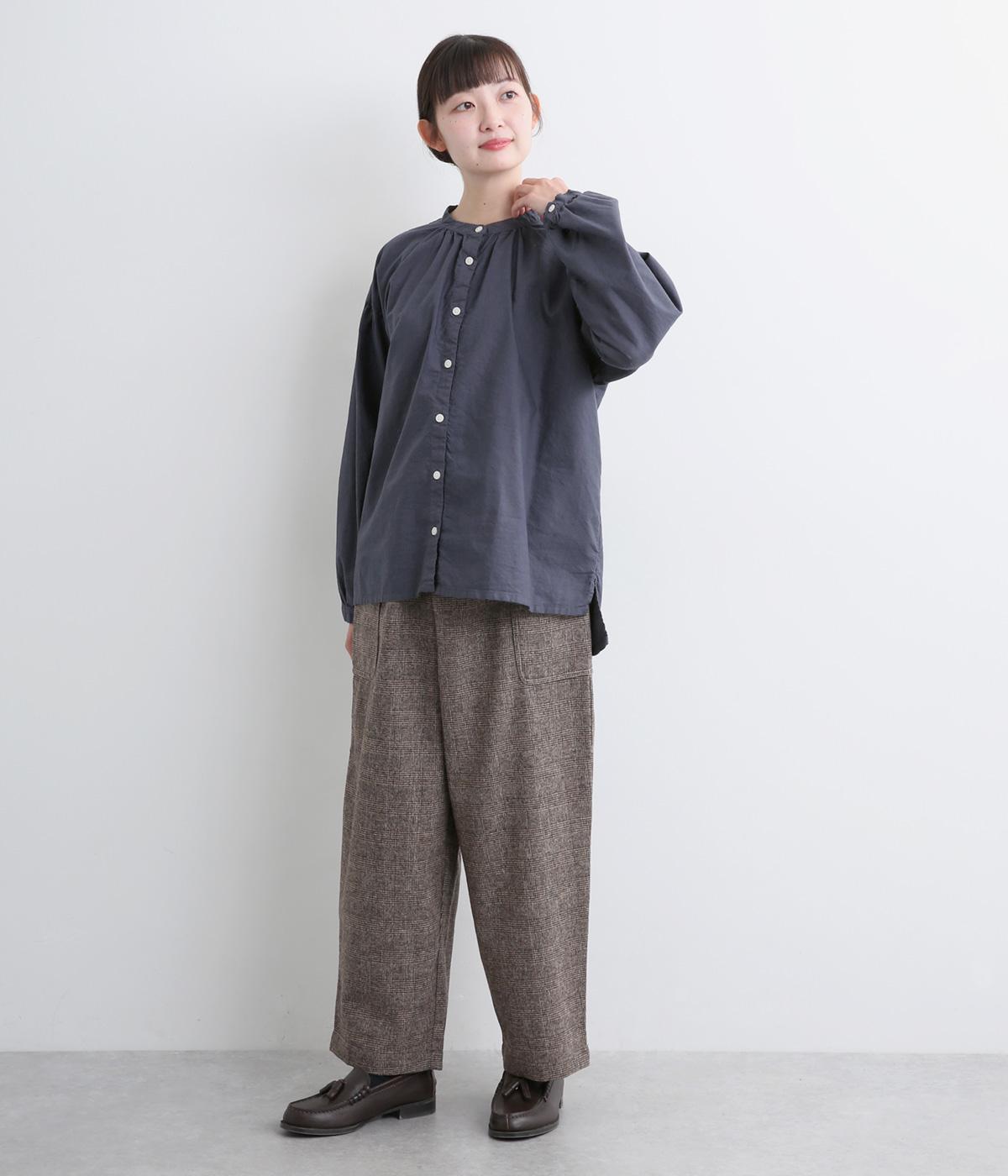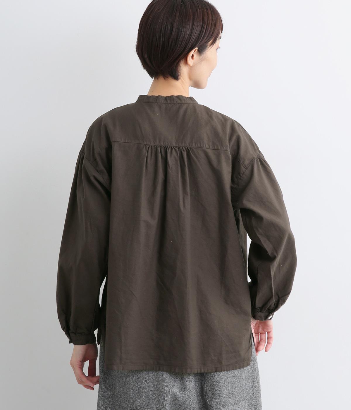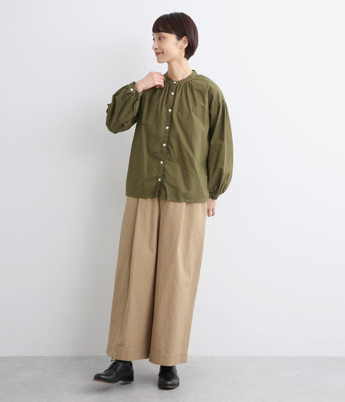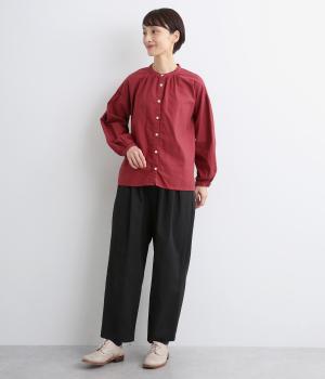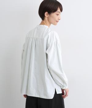 きちんと感漂うバンドカラーブラウスの前ネックや後ろヨーク、袖にギャザーを施して甘さを加えました。ふんわりとしたシルエットが体のラインをカバーしてくれます。着丈に前後差をつけて裾にはサイドスリットを入れ、美しい横姿に。羽織りとして活用するのもおすすめです。