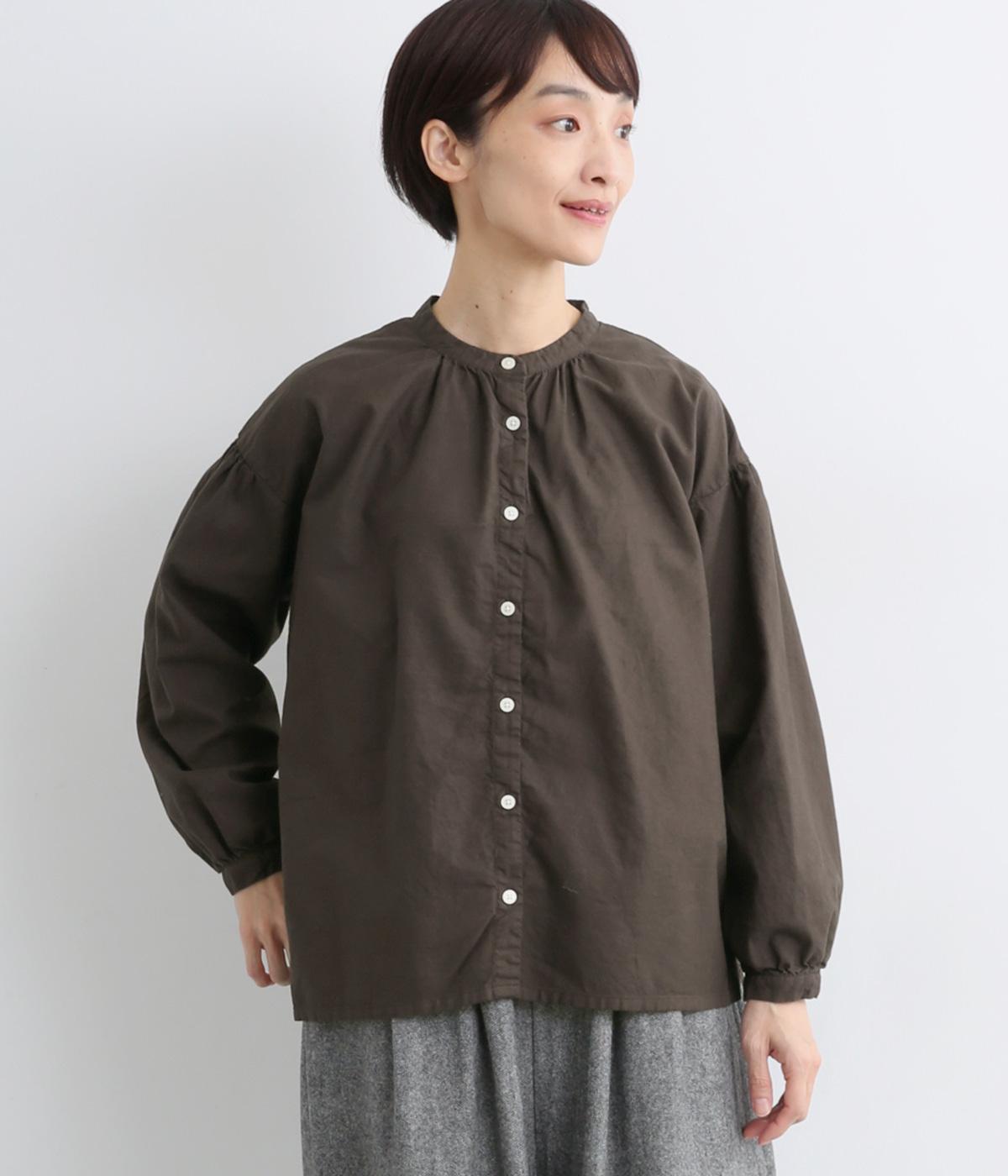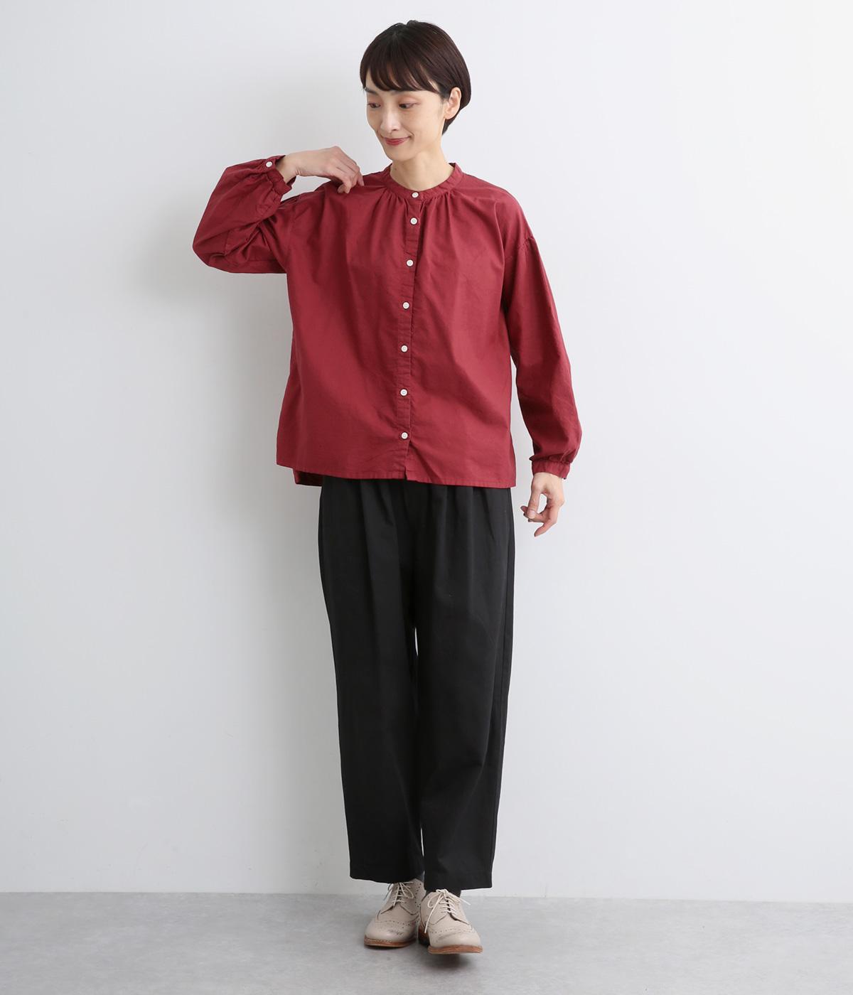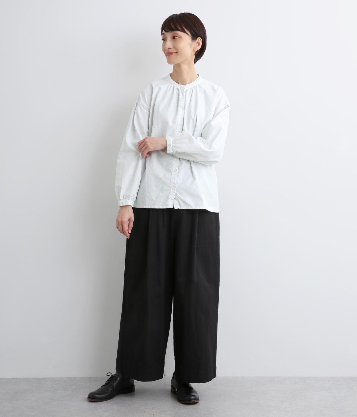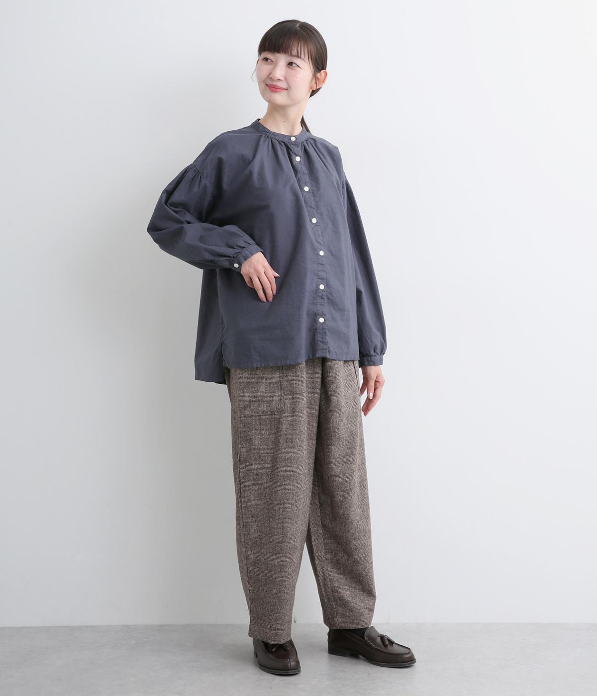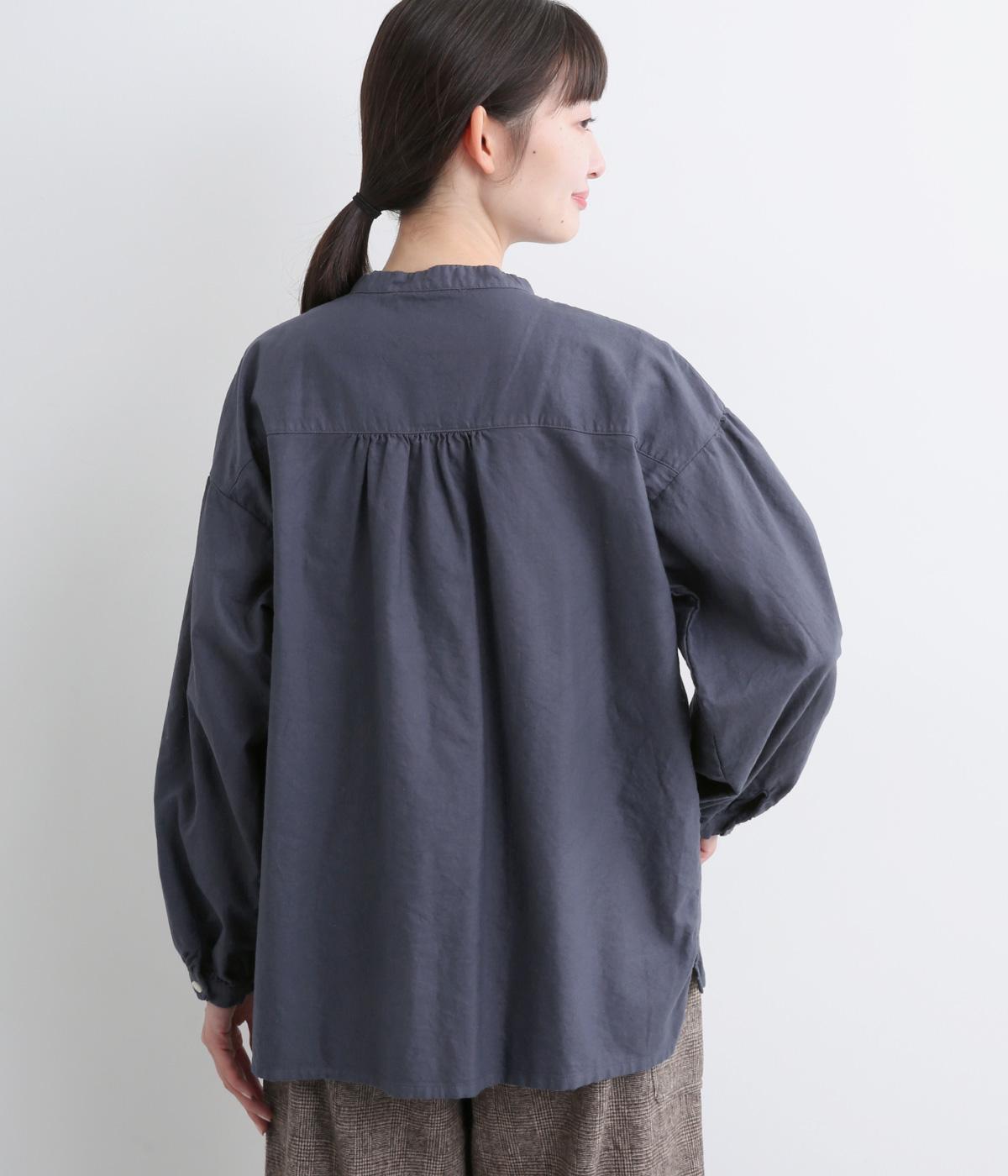 きちんと感漂うバンドカラーブラウスの前ネックや後ろヨーク、袖にギャザーを施して甘さを加えました。ふんわりとしたシルエットが体のラインをカバーしてくれます。着丈に前後差をつけて裾にはサイドスリットを入れ、美しい横姿に。羽織りとして活用するのもおすすめです。